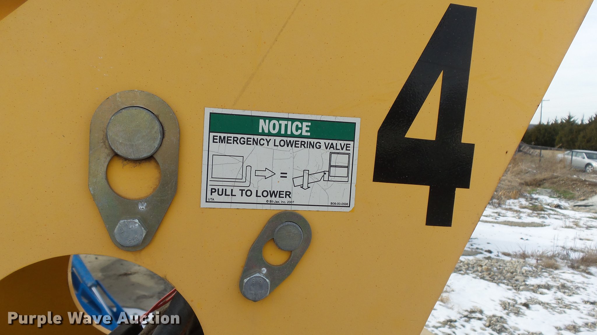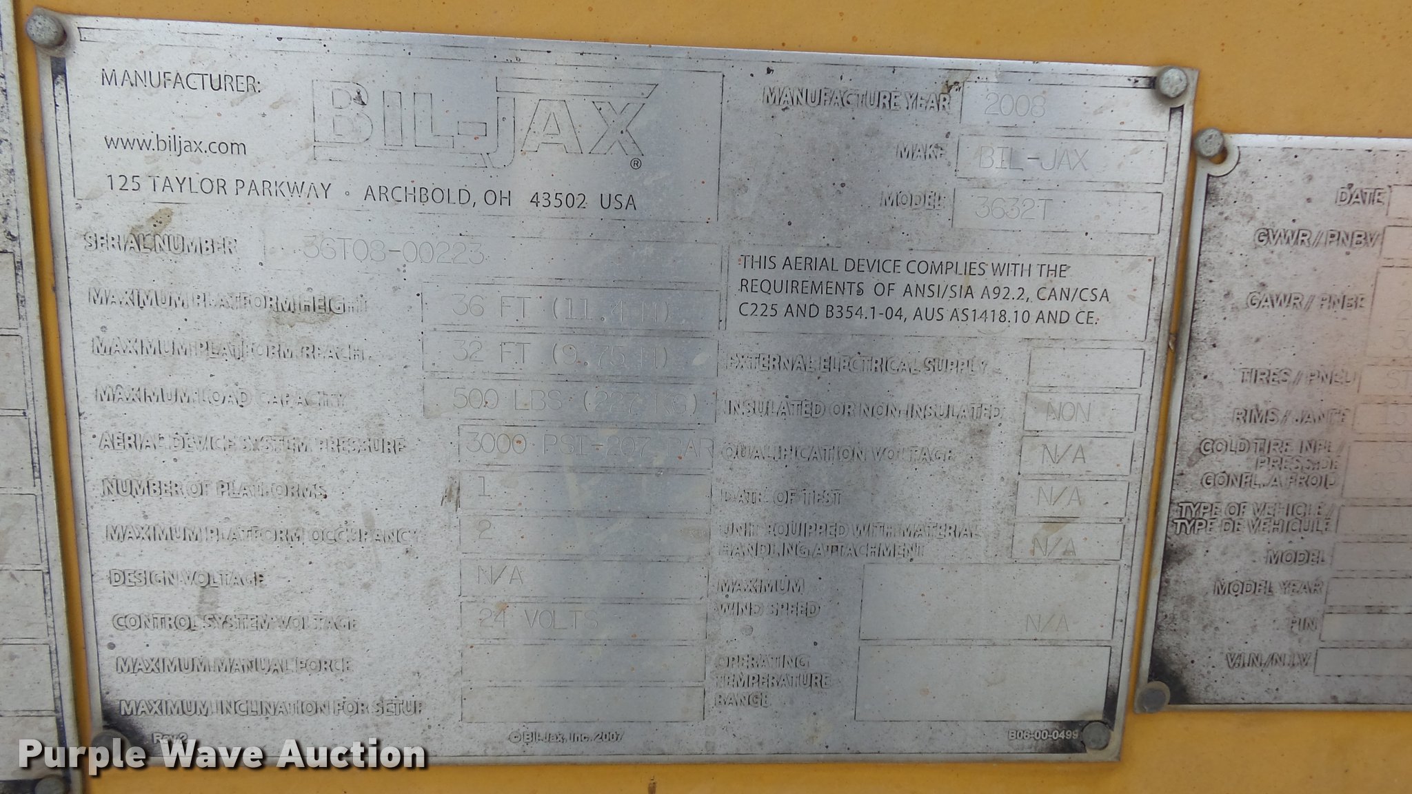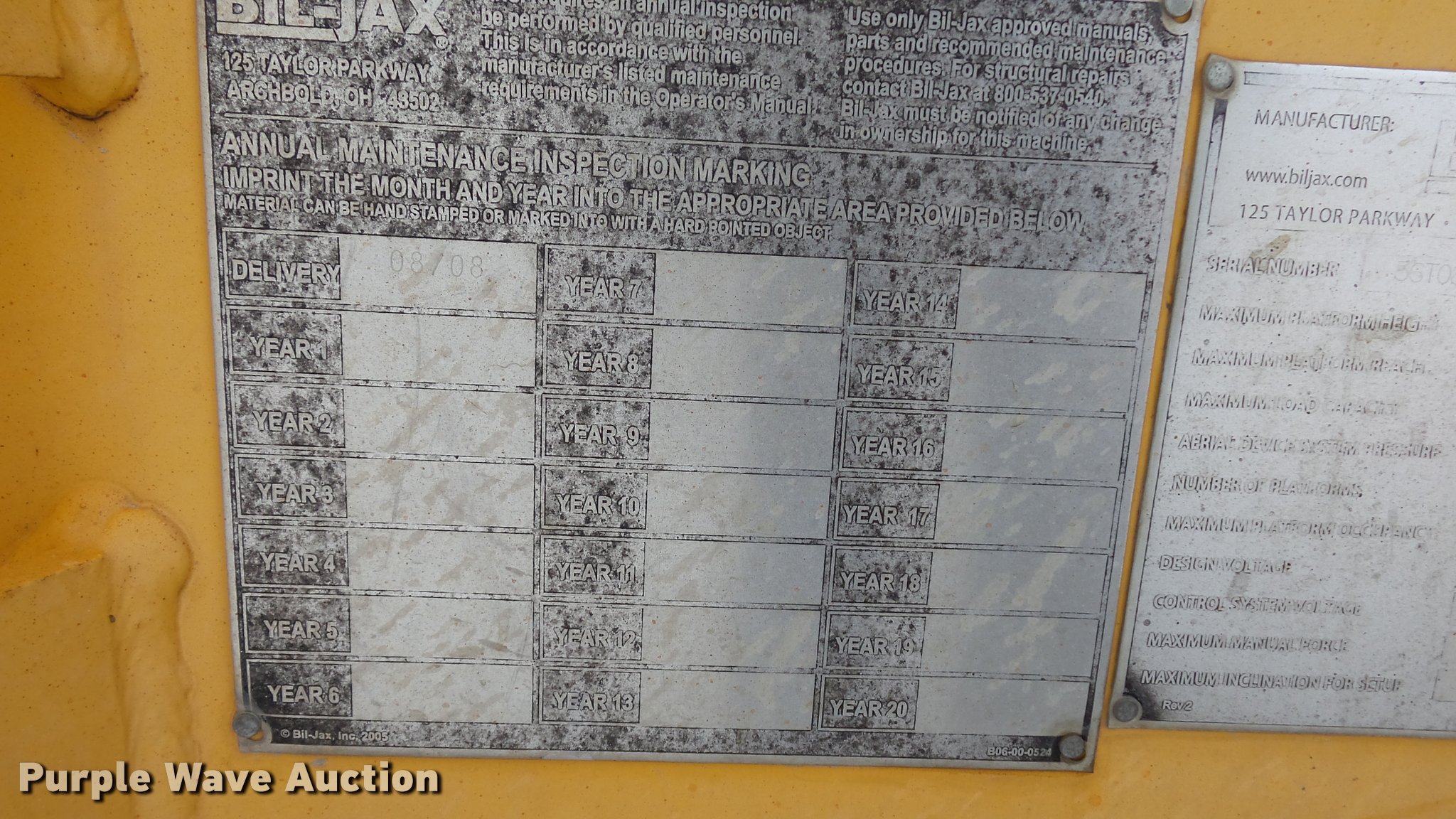 Purple Wave is selling a used Boom Lift in Kansas. This item is a 2008 Bil-jax 3632T boom lift with the following: 24V operation, 500 lbs maximum lift capacity, 30' maximum reach length, 40' maximum lift height, 4'L x 28" platform, Two person capacity, AC power outlet, Auto leveler, Hydraulic outriggers, Safety chains, 2" ball hitch, 225/75R15 tires, GVWR 5,240 lbs, Serial 36T08-00223
