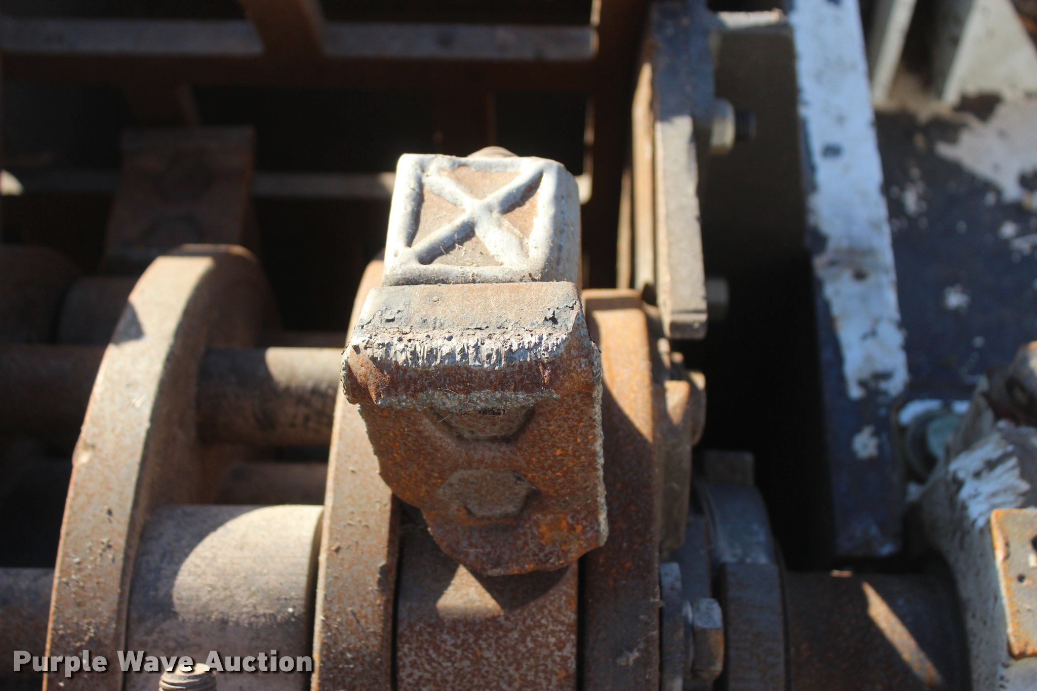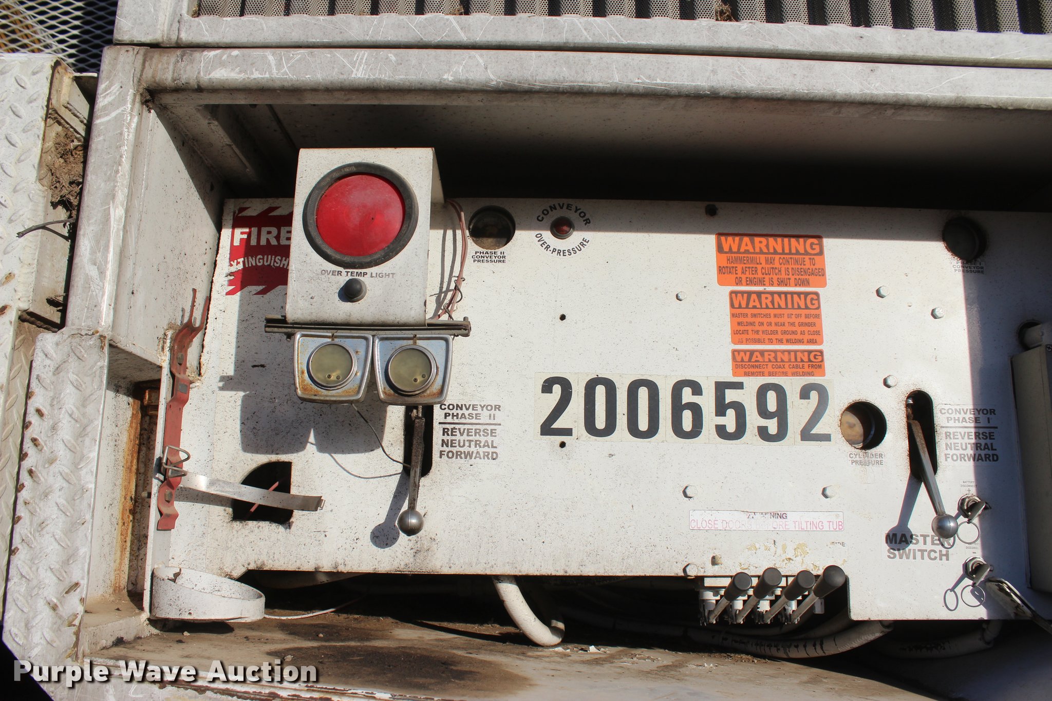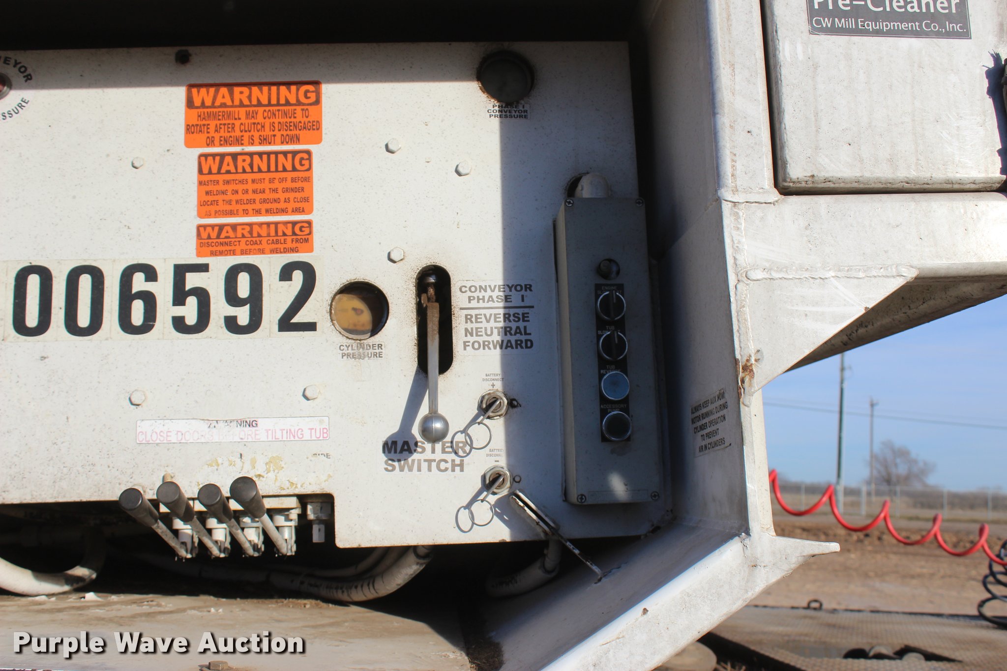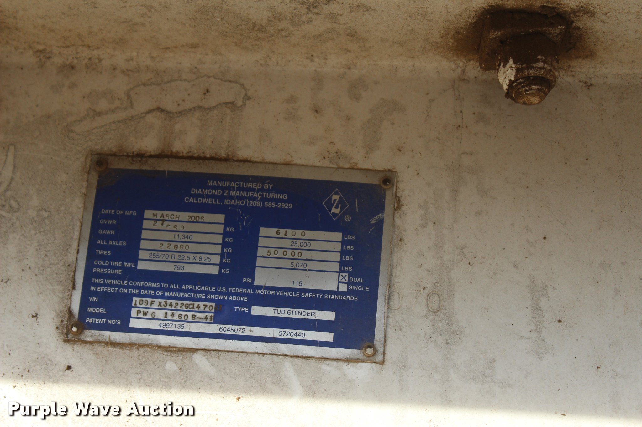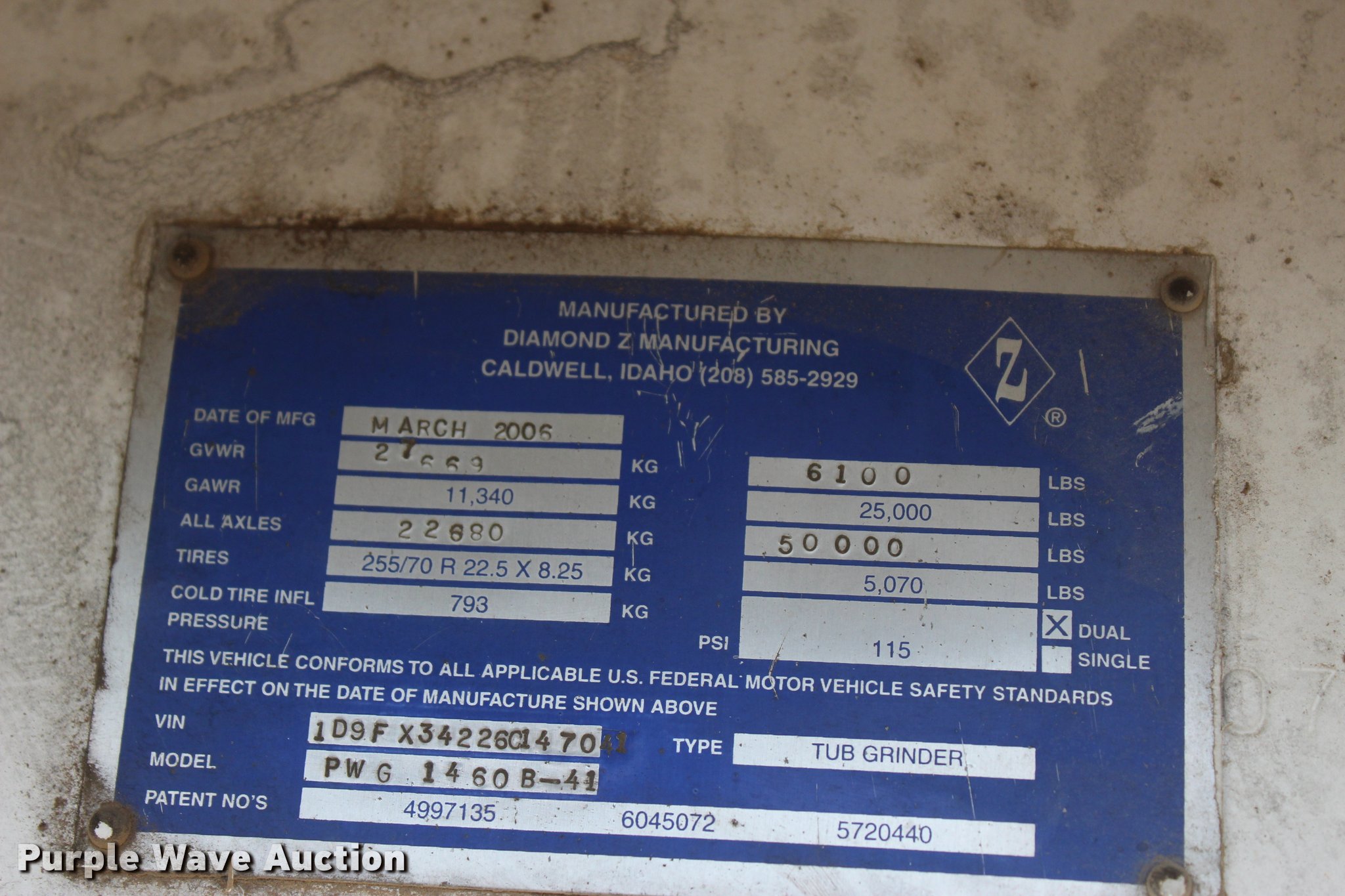 Purple Wave is selling a used Grinders in Oklahoma. This item is a 2006 Diamond 1460B-41 tub grinder with the following: 5,085 hours on meter, Caterpillar 3412 27.03L V12 diesel engine, 1,000 HP, 14' tub grinder, Tub slots to reduce size to 11'11", RTX-04 remote control, Automatic emergency conveyor, 120 tons per hour capacity, Dodge coupler, Knaack toolbox, (6) additional screens, (2) additional conveyor belts, (3) additional cutting edges, (24) additional hammers, (12) additional wear plates, Dual hydraulic front leveling jacks, Fifth wheel plate, Tandem axle, Spring suspension, GVWR 27,655 lbs, Factory rebuilt fluid coupler, 08/2015, Installed engine house with reversed fans for engine and hydraulic cooling, Dodge coupler installed 07/2016, New turbos installed 09/2016, Exhaust manifolds installed 04-2016, Maintenance records available on request, Engine blow-by, Serial 109FX342260147041