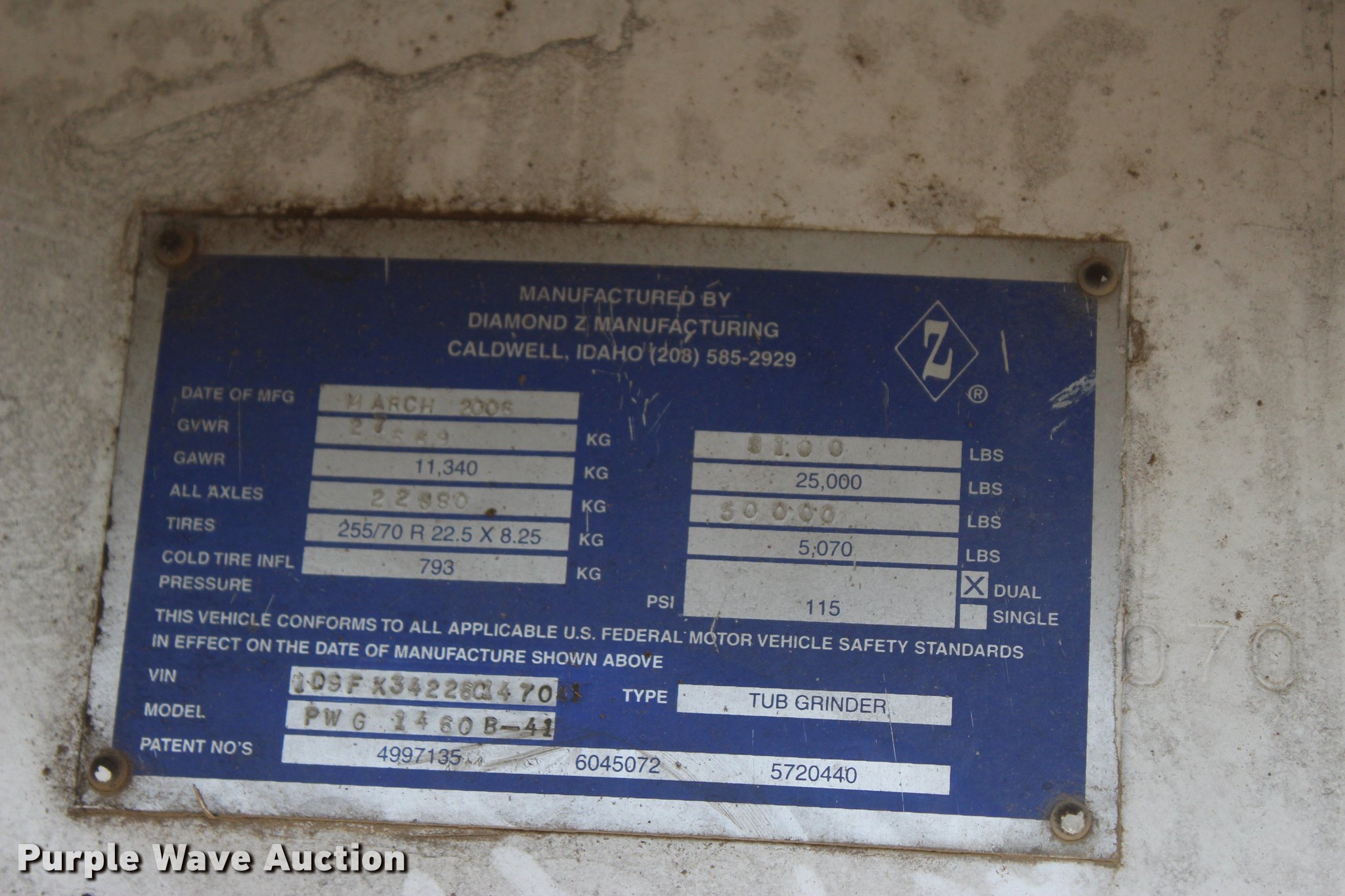 2006 Diamond 1460B-41 tub grinder. 5,085 hours on meter, Caterpillar 3412 27.03L V12 diesel engine 1,000 HP, 14' tub grinder Tub slots to reduce size to 11'11", RTX-04 remote control, Automatic emergency conveyor, 120 tons per hour capacity, Dodge coupler, Knaack toolbox, (6) additional screens, (2) additional conveyor belts, (3) additional cutting edges, (24) additional hammers, (12) additional wear plates, Dual hydraulic front leveling jacks, Fifth wheel plate, Tandem axle, Spring suspension, GVWR 27,655 lbs, Factory rebuilt fluid coupler, 08/2015, Installed engine house with reversed fans for engine and hydraulic cooling, Dodge coupler installed 07/2016, New turbos installed 09/2016, Exhaust manifolds installed 04-2016, Maintenance records available on request, Engine blow-by, Serial 109FX342260147041. View repairs. Transfer of ownership documentation will be a bill of sale. 1D9FX34226C147041. City of Tulsa. 2100 N 145th E Ave. Tulsa, OK 74116
