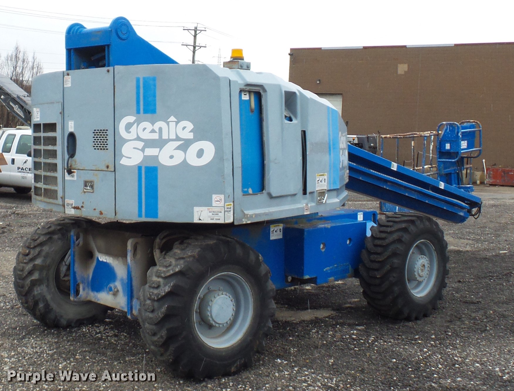Genie S60 boom lift. 4,876 hours on meter, Deutz F4L four cylinder diesel engine, Four wheel drive, 60' maximum platform height, 50'8" maximum reach, 660 lbs maximum lift capacity, 68"L x 27"W x 42" platform Platform and ground controls, 15-16.5 tires, Platform controls work intermittently , Hydraulic oil leaks, Serial 531. Pace Construction. 1620 Woodson Rd. St. Louis, MO 63114
