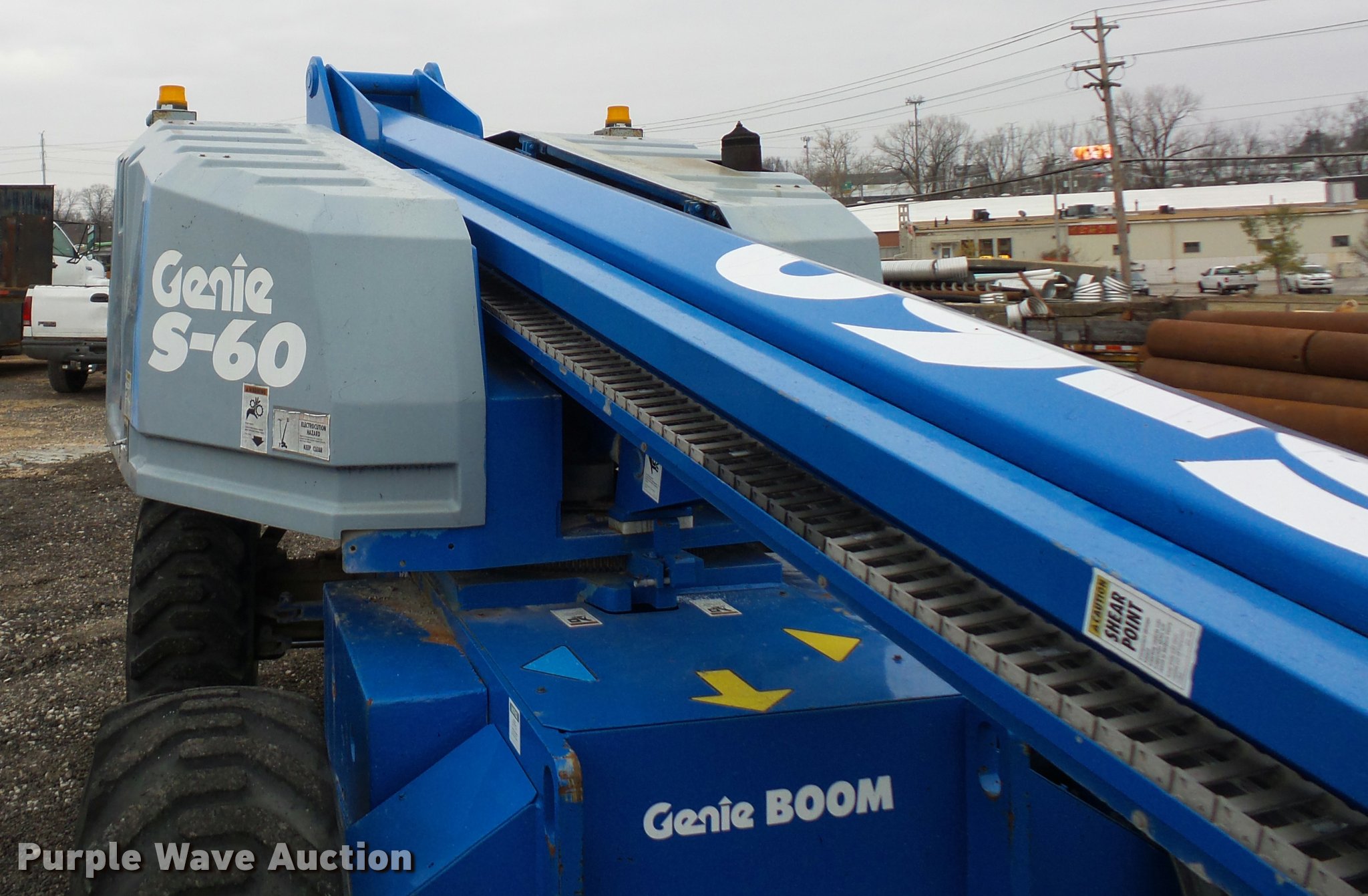 Purple Wave is selling a used Boom Lift in Missouri. This item is a Genie S60 boom lift with the following: 4,876 hours on meter, Deutz F4L four cylinder diesel engine, Four wheel drive, 60' maximum platform height, 50'8" maximum reach, 660 lbs maximum lift capacity, 68"L x 27"W x 42" platform, Platform and ground controls, 15-16.5 tires, Platform controls work intermittently, Hydraulic oil leaks, Serial 531