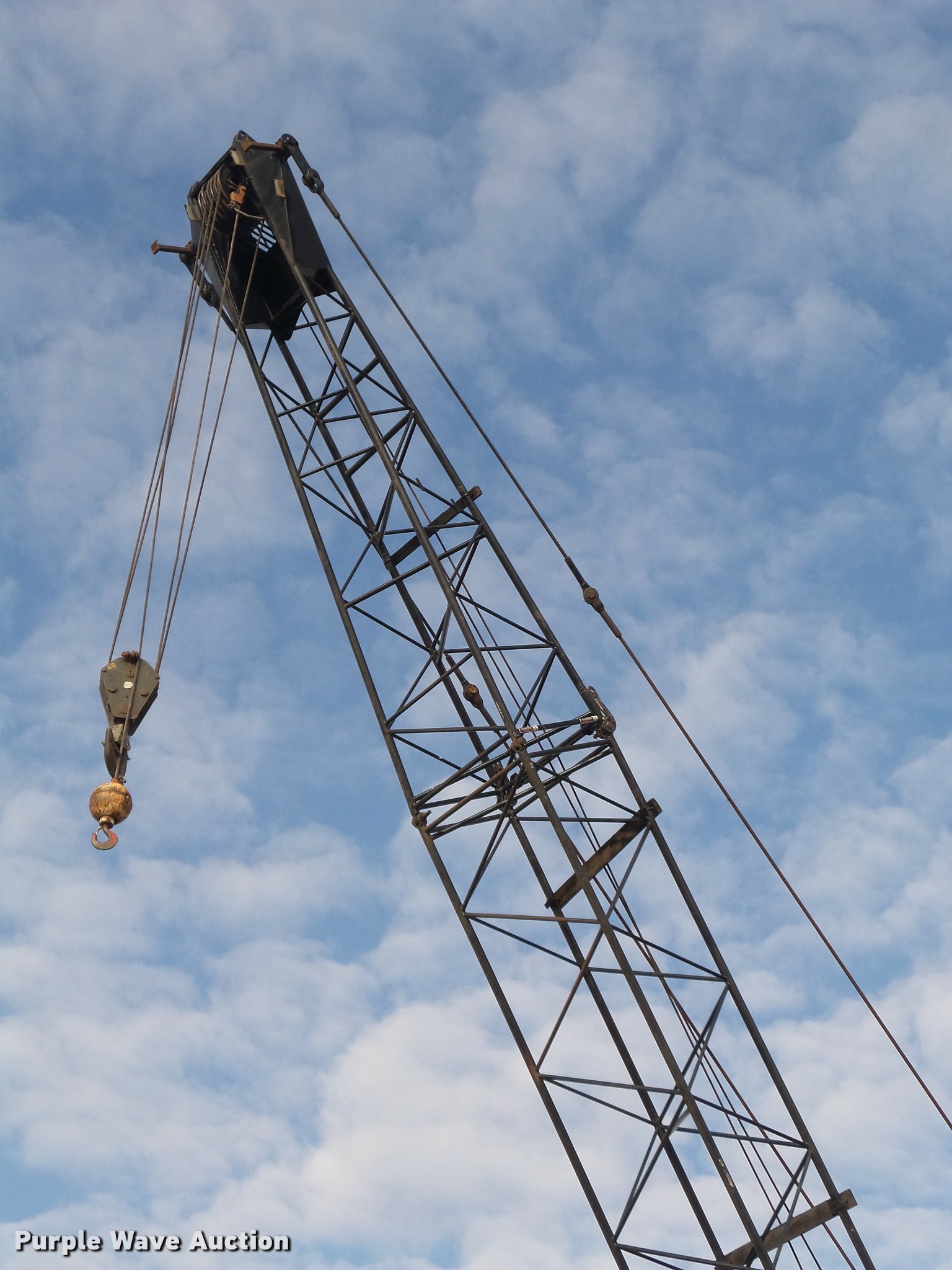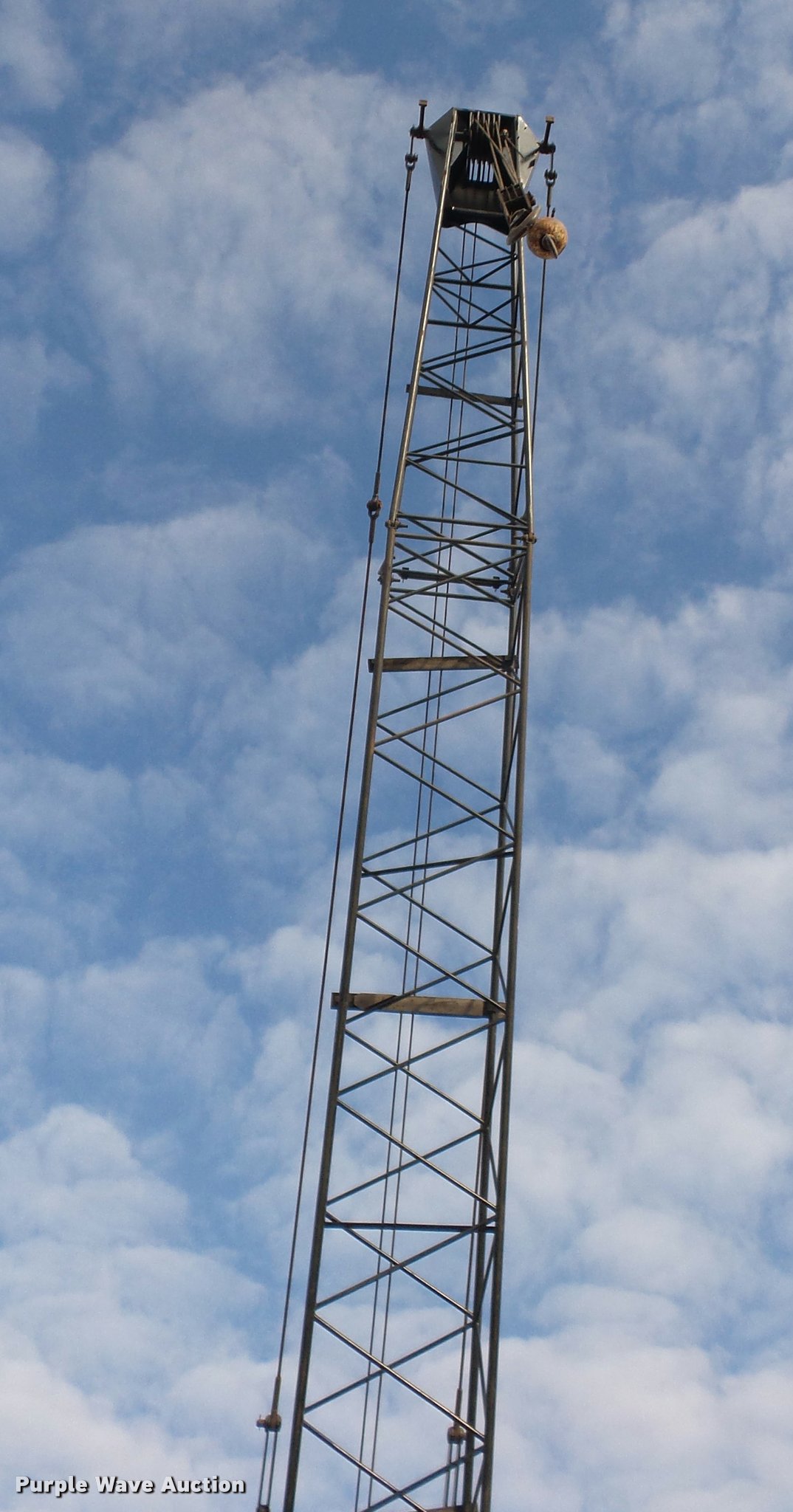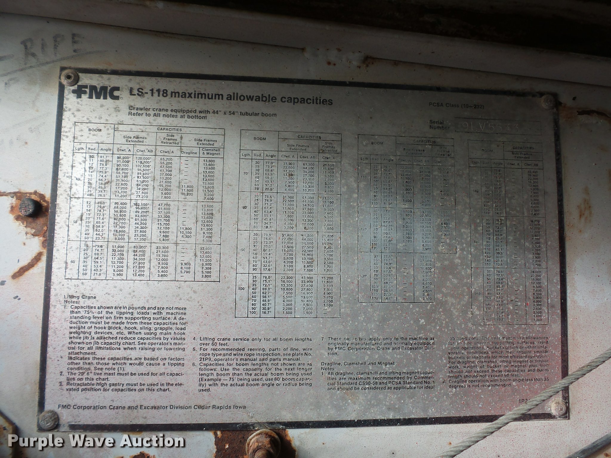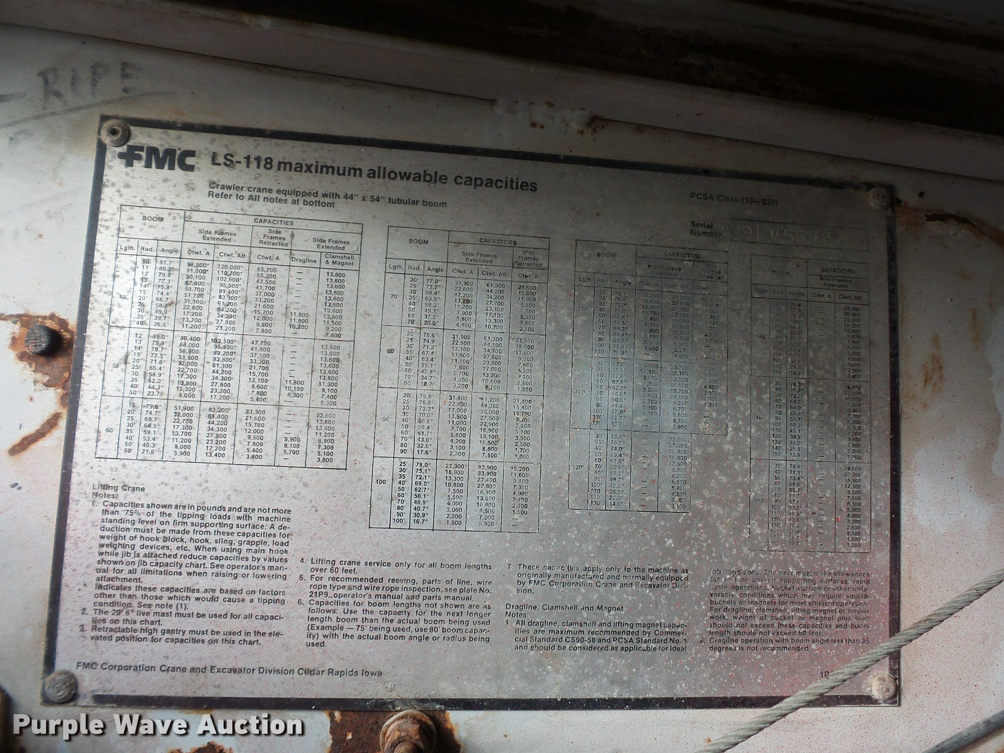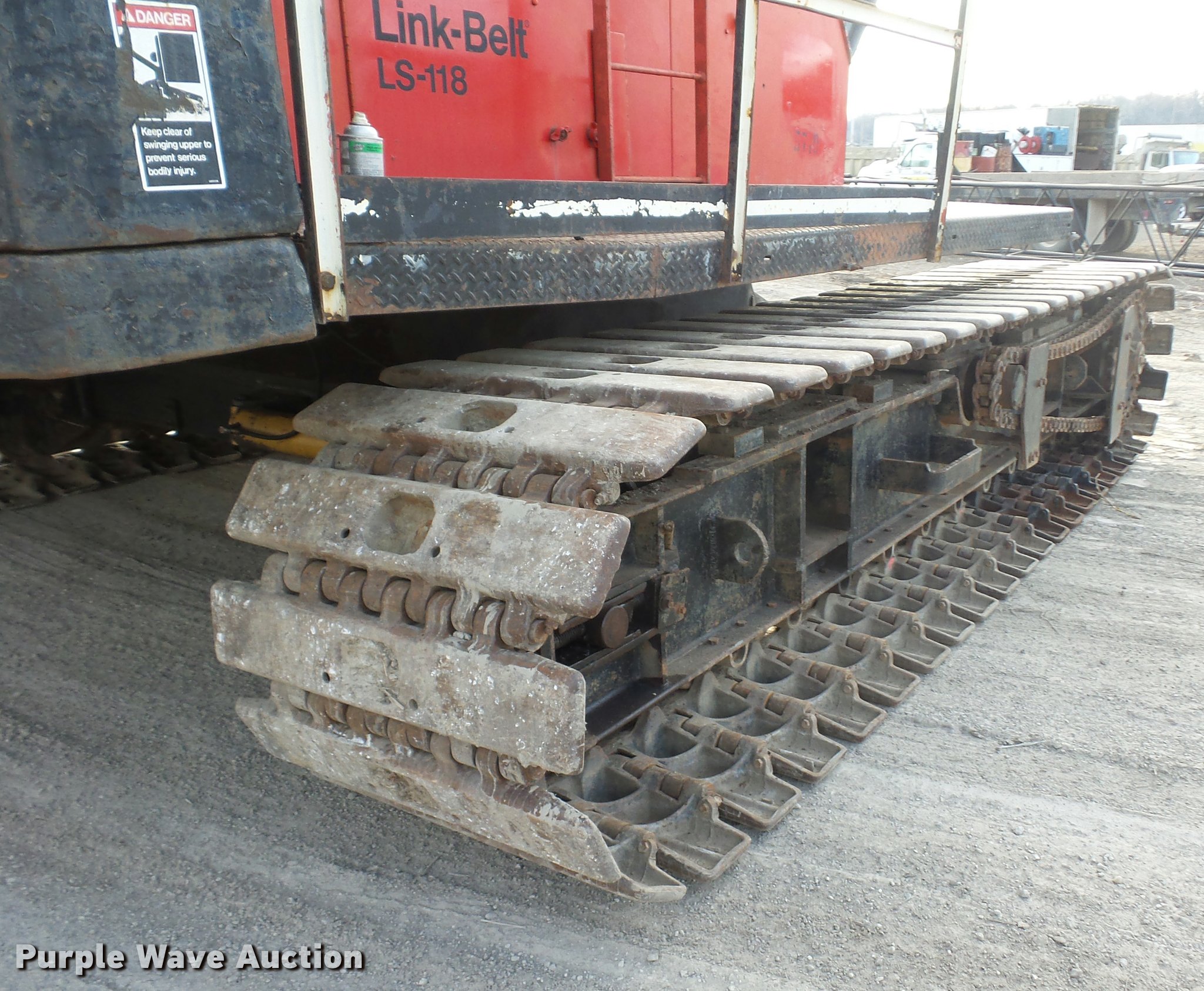 Purple Wave is selling a used Crawler Crane in Missouri. This item is a 1978 Link Belt LS-118 crane with the following: 4,955 hours on meter, Detroit Diesel six cylinder diesel engine, Clutch brake transmission, Hi-Lo, Enclosed cab, Suspension seat, Stick crane controls, Lattice boom, 120' boom length, 30' jib, (5) boom sections, (2) 30' extensions, (2) 20' extensions, 60 ton maximum lift capacity, (3) winches, 20' butt and point, In-cab boom controls, Crane block, (3) sheaves, 35 ton capacity, Third drum, Crane ball and hook, Power load lowering, (11) bottom rollers, Hydraulic width adjustment, 36"W tracks, Operators manual, Serial 9LV5533, Unit# 5710