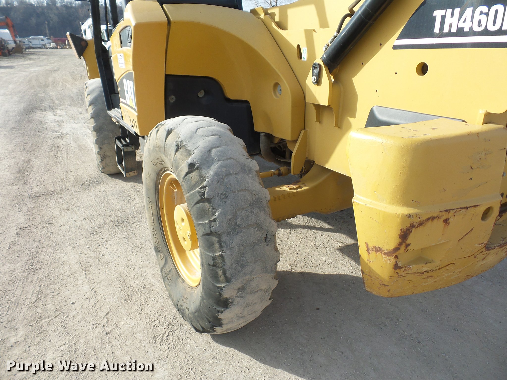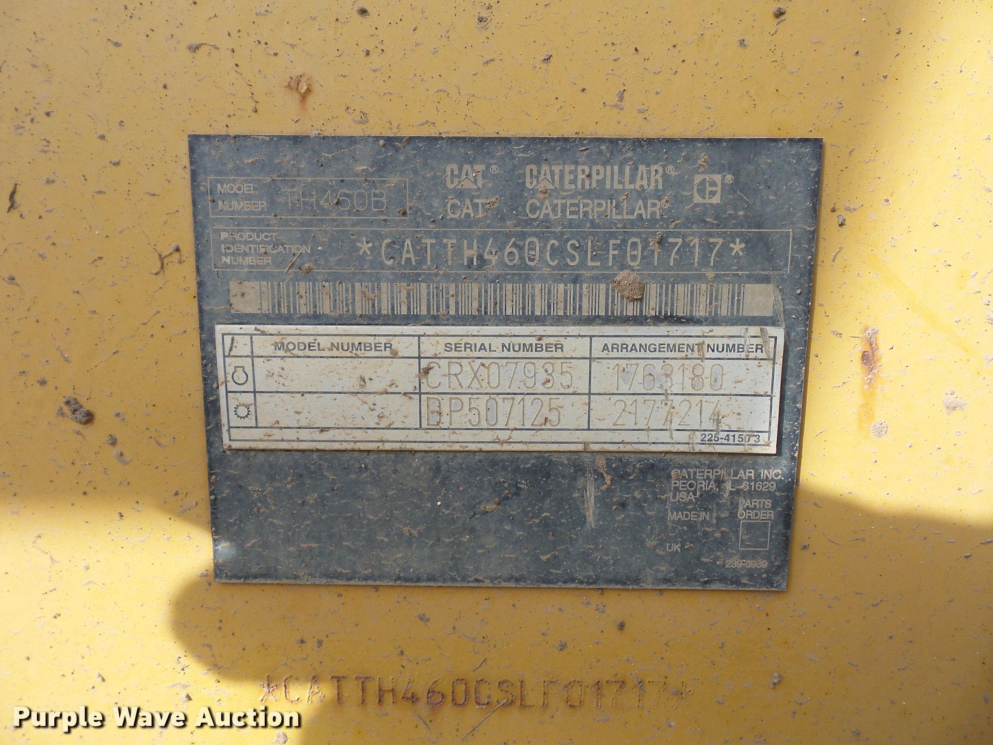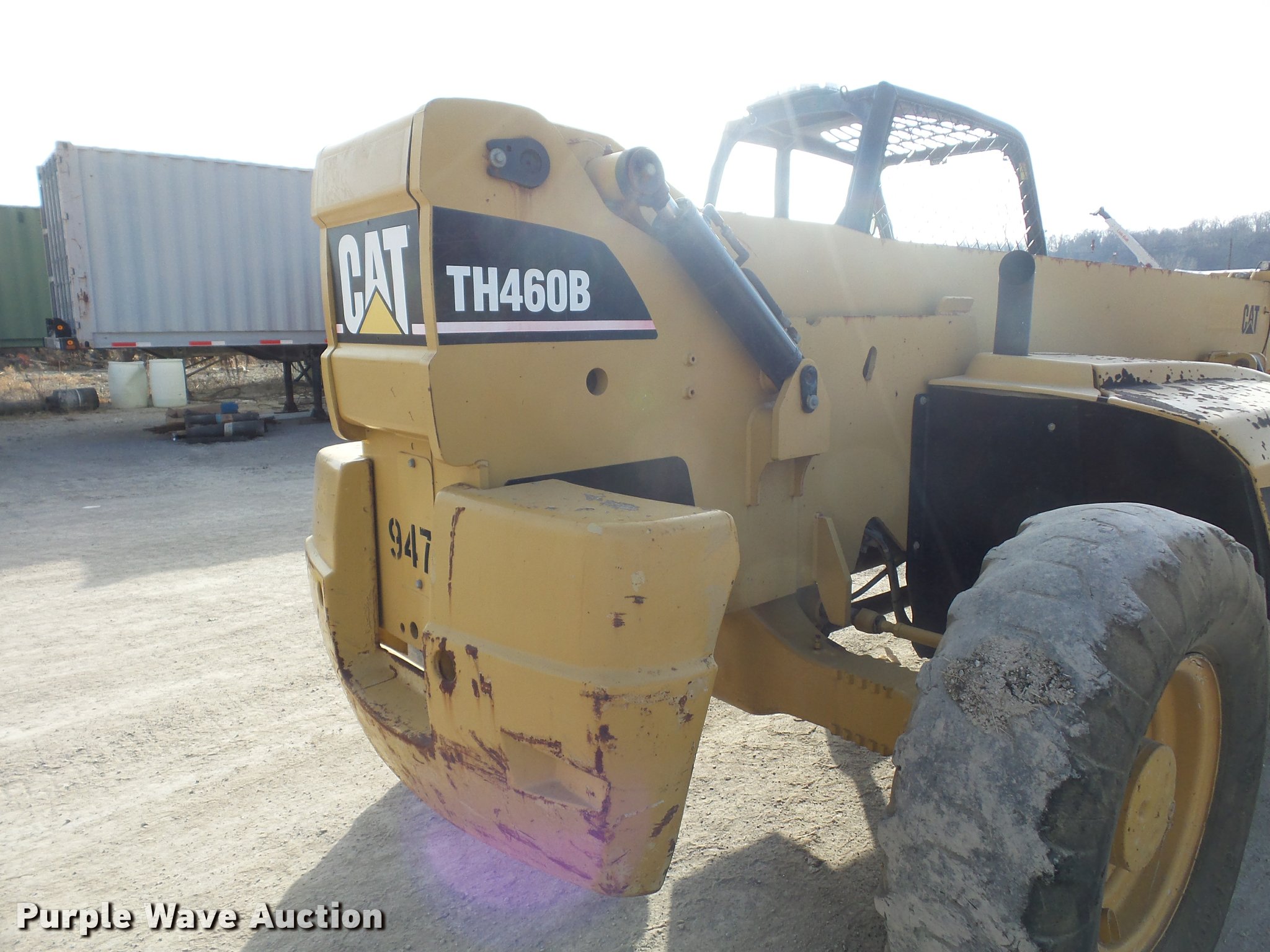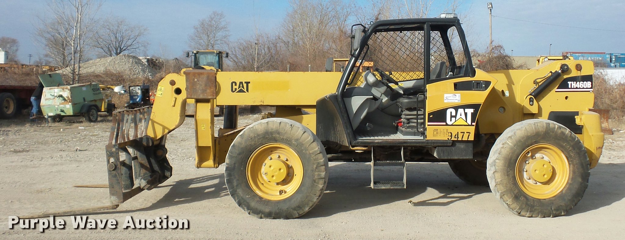 Purple Wave is selling a used Telehandler in Missouri. This item is a 2005 Caterpillar TH4600 telehandler with the following: 3,315 hours on meter, Caterpillar 3054E 4.4L four cylinder diesel engine, Powershift transmission, 4F-4R gears, Four wheel drive, Crab steer, Four wheel steer, Work lights, 9,000 lbs maximum lift capacity, 30' maximum reach length, 45' maximum lift height, 46" fork length, Hydraulic outriggers, Tilt carriage, Tilt cab, 14.00-24 foam-filled tires, Transmission issues, Transmission will kick out of gear, Serial CATTH460CSLF01717, Unit# 9477