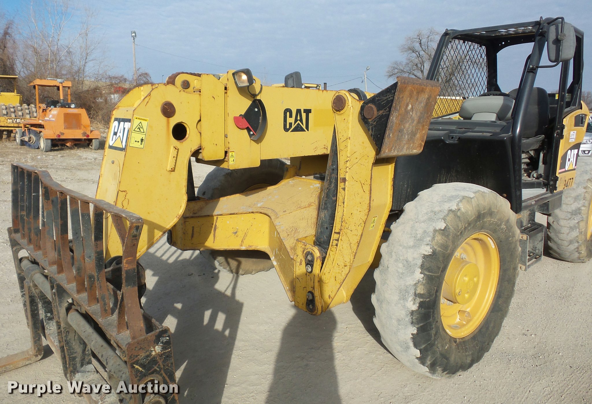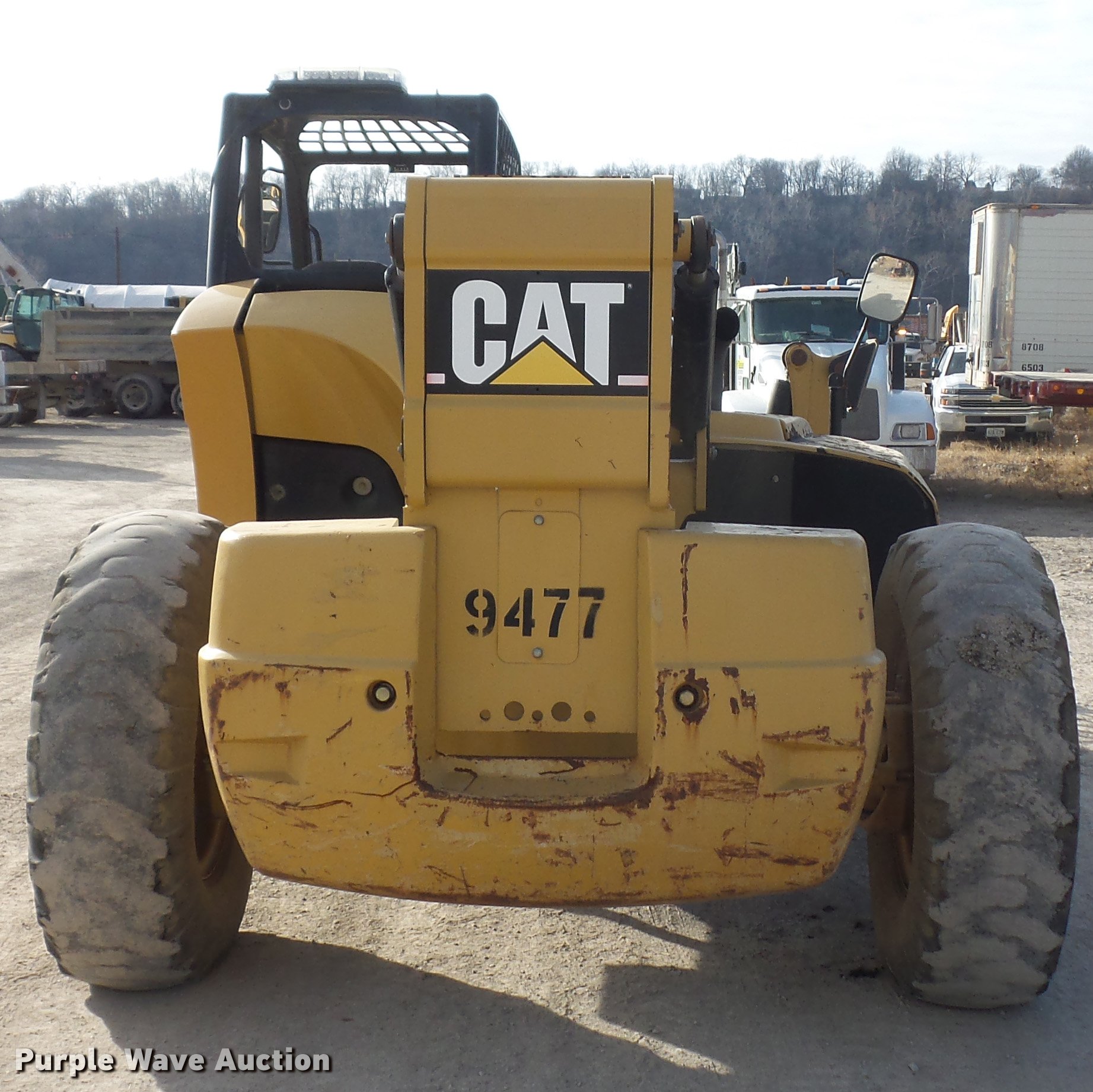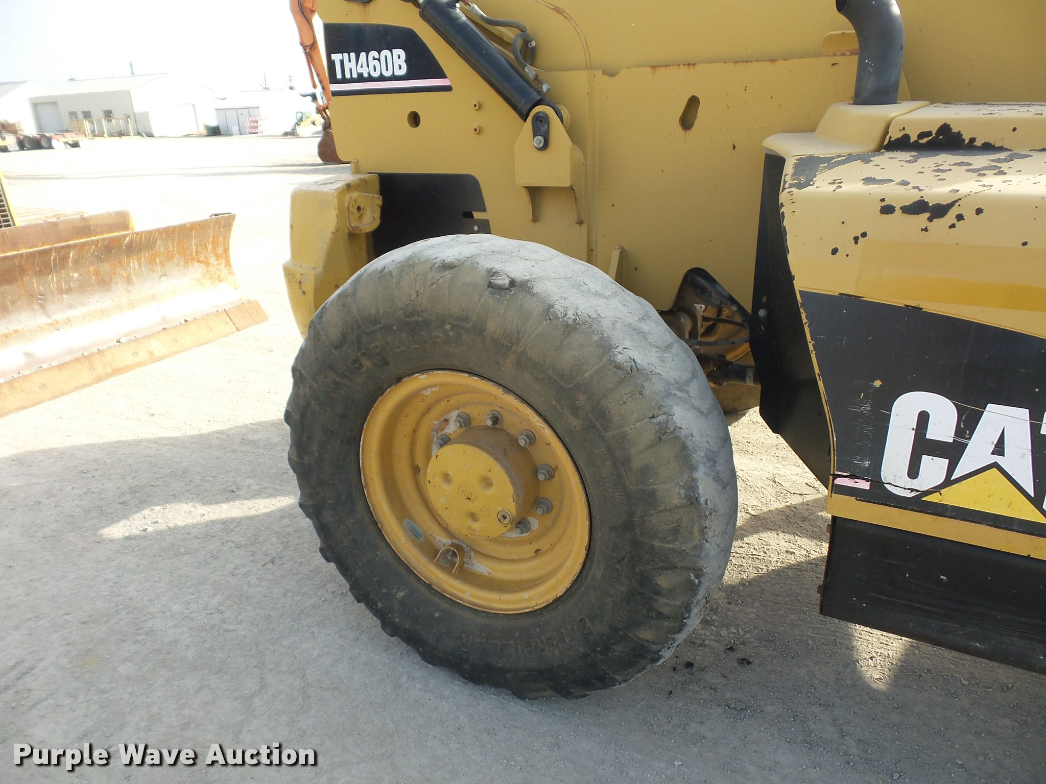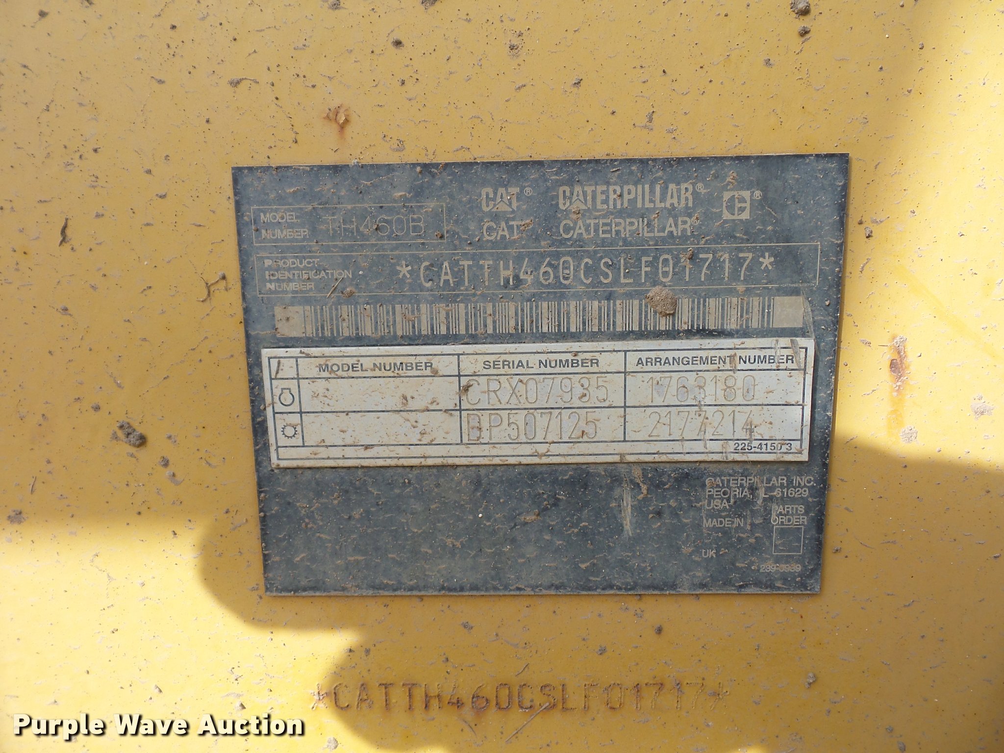 Purple Wave is selling a used Telehandler in Missouri. This item is a 2005 Caterpillar TH4600 telehandler with the following: 3,315 hours on meter, Caterpillar 3054E 4.4L four cylinder diesel engine, Powershift transmission, 4F-4R gears, Four wheel drive, Crab steer, Four wheel steer, Work lights, 9,000 lbs maximum lift capacity, 30' maximum reach length, 45' maximum lift height, 46" fork length, Hydraulic outriggers, Tilt carriage, Tilt cab, 14.00-24 foam-filled tires, Transmission issues, Transmission will kick out of gear, Serial CATTH460CSLF01717, Unit# 9477