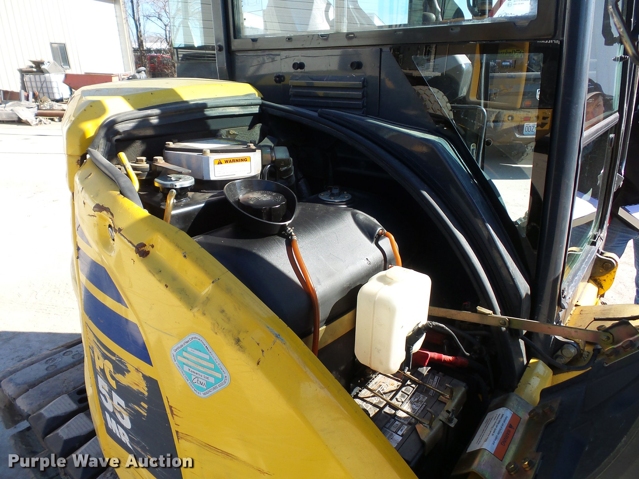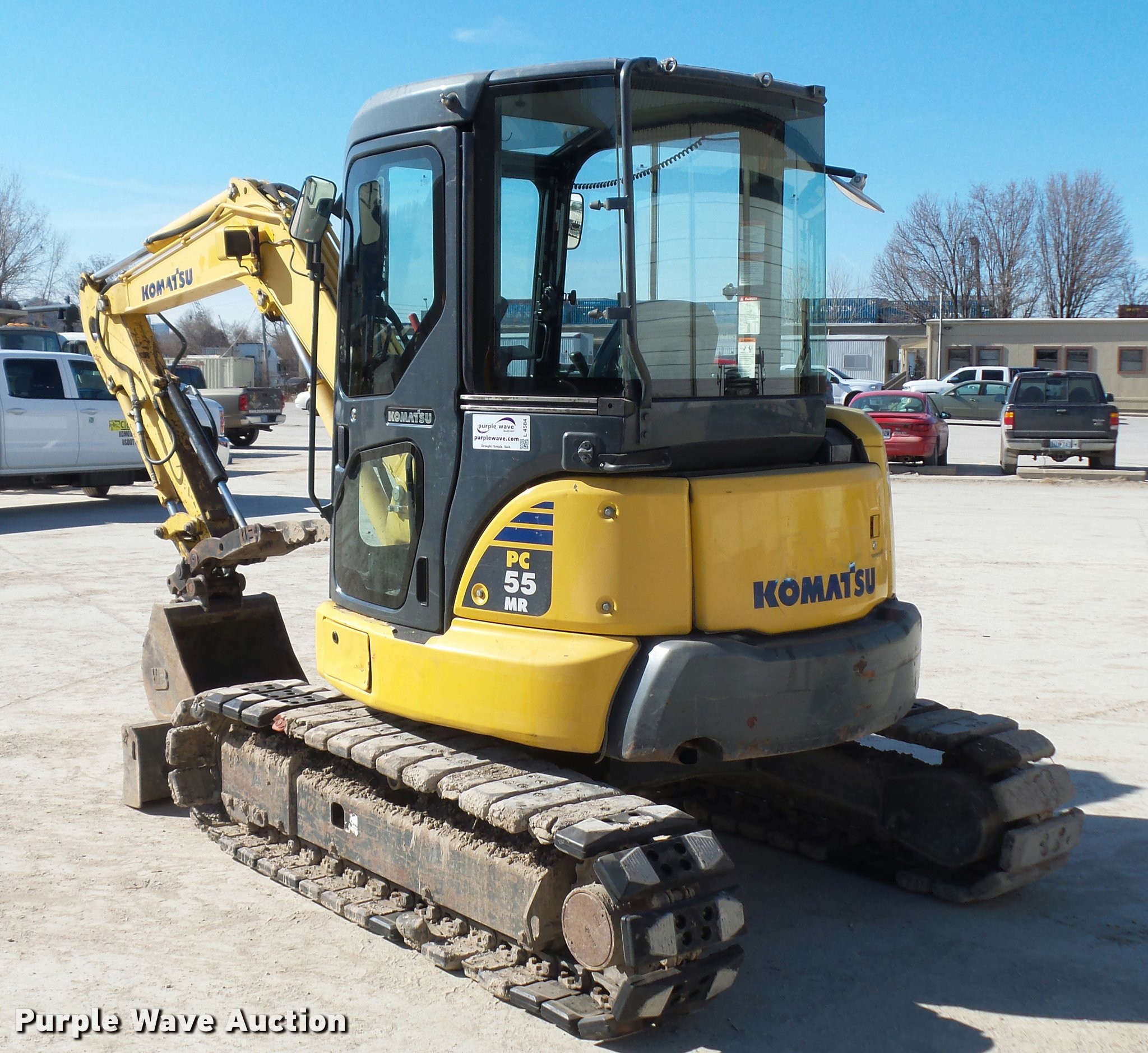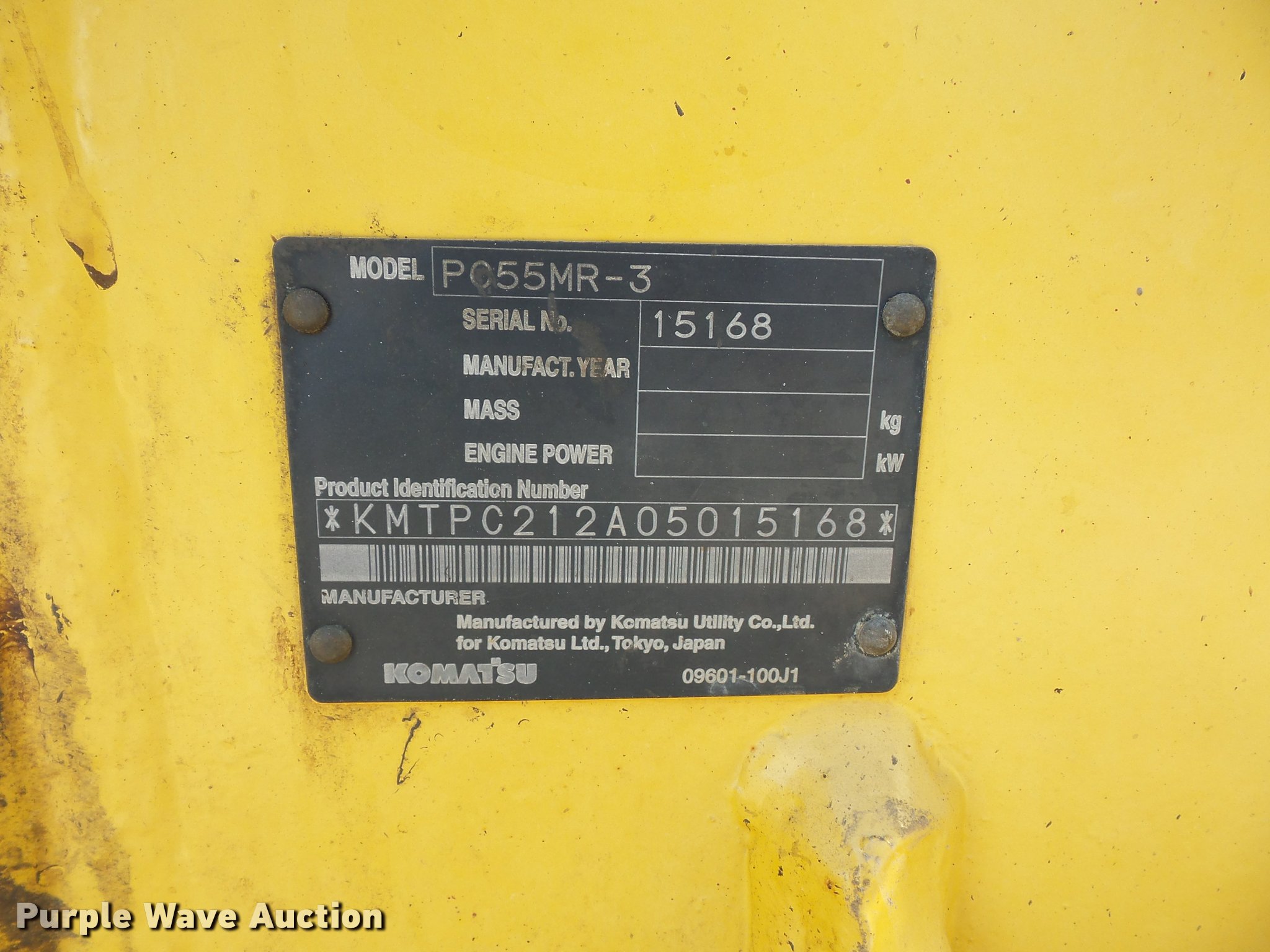 Purple Wave is selling a used Mini Excavator in Missouri. This item is a 2009 Komatsu PC55MR-3 compact excavator with the following: 4,070 hours on meter, Komatsu 2.2L four cylinder diesel engine, Two speed hydrostatic transmission, EROPS, Serial K8749A, AC and heat, AM/FM/CD, Suspension seat, Wipers, Front work lights, Standard boom, Standard auxiliary hydraulics, 57" stick length, WB 24"W bucket, (5) weld-on teeth, WB hydraulic thumb, Mechanical quick coupler, 77"W backfill blade, Four bottom rollers, 16"W steel track rails with street pads, Serial KMTPC212A05015168, Unit# 5353