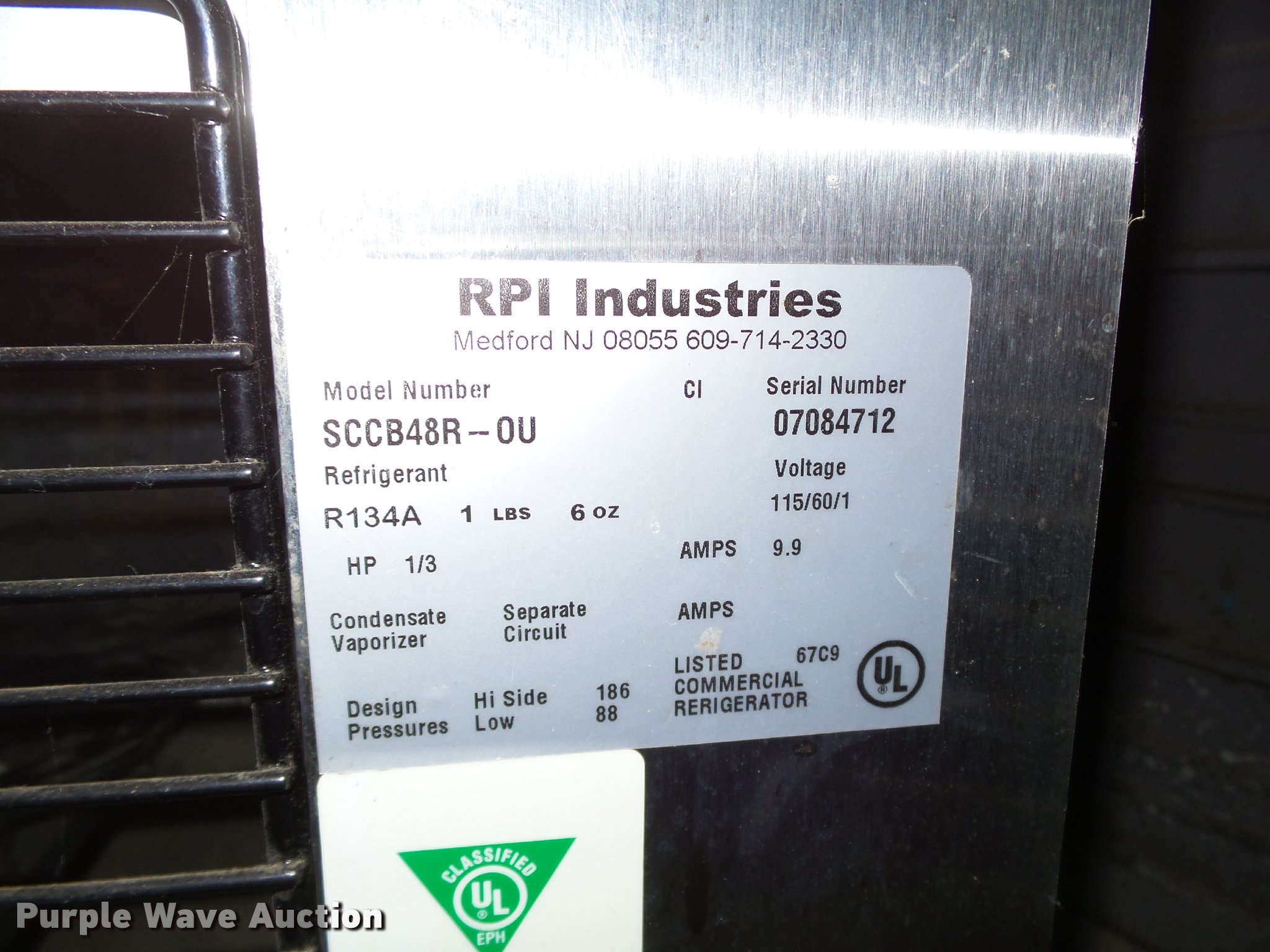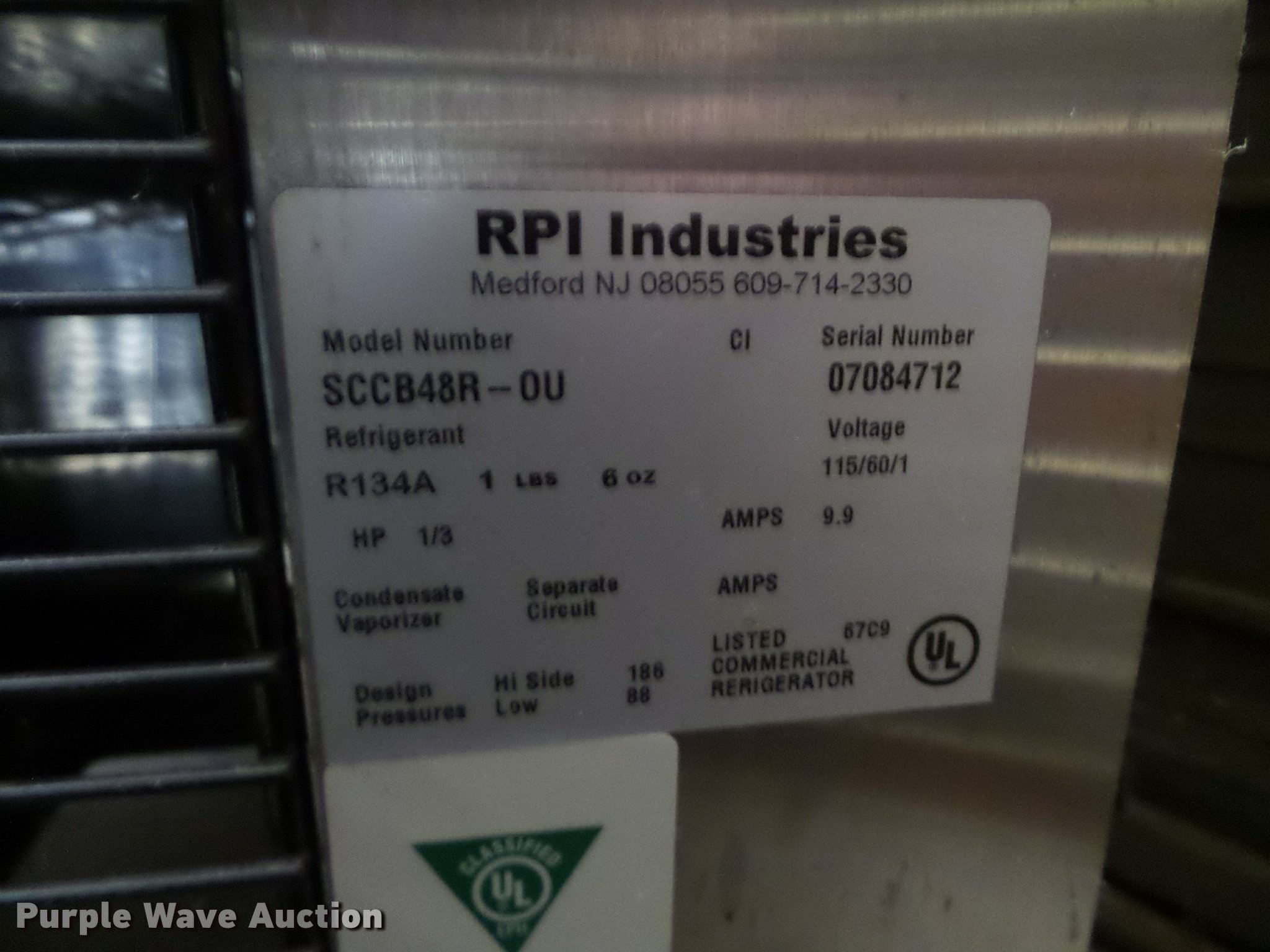Purple Wave is selling a used Restaurant Equip. in Oklahoma. This item is a RPI Industries refrigerated display case with the following: Model SCCB48R-04, 48"W x 60"H, 115V, Single phase, Casters, Serial D7084712