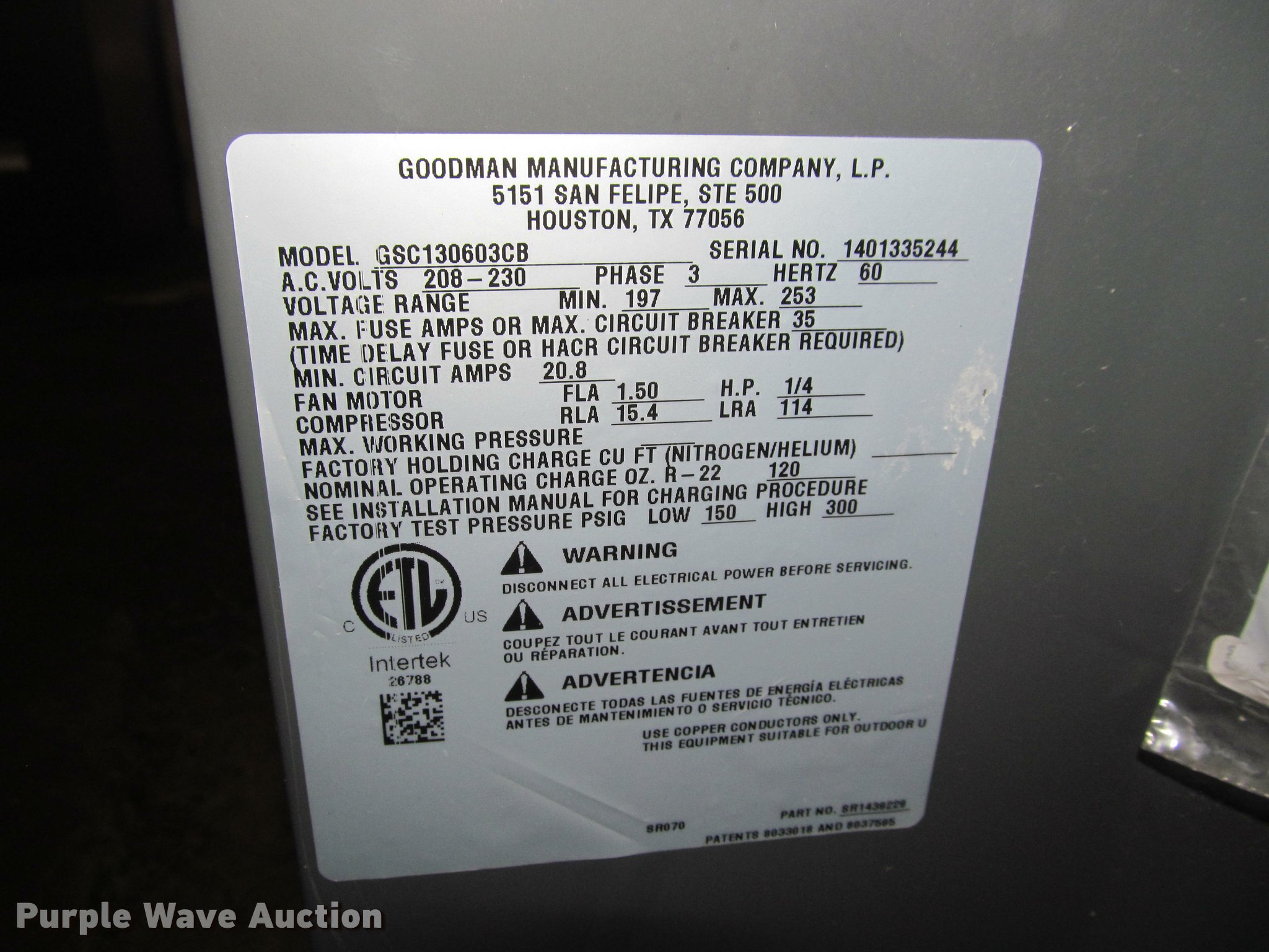 Purple Wave is selling a used Appliances in Kansas. This item is a Goodman AC unit with the following: Model GSC130603CB, 208-230V, Three phase, 60 Hz, Serial 1401335244