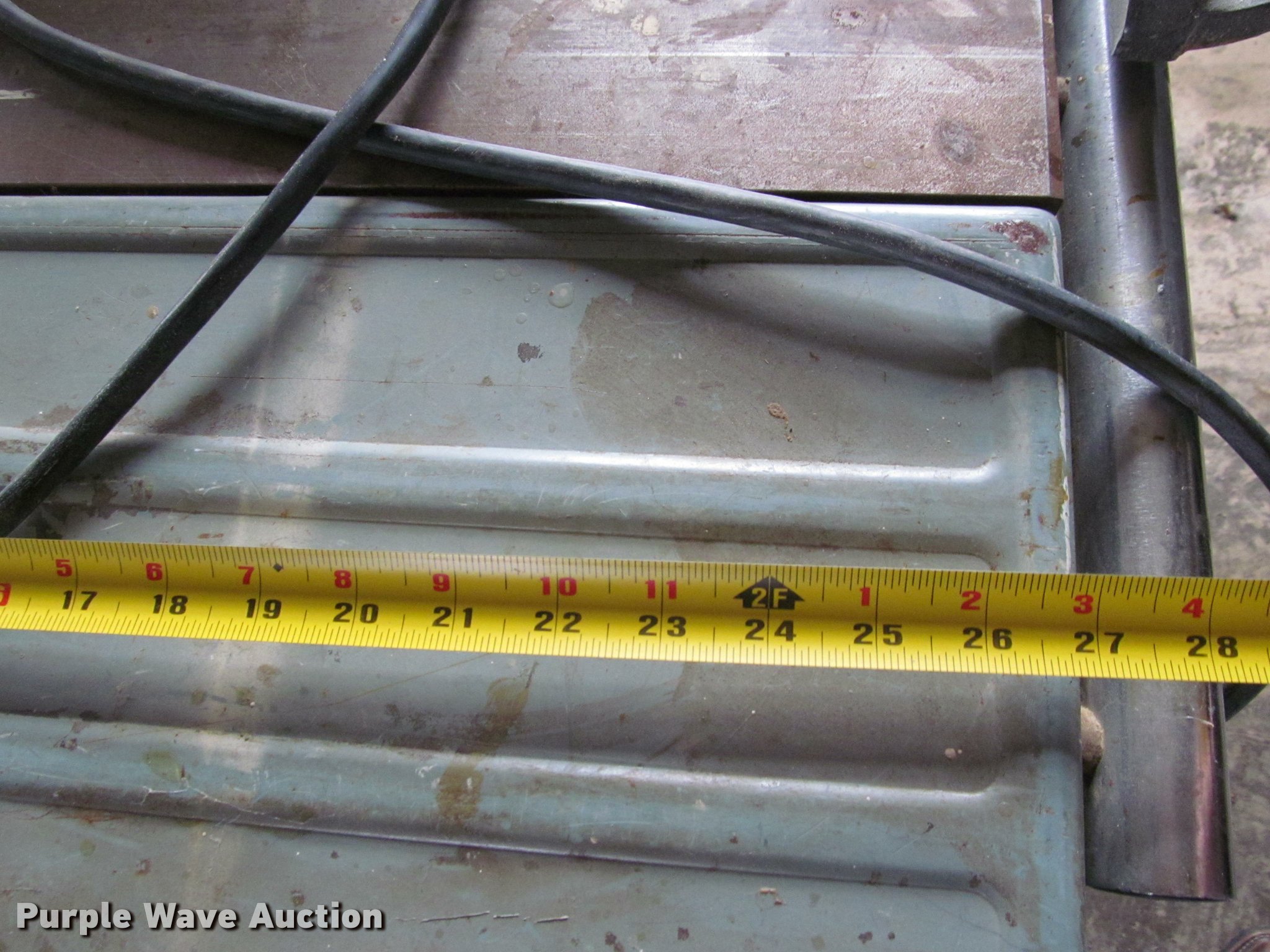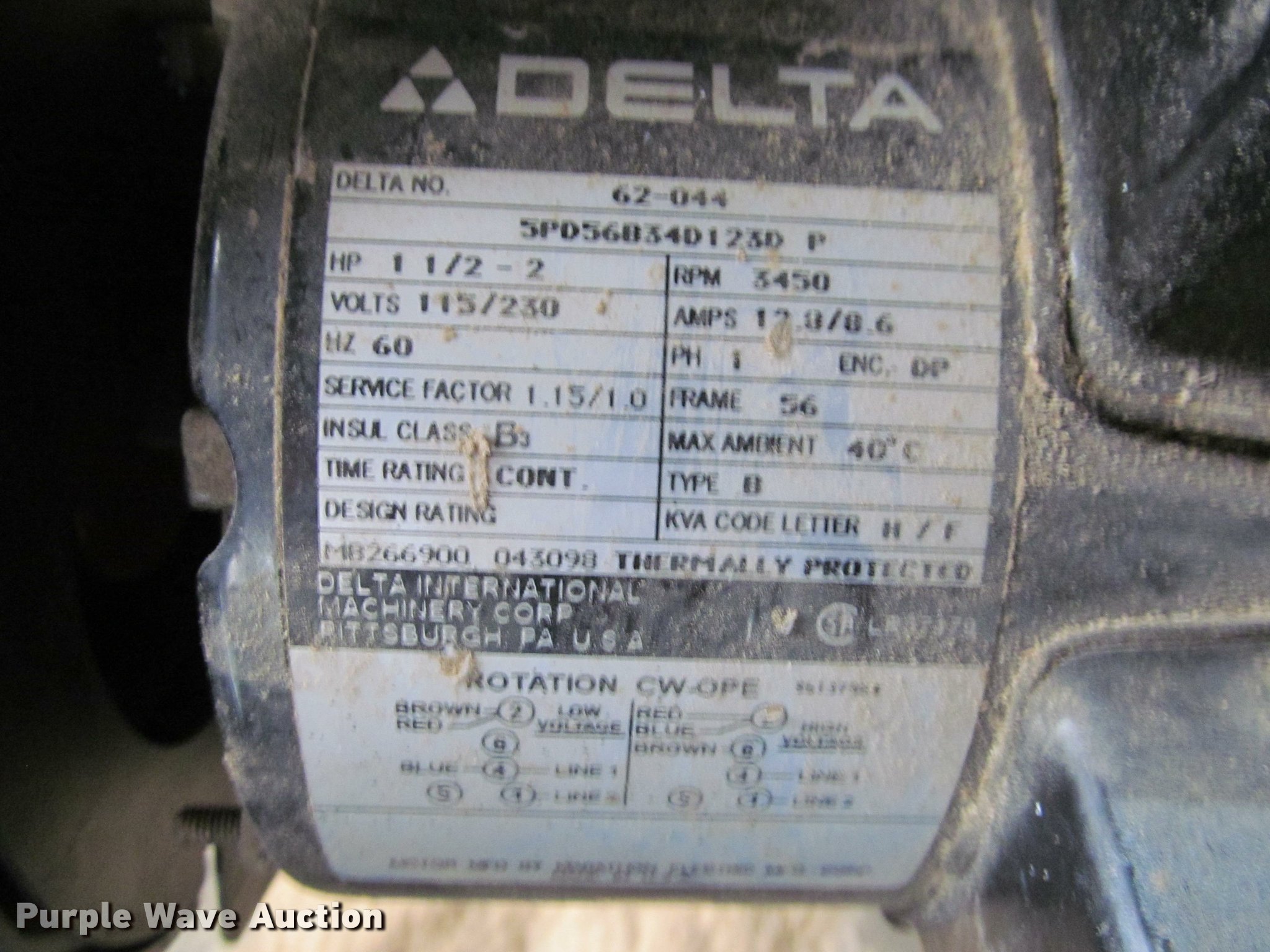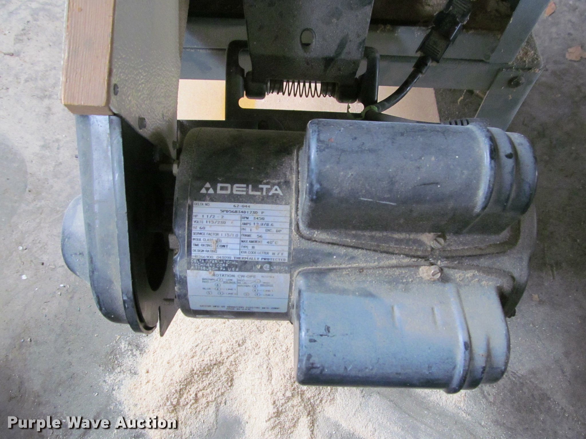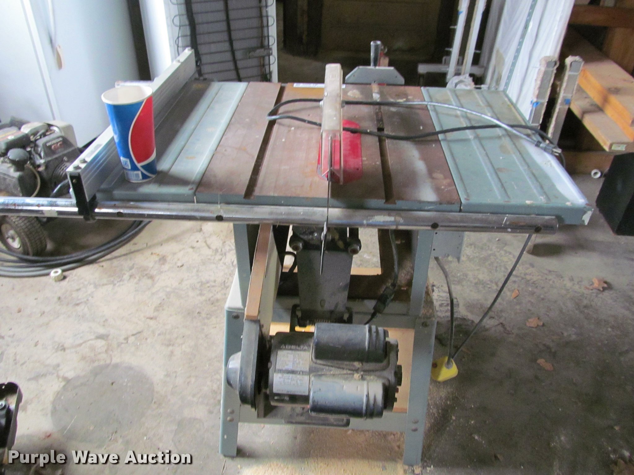 Purple Wave is selling a used Tools in Kansas. This item is a Delta table saw with the following: Delta electric motor, 110V, 1.5-2 HP, 3,450 RPM, Single phase, 60 Hz, Serial 62-044, 40"W x 27"D, 10" blade capacity, Adjustable fence, Miter guide