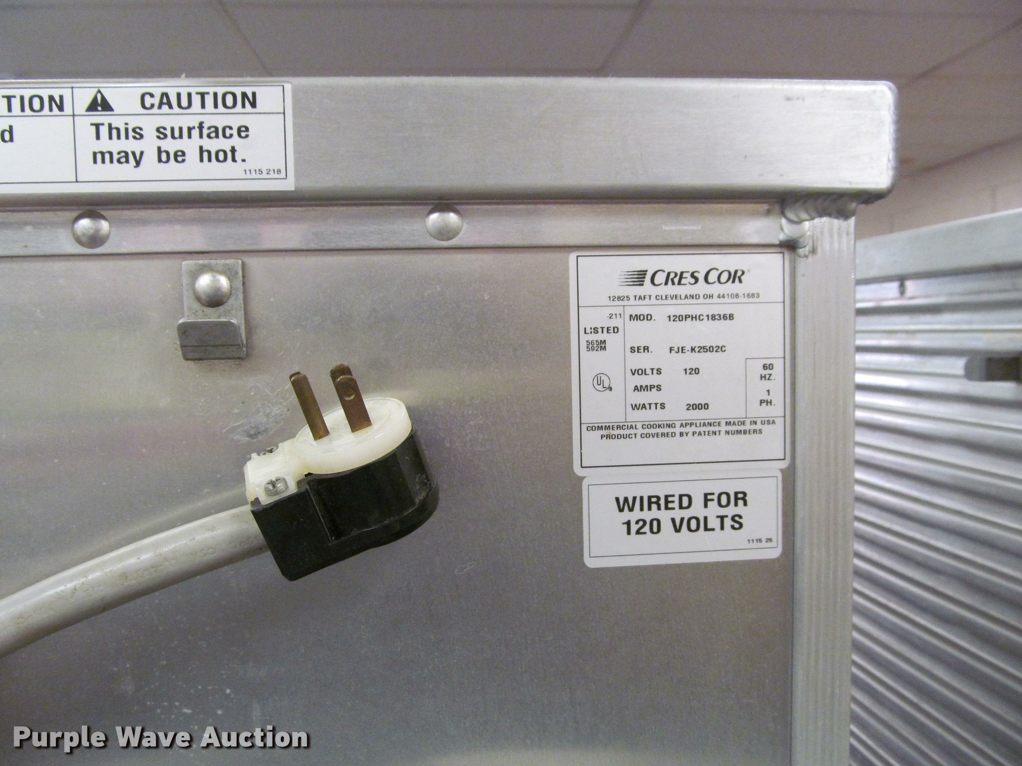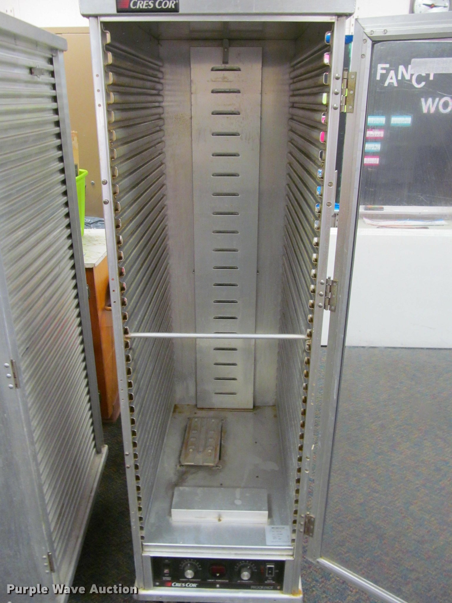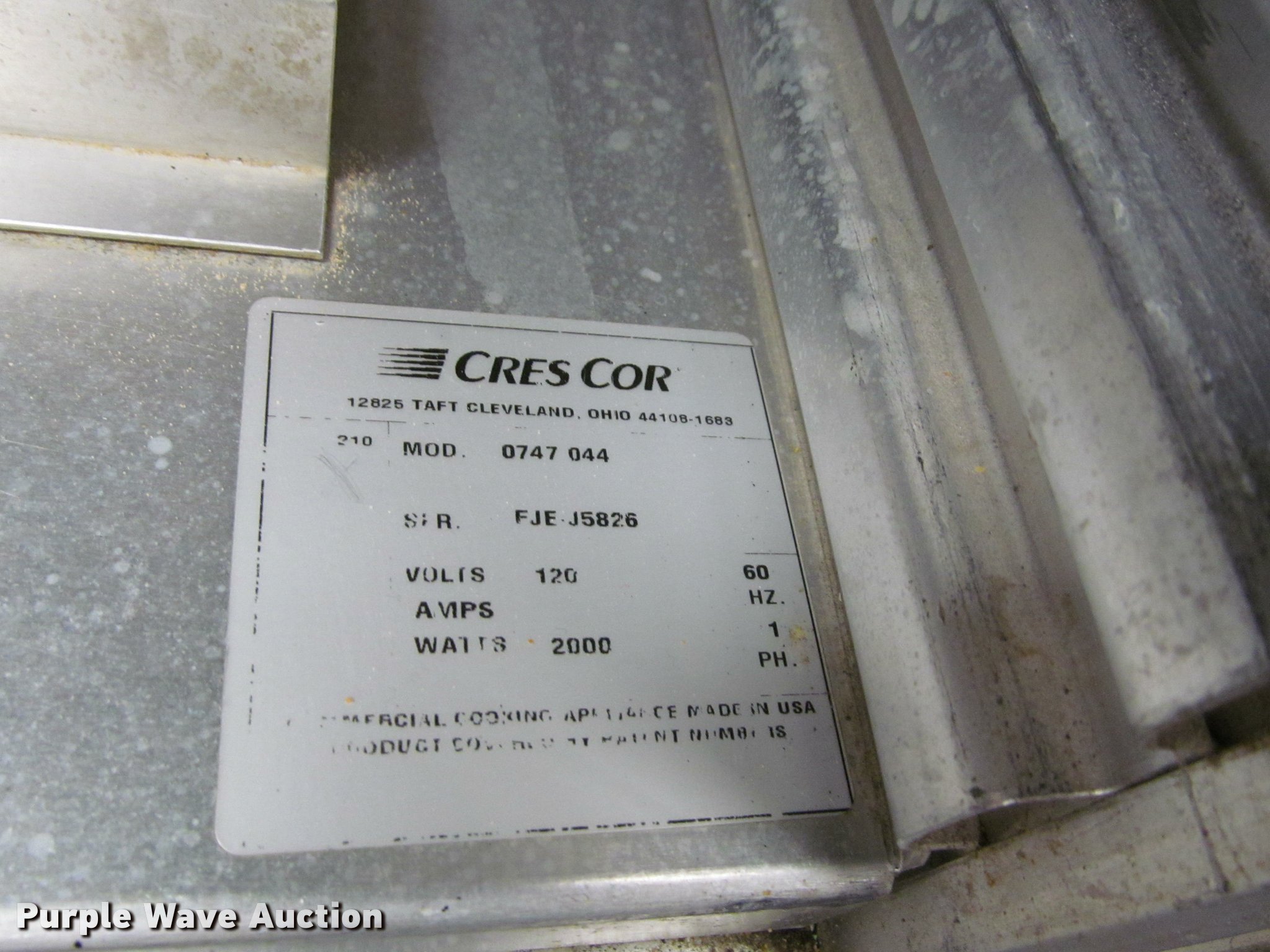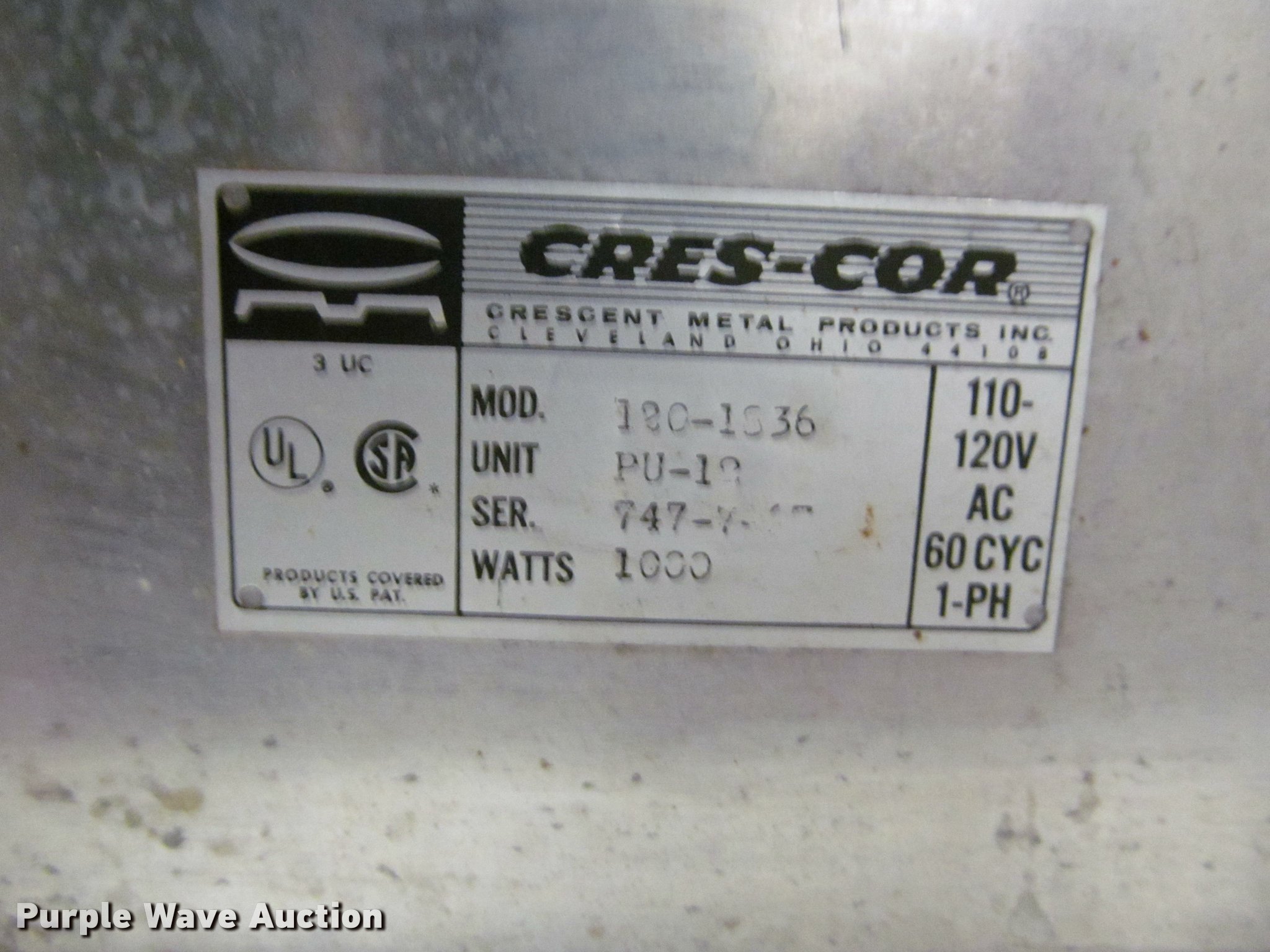 Purple Wave is selling a used Restaurant Equip. in Kansas. This item is a (2) CresCor warming cabinets with the following: Model 120-1530, 1,000 watts, Serial 747-748, Non-operational unit, Model 0747044, 2,000 watts, Serial FJE-J5826, Power cord missing, Unknown operating condition