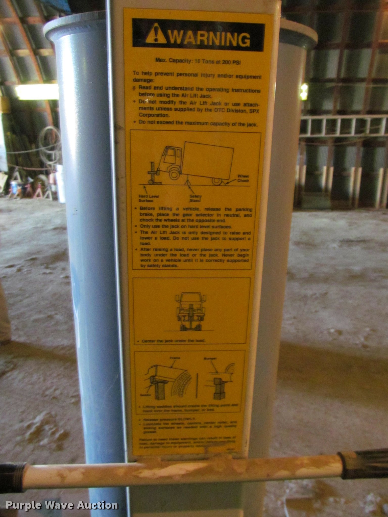 Purple Wave is selling a used Tools in Kansas. This item is a OTC air lift with the following: 10 ton capacity at 200 psi, 13" to 52" lift range, Adjustable lift arms