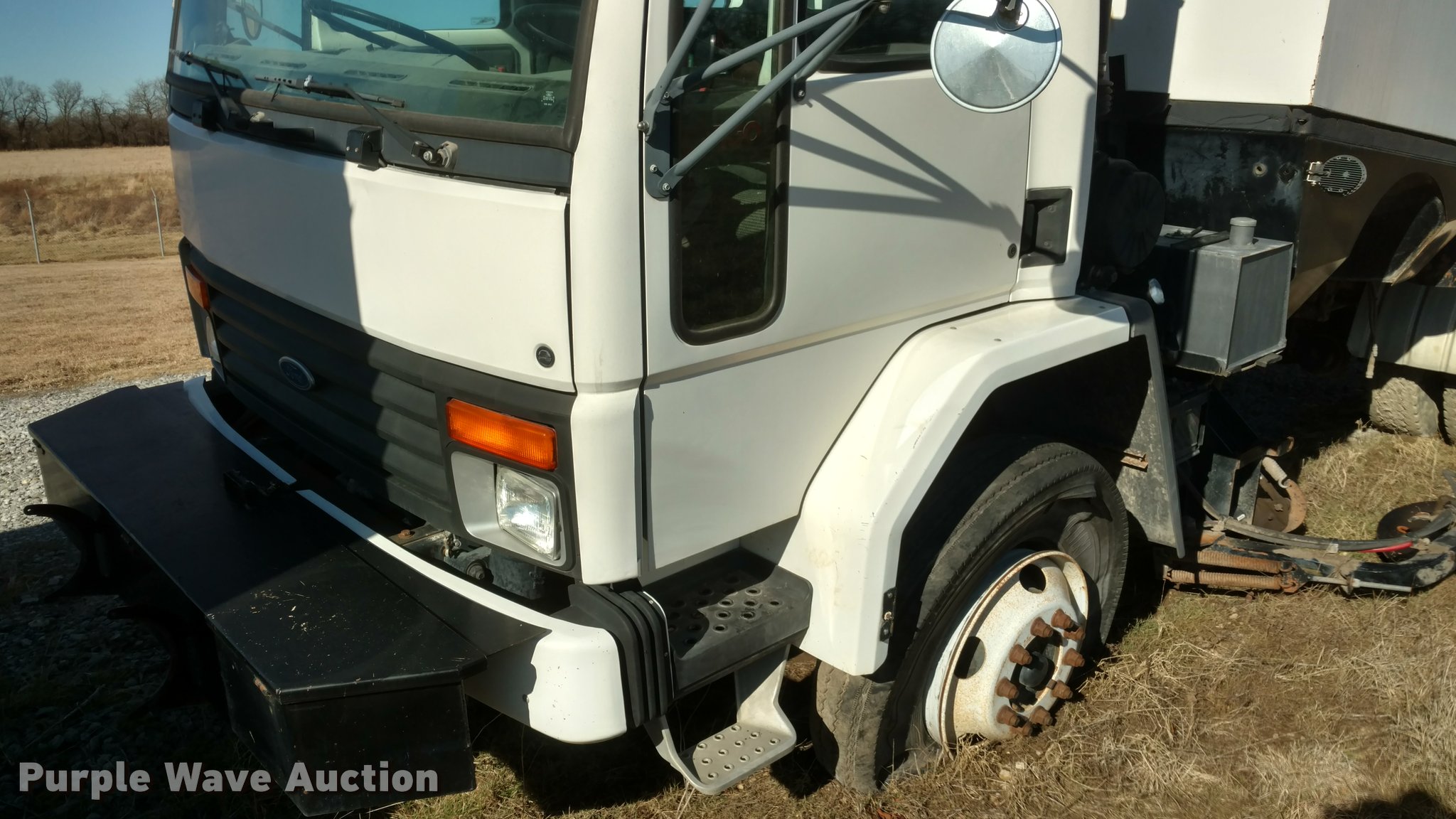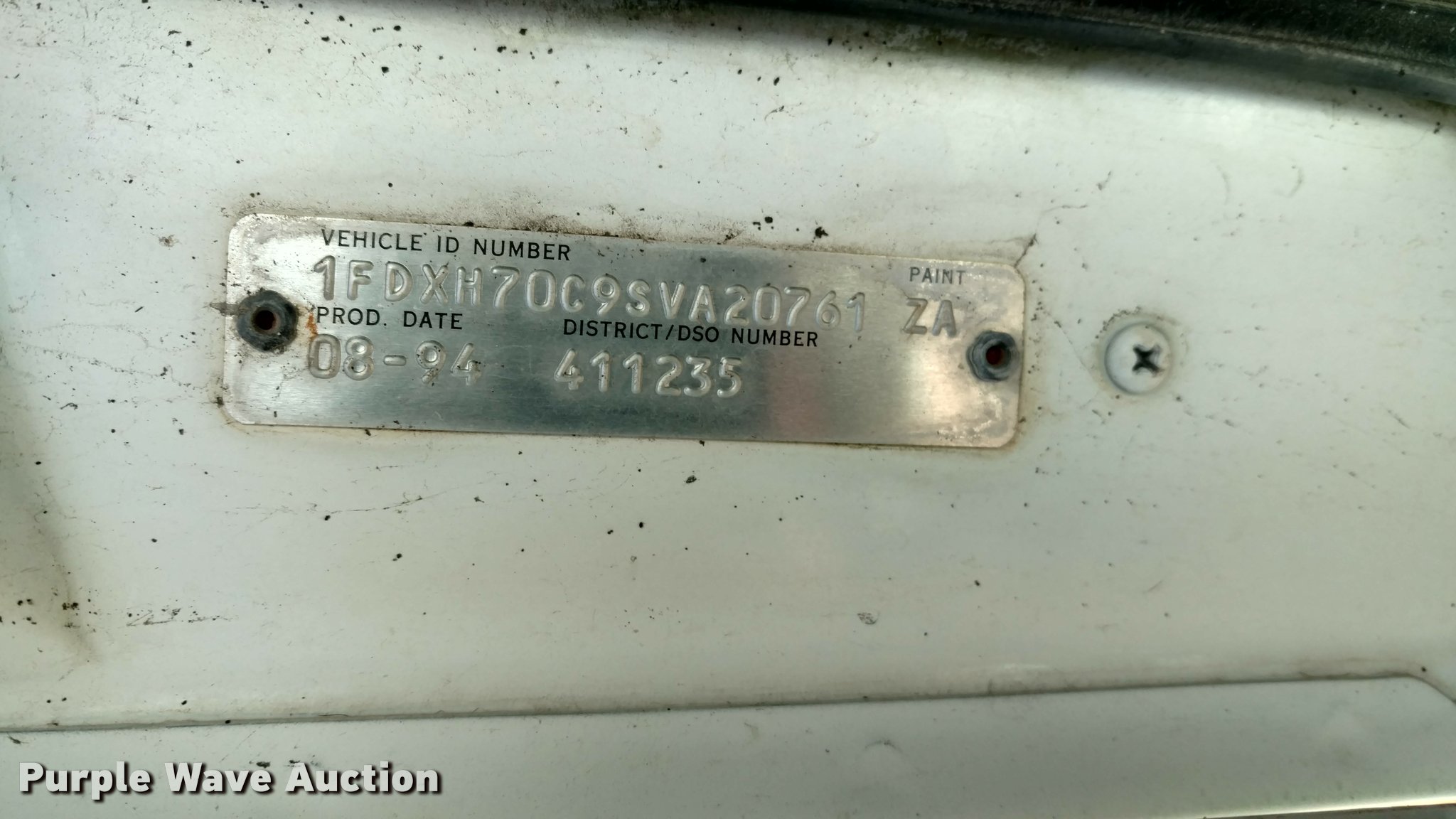 Purple Wave is selling a used Street Sweeper Truck in Kansas. This item is a 1995 Ford CF7000 Sum Vac III street sweeper truck with the following: 62,581 miles on odometer, 9,693 hours on meter, Cummins ISB 5.9L L6 diesel engine, Automatic transmission, Heat, Manual windows and locks, Cloth interior, Sum-Vac bed, Serial 94-125700, 11R22.5 tires, Parts missing, Non-operational unit, Vac drum in bed needs to be replaced, Unit has sat for two years