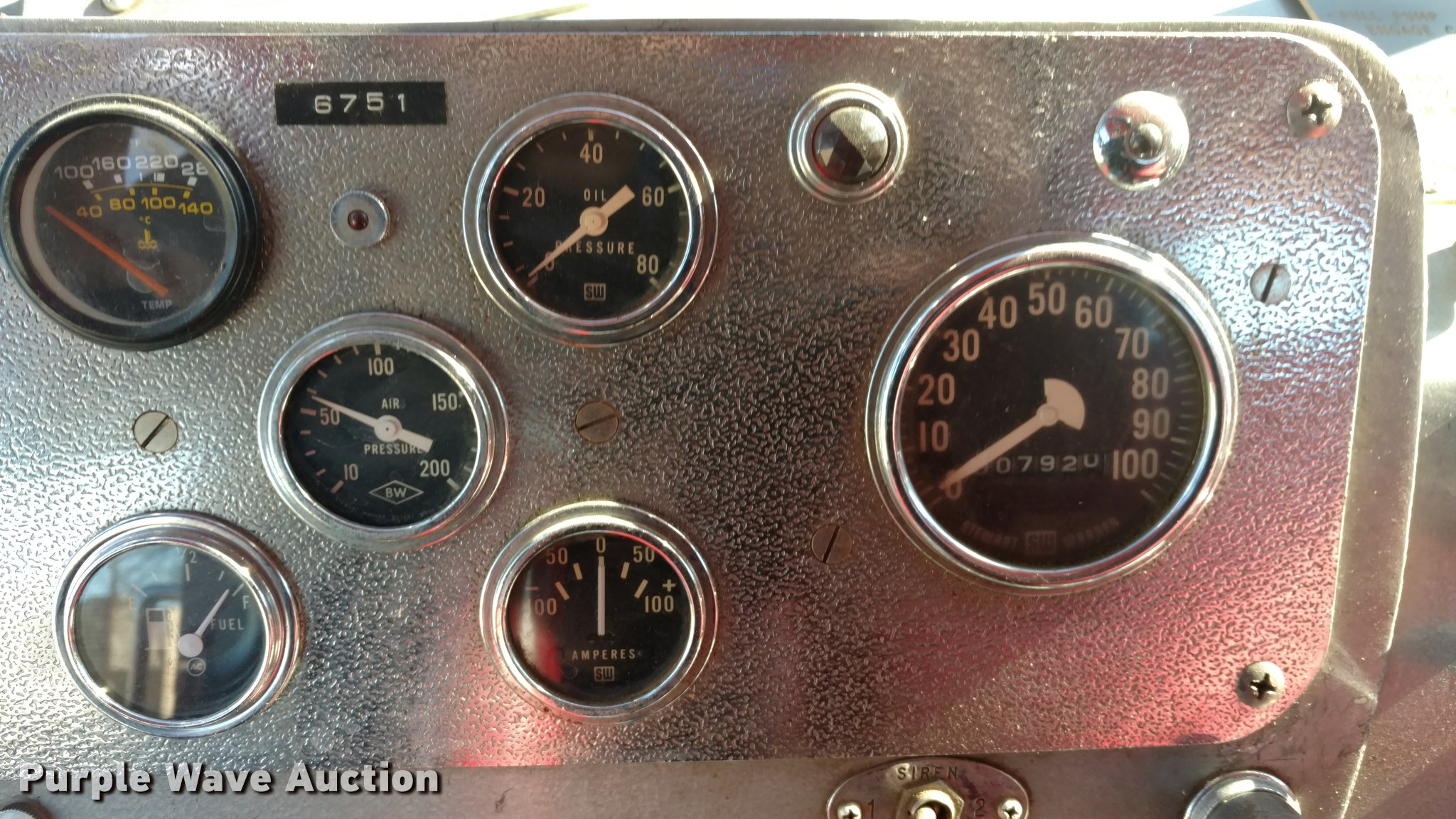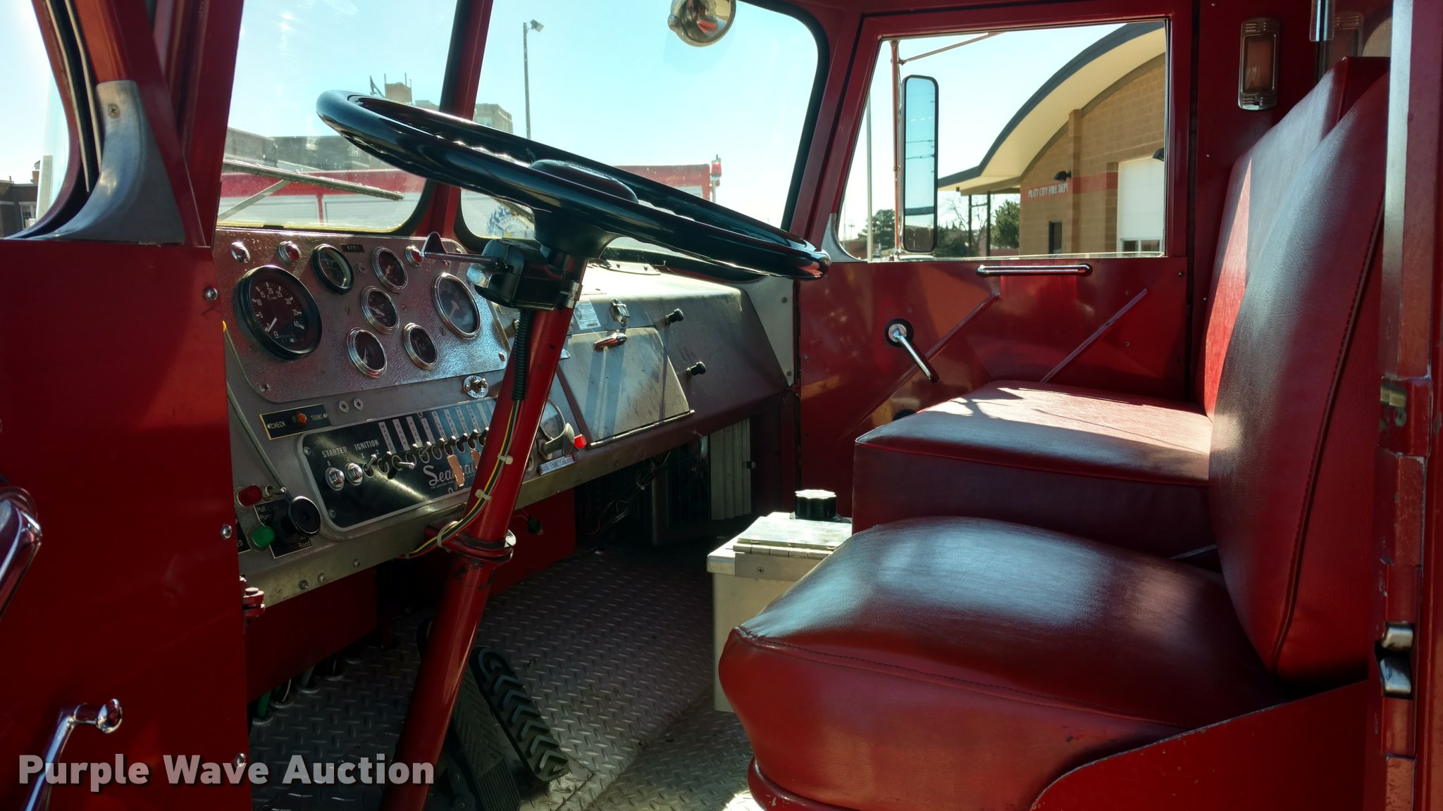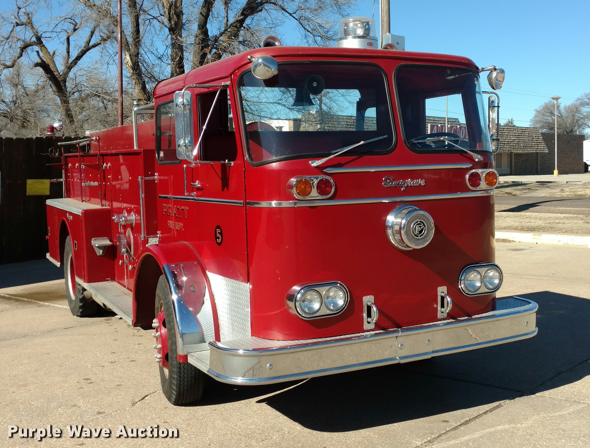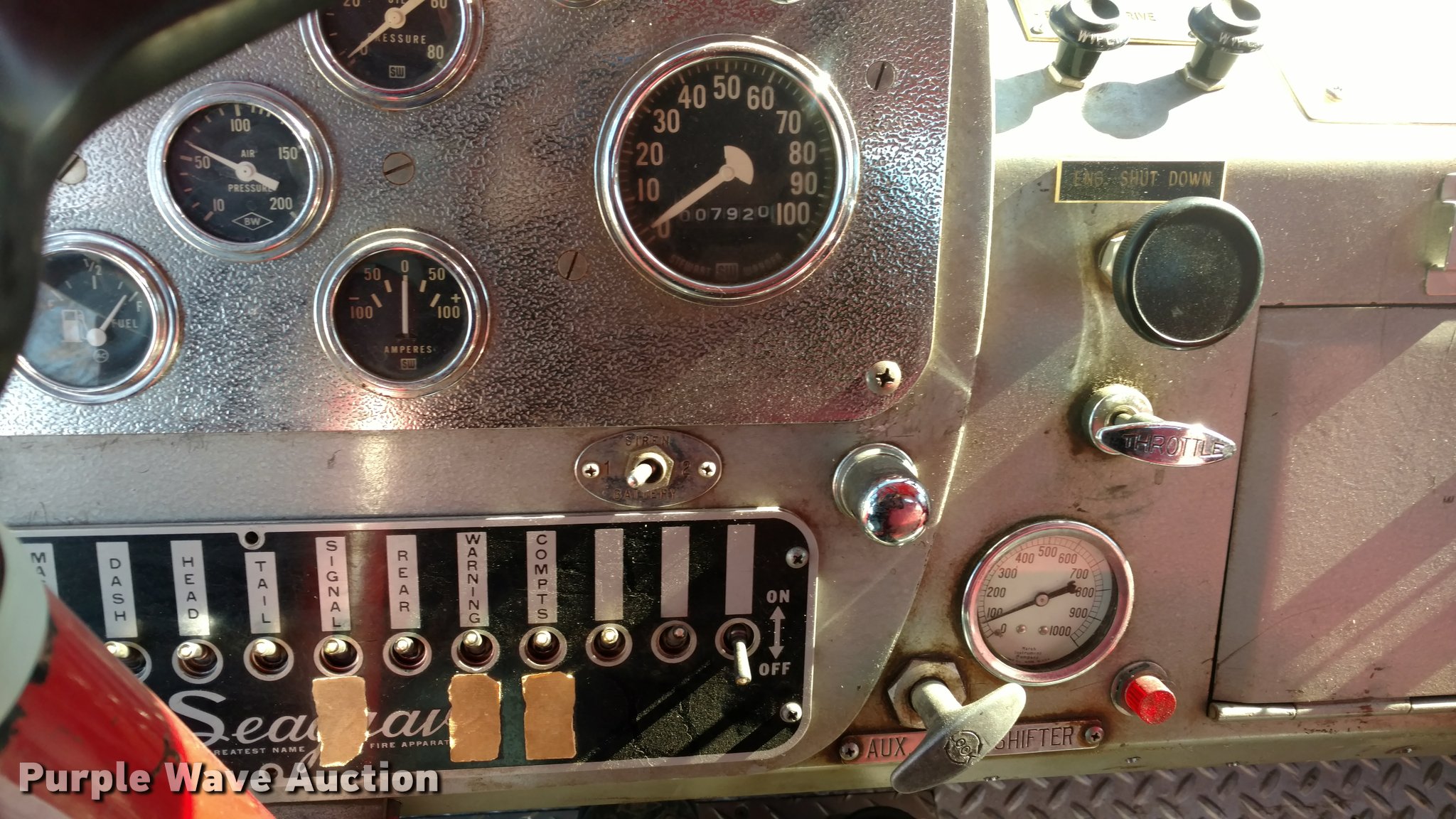 Purple Wave is selling a used Fire Truck or Emergency Vehicle in Kansas. This item is a Seagrave fire truck with the following: 7,920 miles on odometer, 974 hours on meter, Detroit Diesel diesel engine, Automatic transmission, Manual windows and locks, Vinyl interior, (2) sections of hard suction hoses, Booster lines, 1,000 gpm pump, 10.3-20 front tires, 9.00-20 rear tires, Power steering issues, Serial P-9145