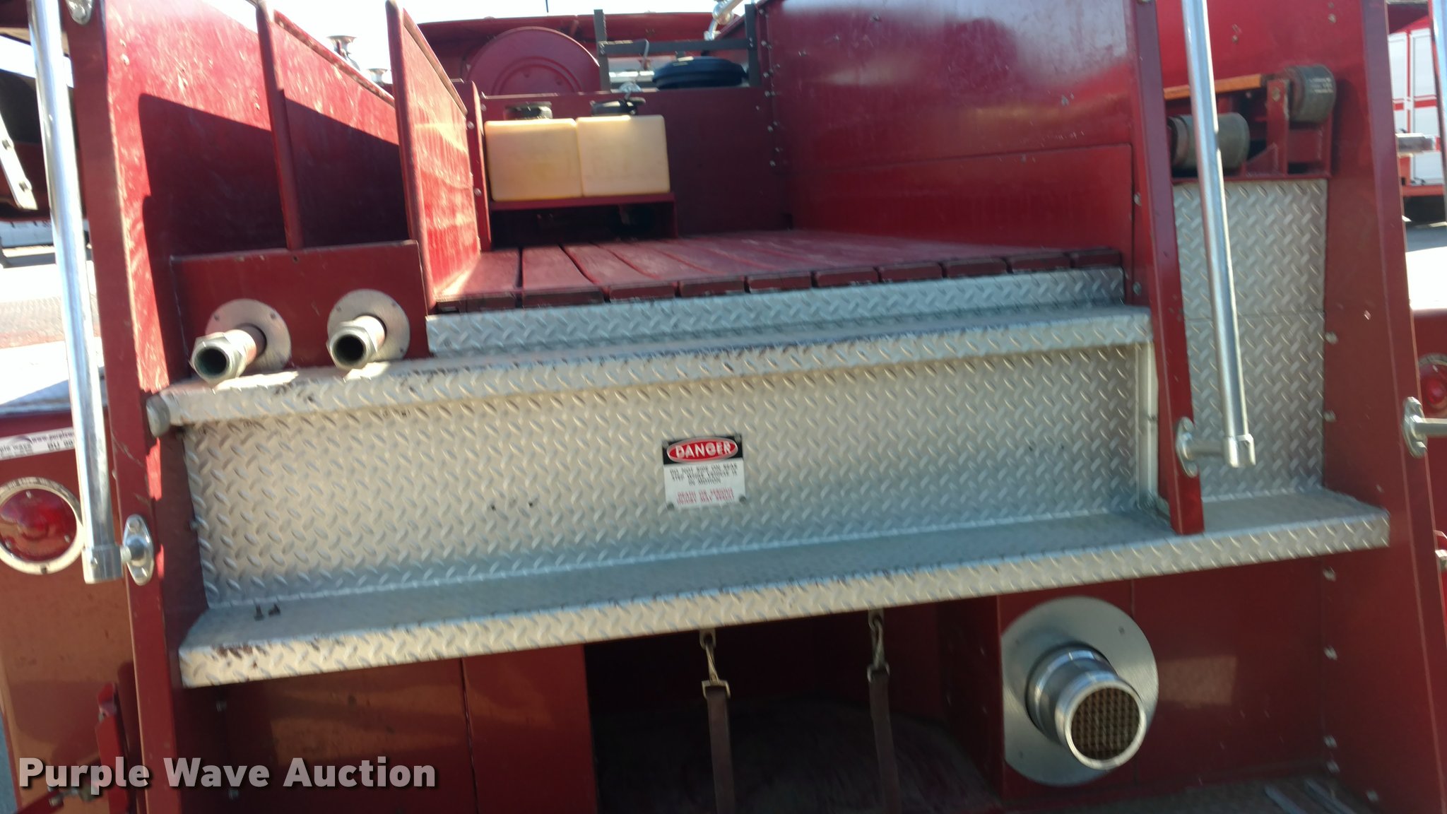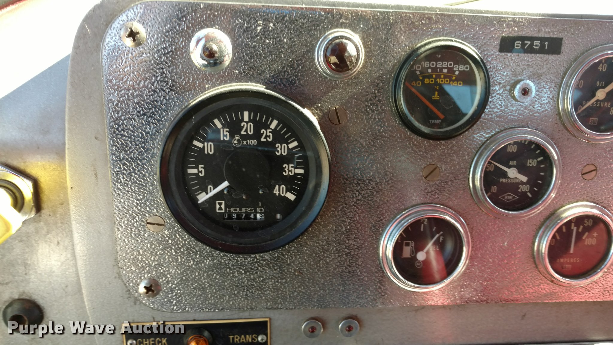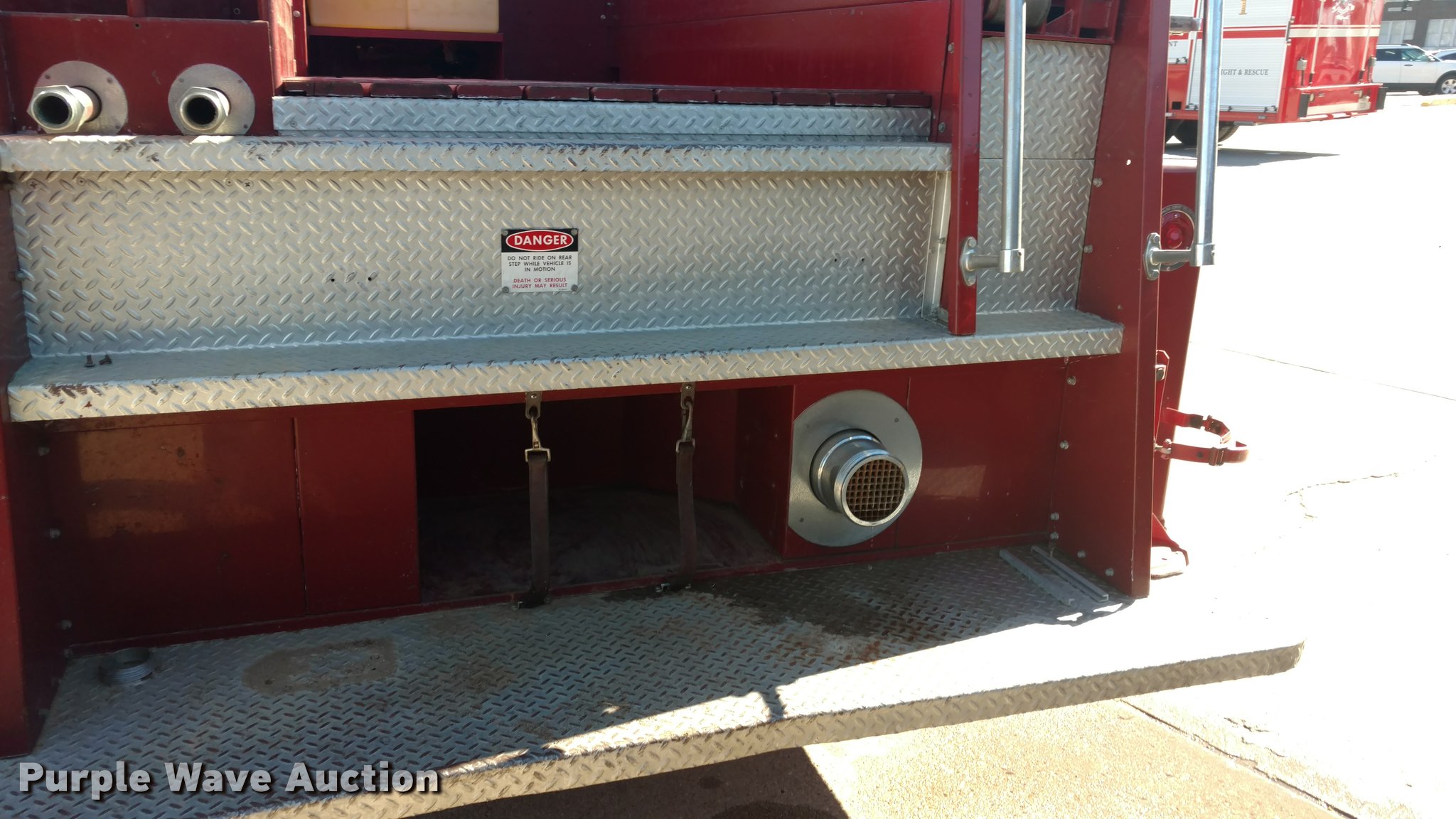 Purple Wave is selling a used Fire Truck or Emergency Vehicle in Kansas. This item is a Seagrave fire truck with the following: 7,920 miles on odometer, 974 hours on meter, Detroit Diesel diesel engine, Automatic transmission, Manual windows and locks, Vinyl interior, (2) sections of hard suction hoses, Booster lines, 1,000 gpm pump, 10.3-20 front tires, 9.00-20 rear tires, Power steering issues, Serial P-9145