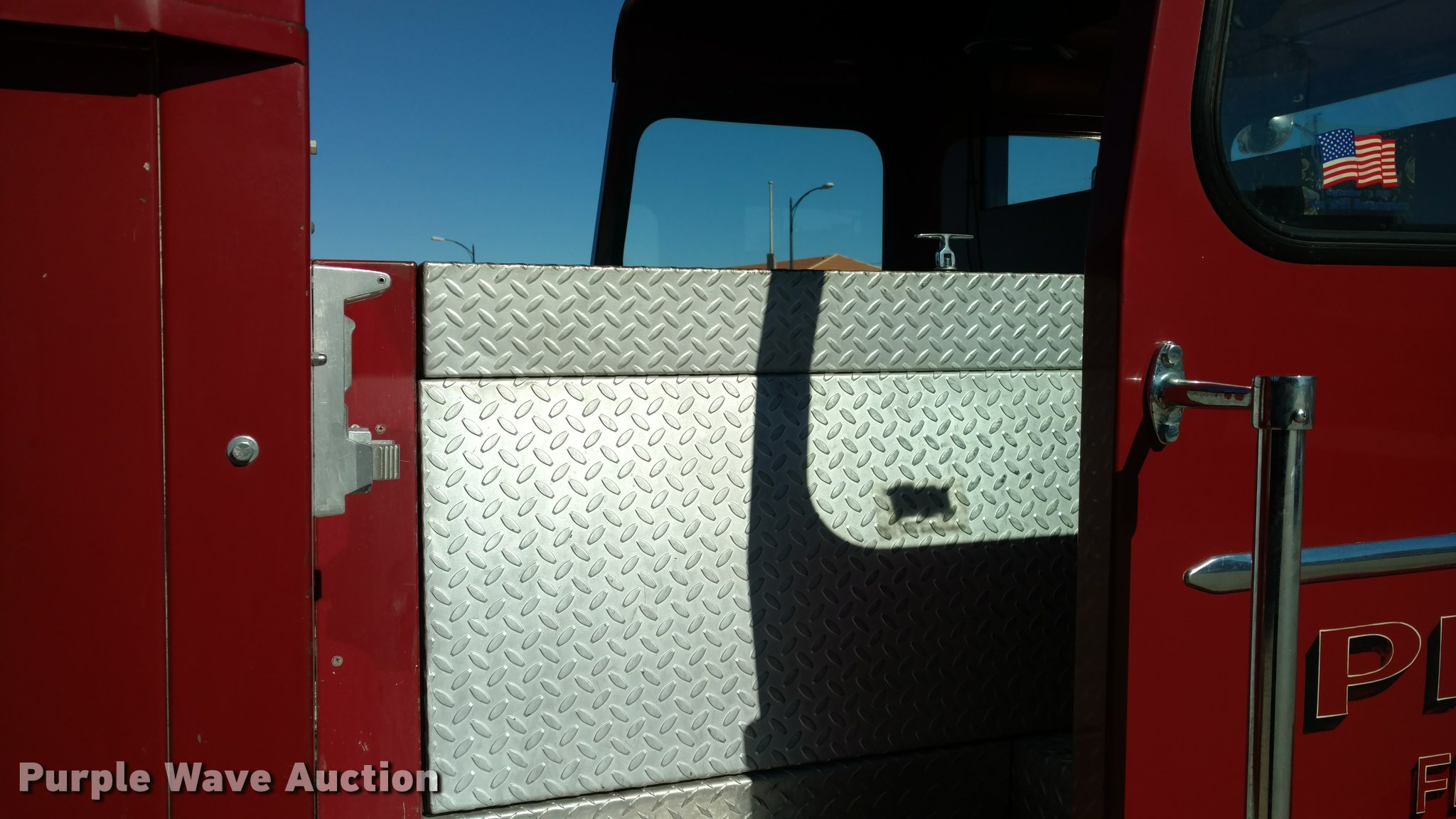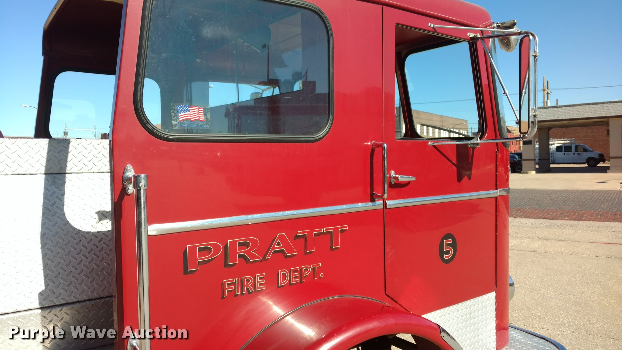Seagrave fire truck. 7,920 miles on odometer, 974 hours on meter, Detroit Diesel diesel engine, Automatic transmission, Manual windows and locks, Vinyl interior, (2) sections of hard suction hoses, Booster lines, 1,000 gpm pump, 10.3-20 front tires, 9.00-20 rear tires, Power steering issues, Serial P-9145. Transfer of ownership documentation will be a bill of sale. City of Pratt. Pratt, KS 67124