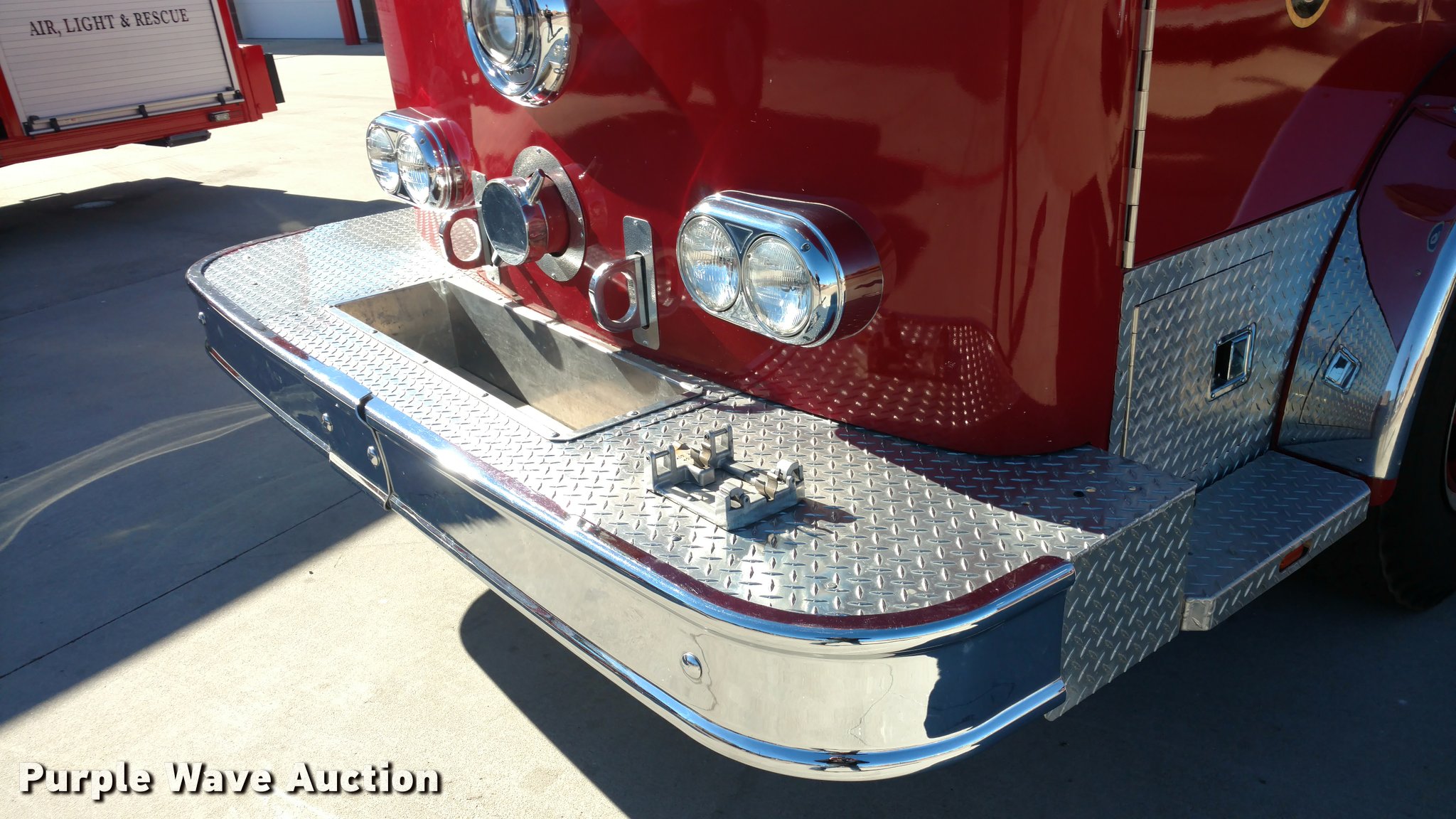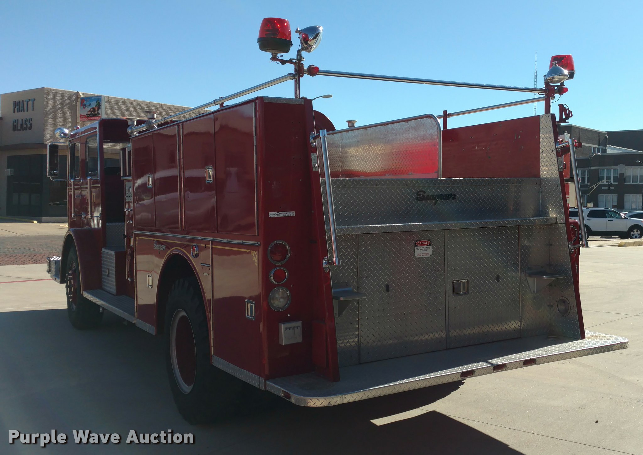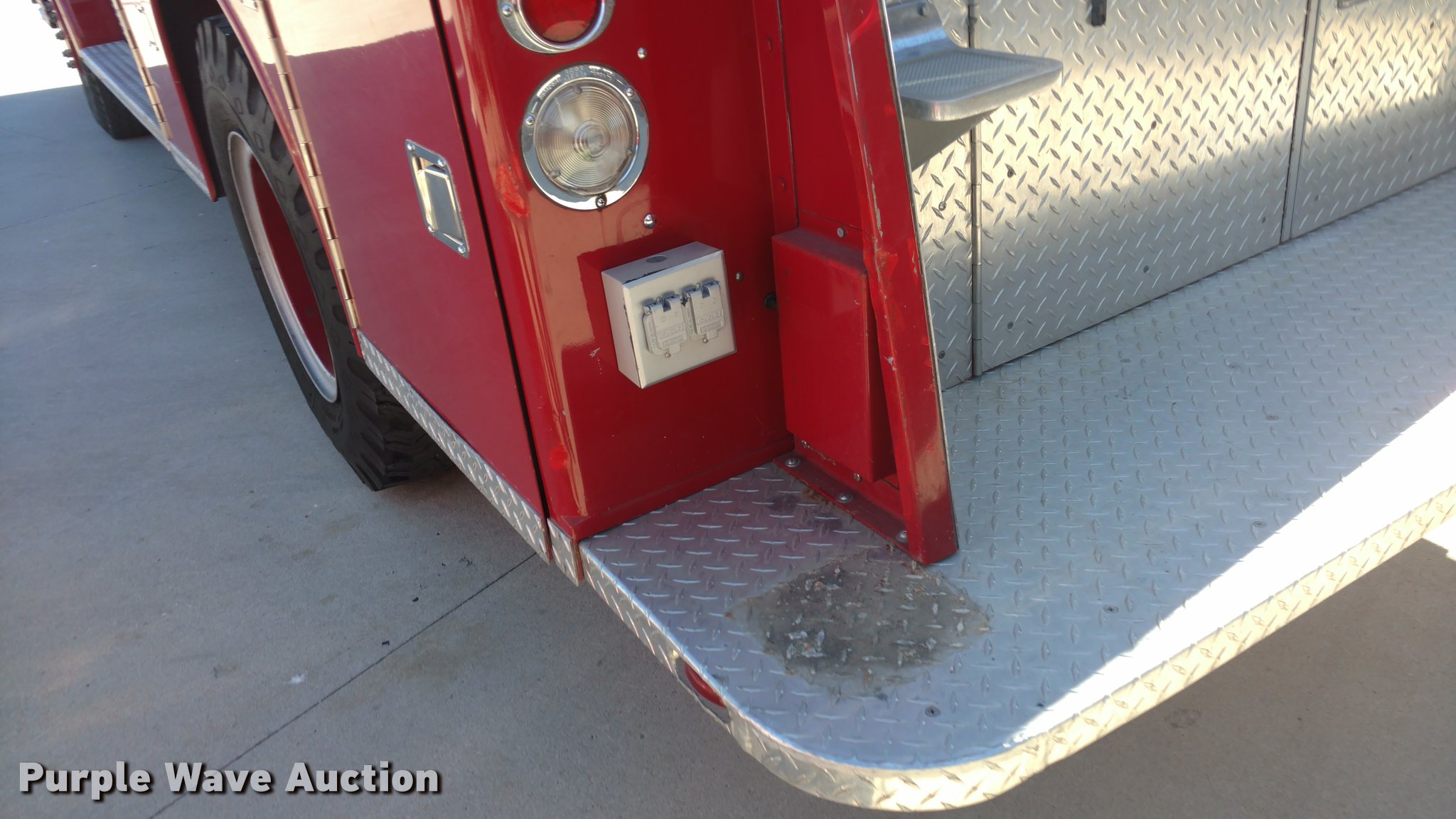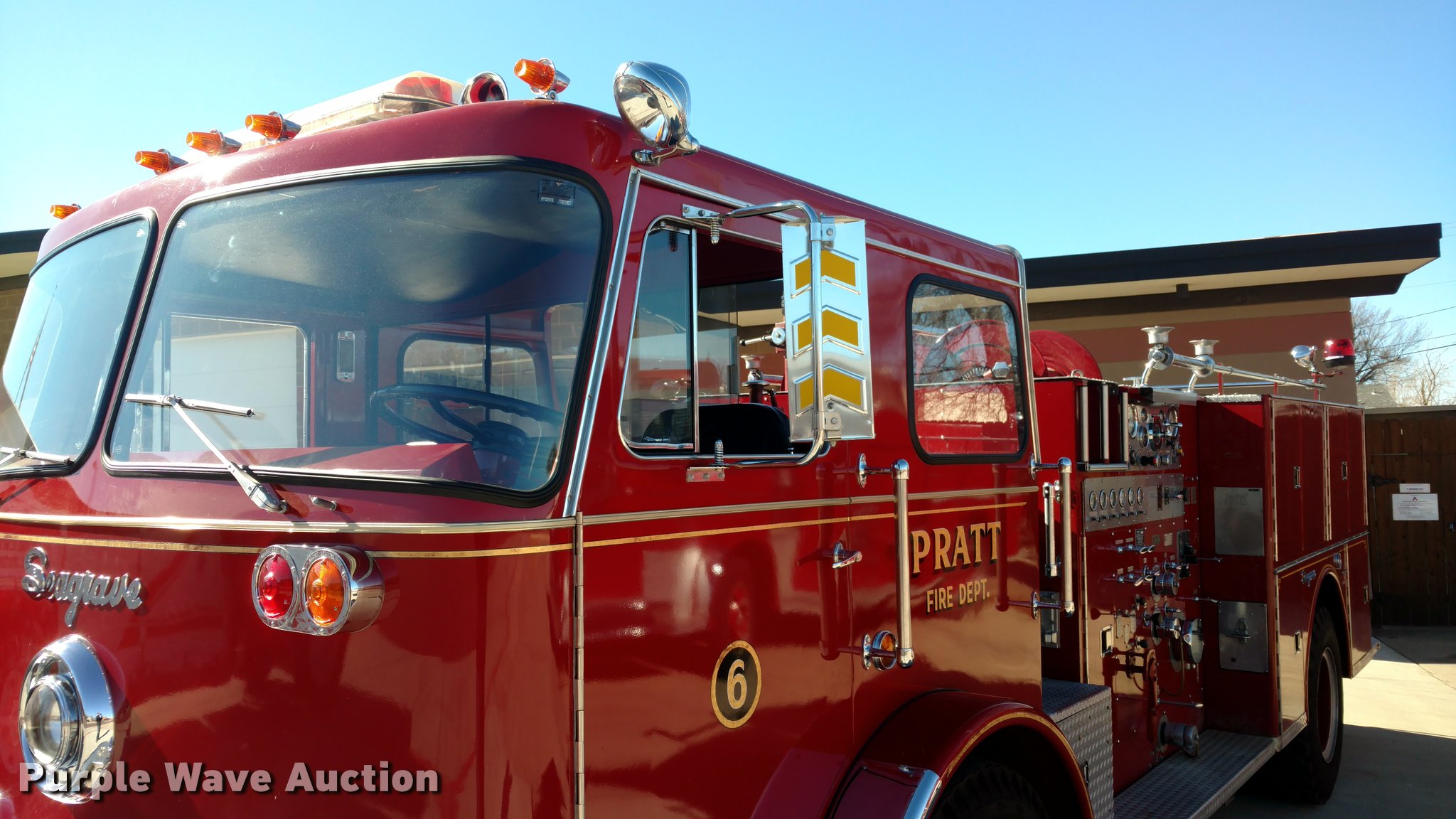 Seagrave fire truck. 16,674 miles on odometer, 880 hours on meter, Detroit Diesel diesel engine, Five speed manual transmission, Manual windows and locks, Vinyl interior, 1,000 gpm pump, 11.00R20 tires, No power steering, Intermittent brake issues, Serial H-73749. Transfer of ownership documentation will be a bill of sale. City of Pratt. Pratt, KS 67124