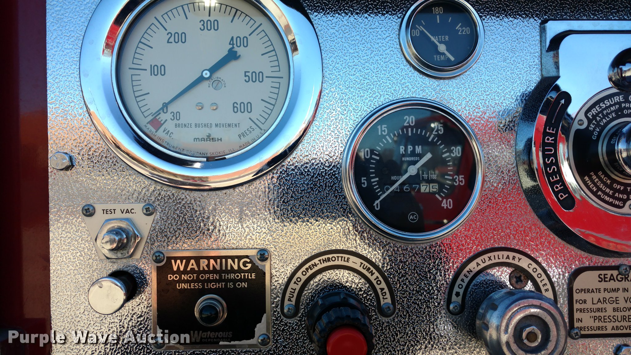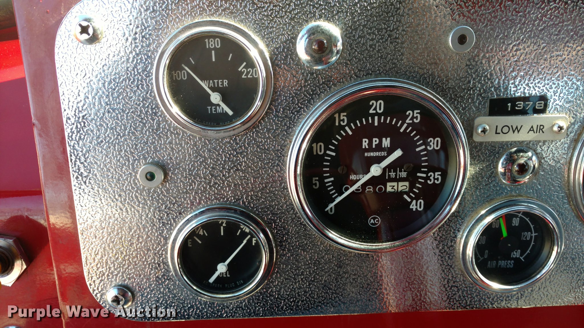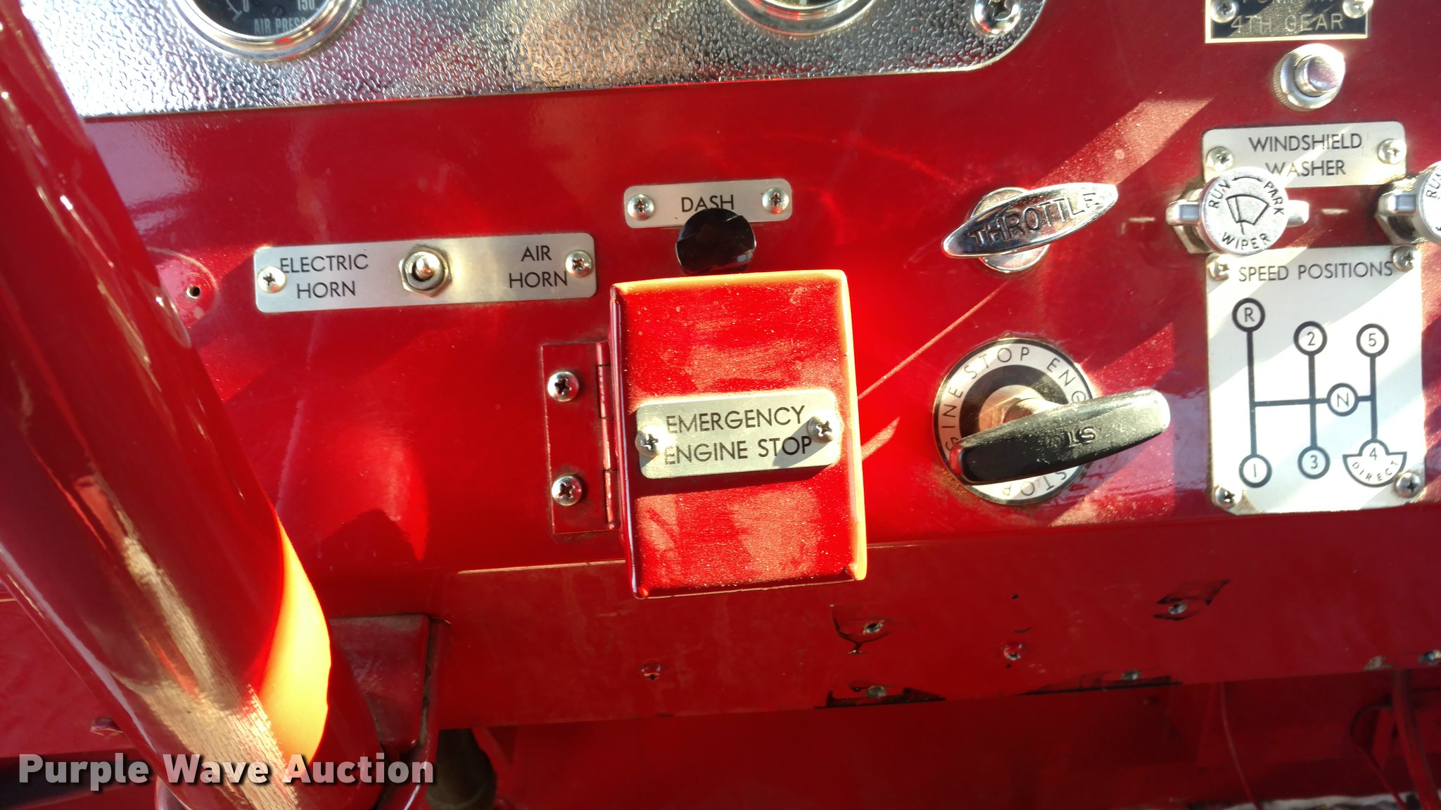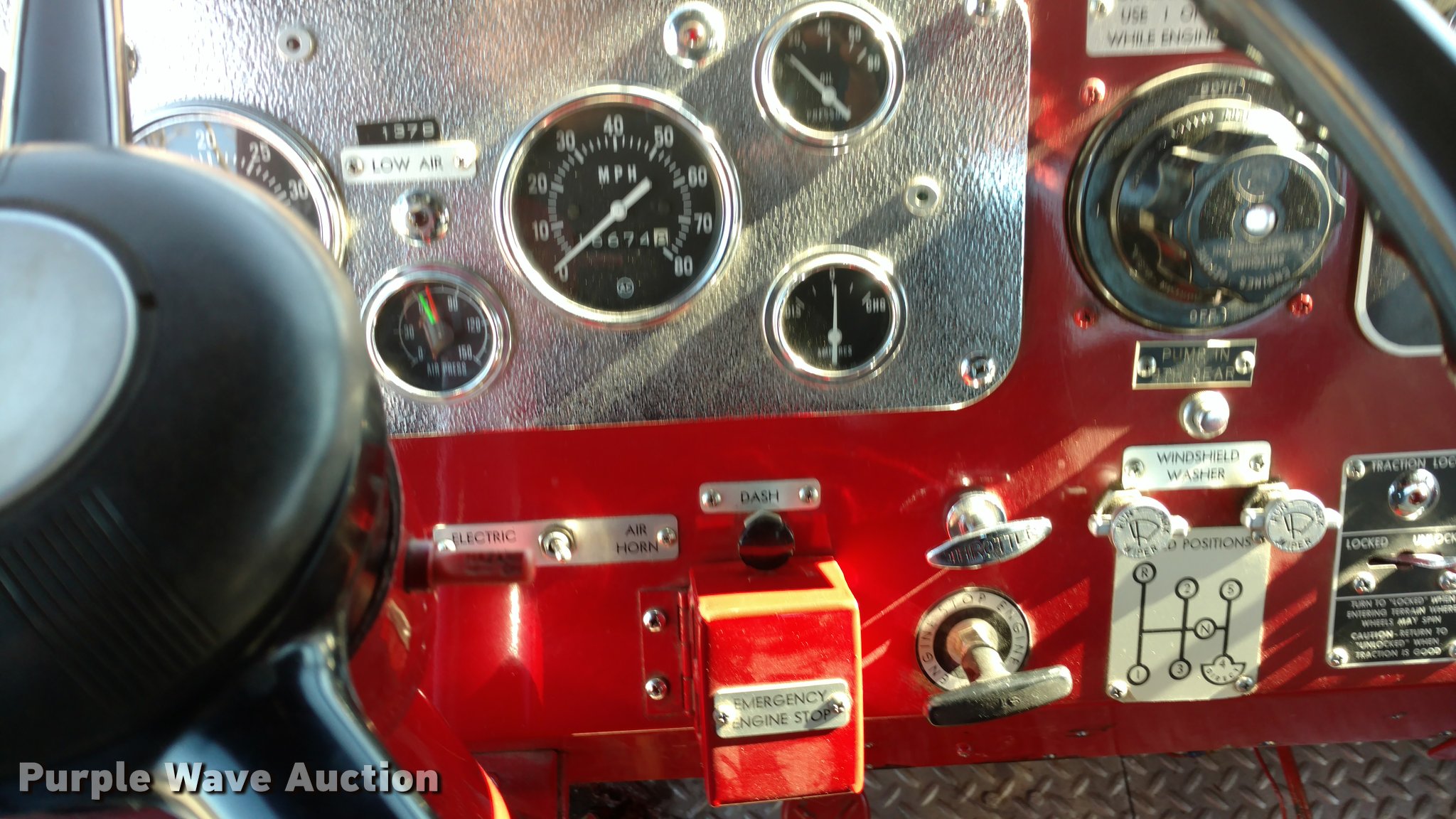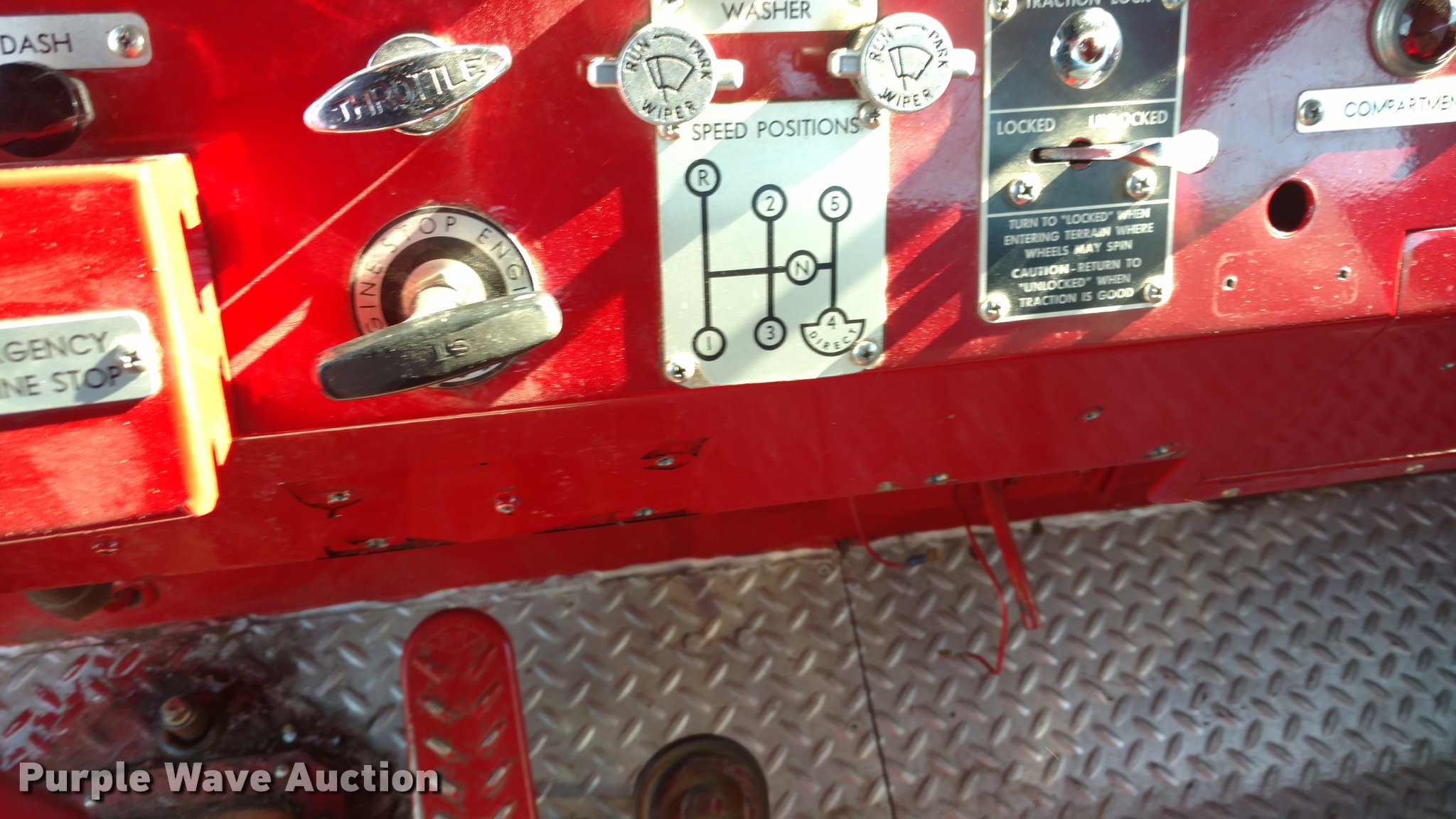 Purple Wave is selling a used Fire Truck or Emergency Vehicle in Kansas. This item is a Seagrave fire truck with the following: 16,674 miles on odometer, 880 hours on meter, Detroit Diesel diesel engine, Five speed manual transmission, Manual windows and locks, Vinyl interior, 1,000 gpm pump, 11.00R20 tires, No power steering, Intermittent brake issues, Serial H-73749