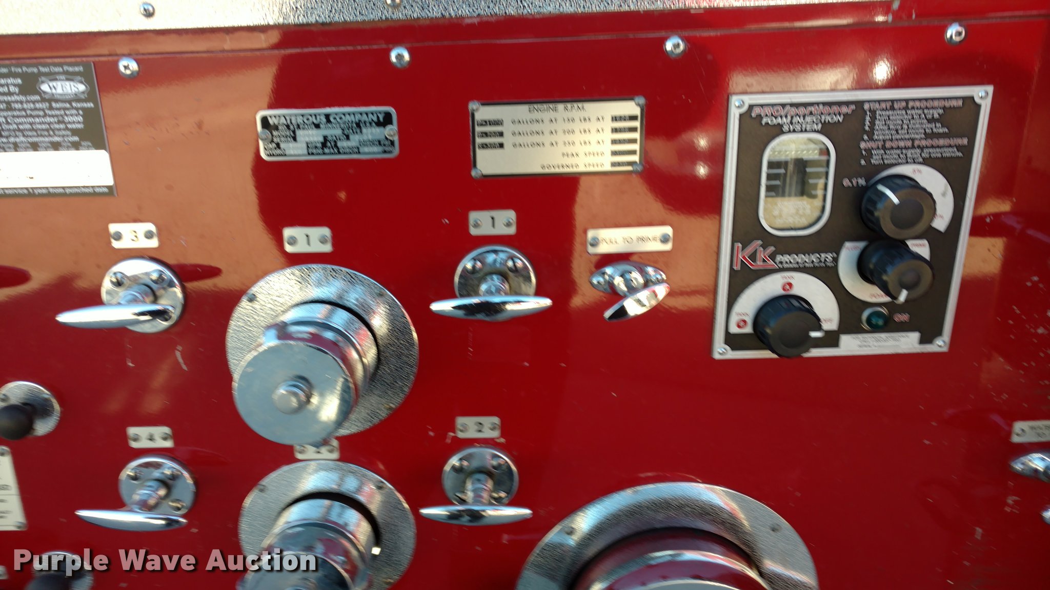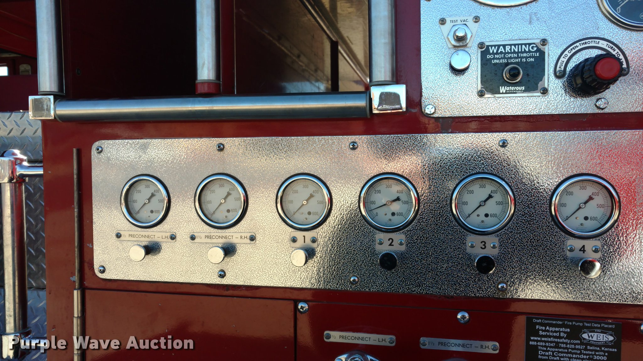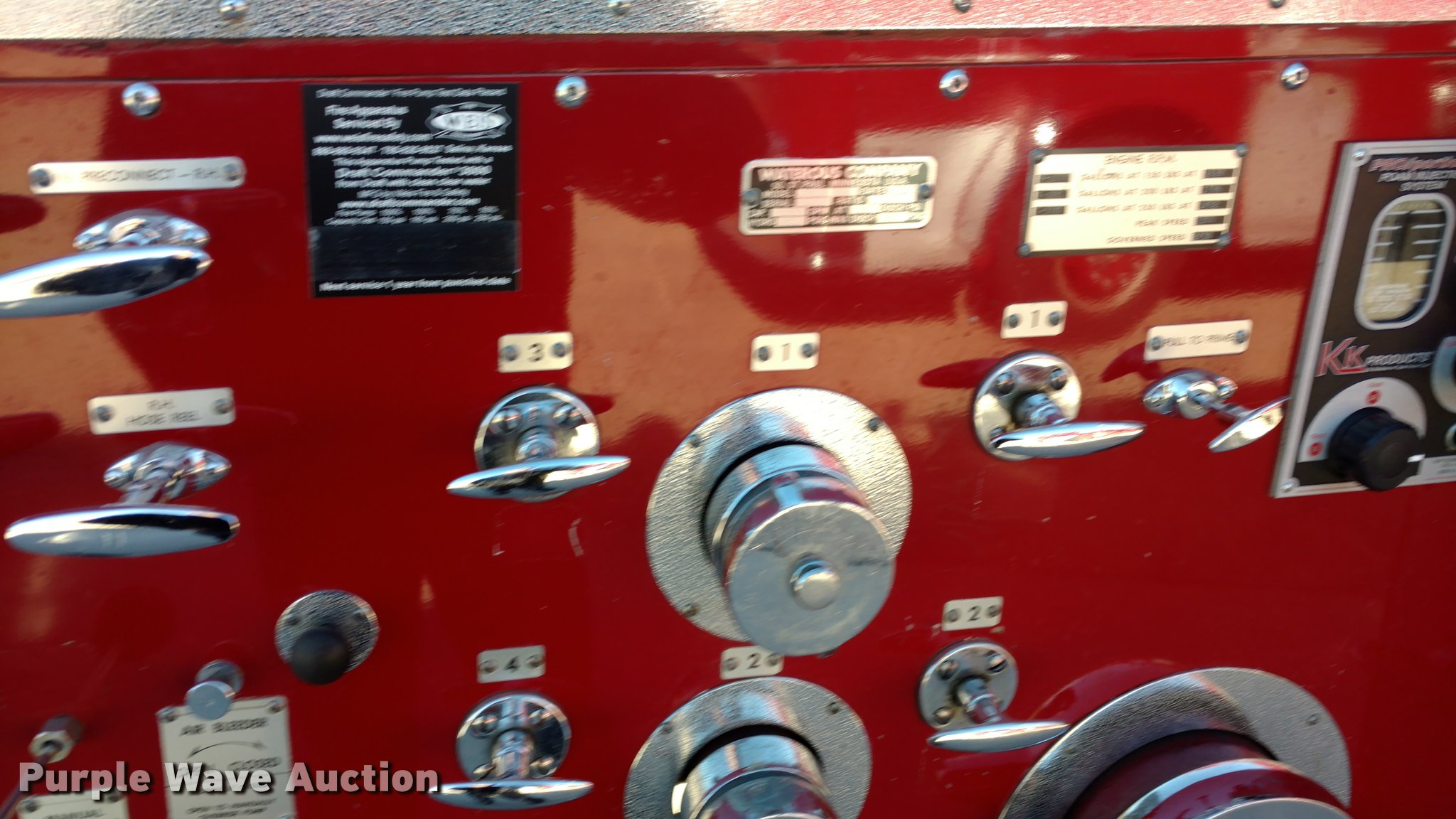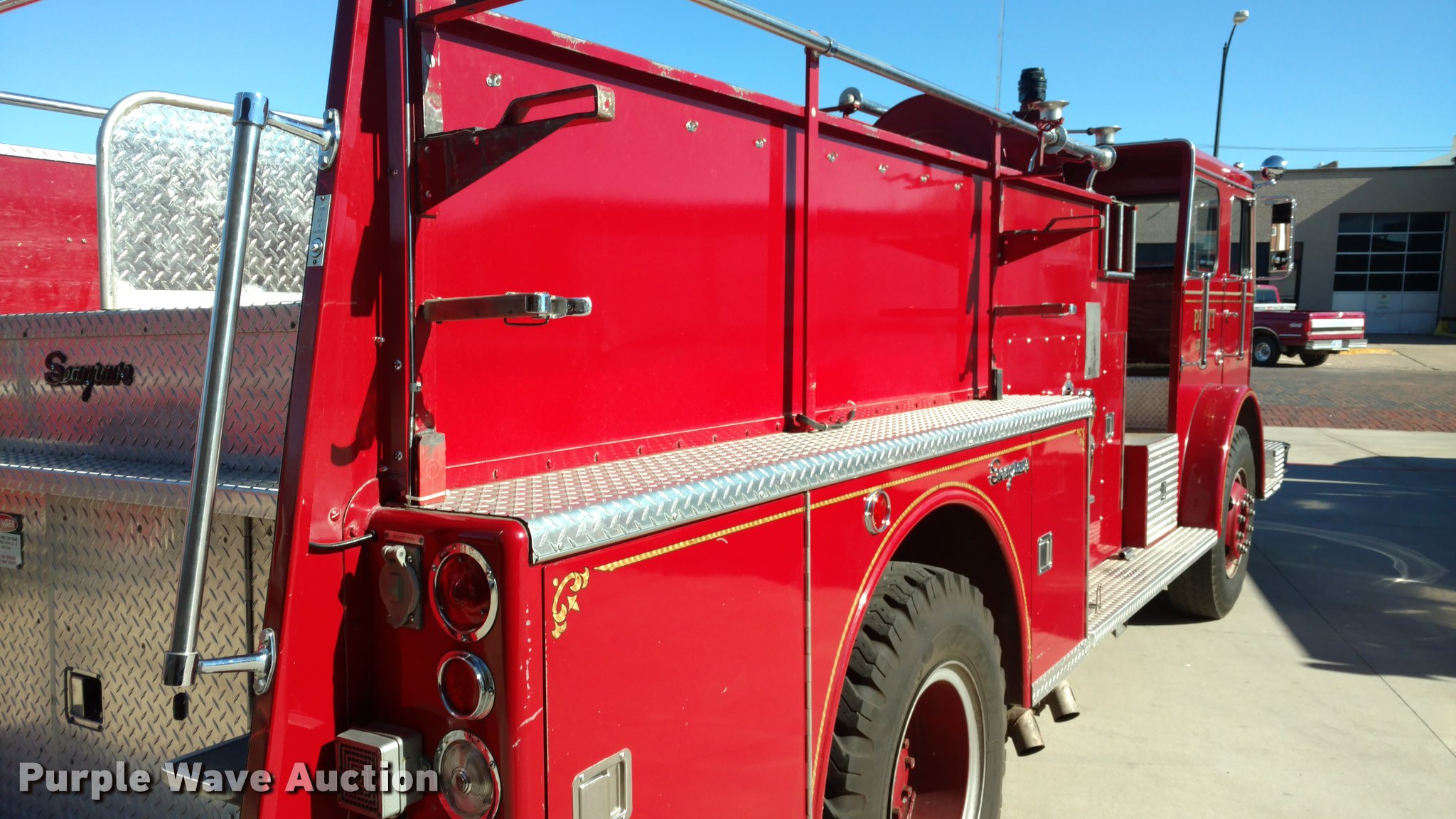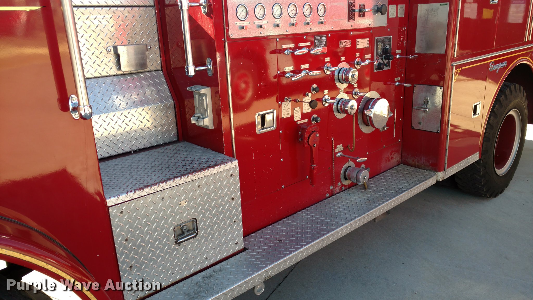 Purple Wave is selling a used Fire Truck or Emergency Vehicle in Kansas. This item is a Seagrave fire truck with the following: 16,674 miles on odometer, 880 hours on meter, Detroit Diesel diesel engine, Five speed manual transmission, Manual windows and locks, Vinyl interior, 1,000 gpm pump, 11.00R20 tires, No power steering, Intermittent brake issues, Serial H-73749