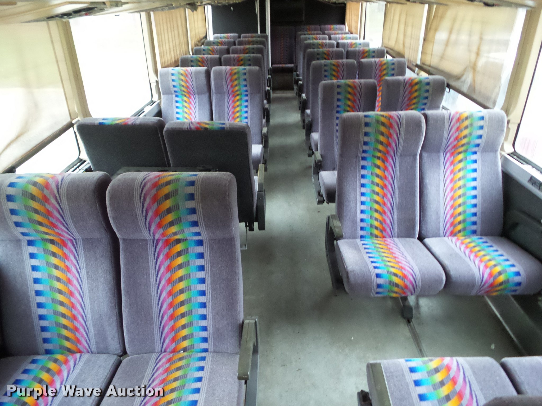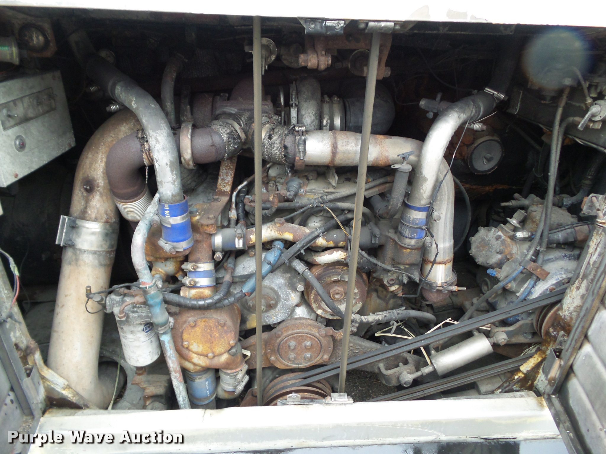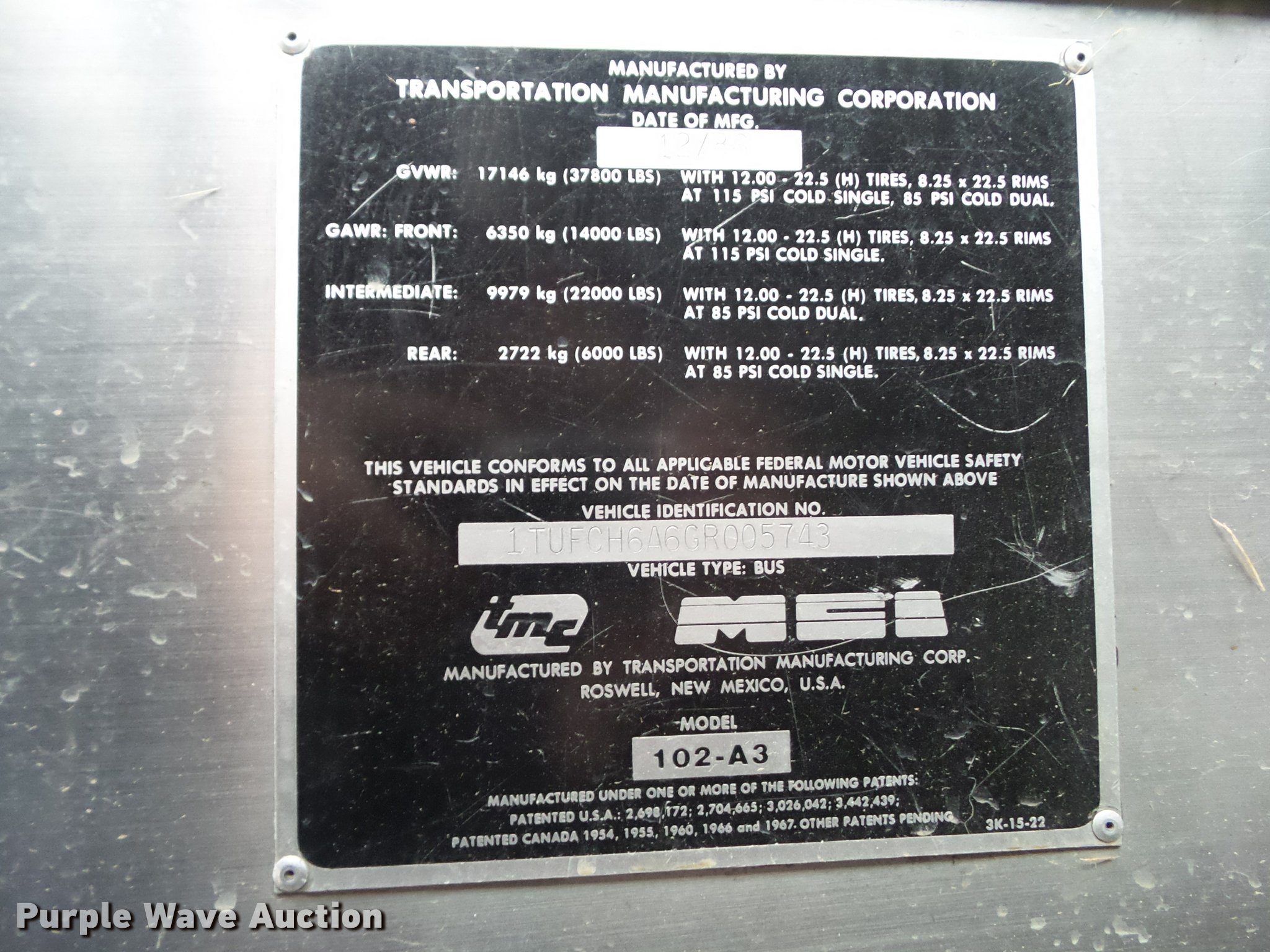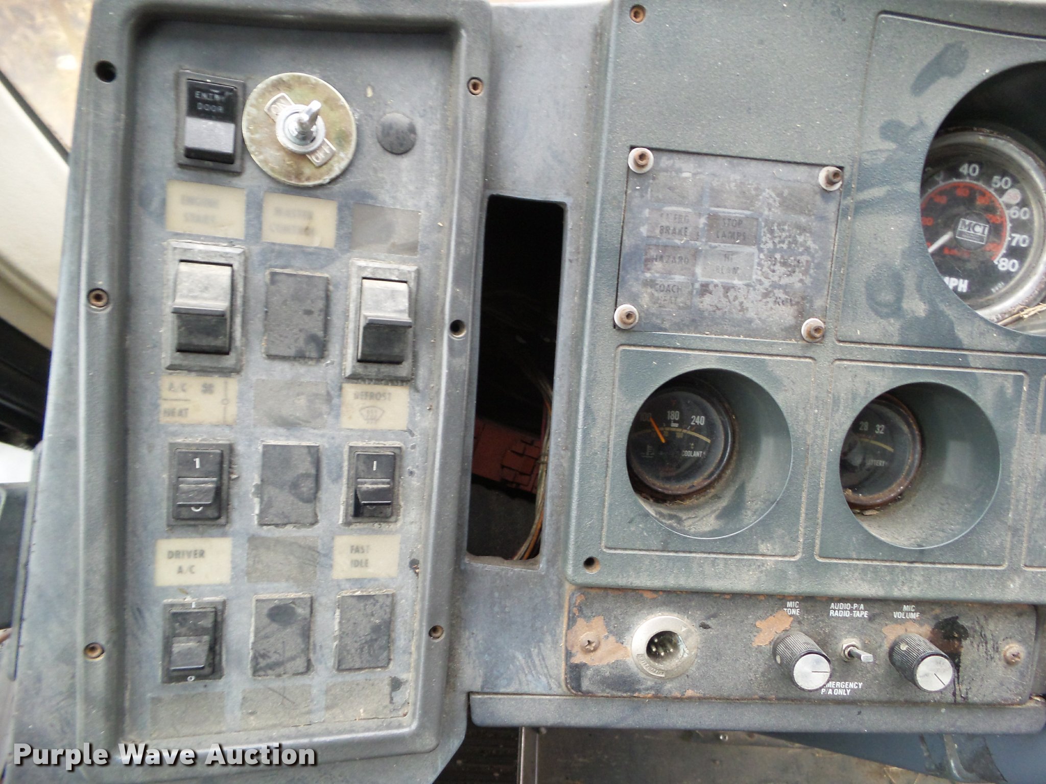 Purple Wave is selling a used Bus in Iowa. This item is a 1986 MCI 102A3 bus with the following: Detroit Diesel 6V-92TA 9.0L L6 turbo diesel engine, Automatic transmission, Tandem axle, AC and heat, 47 passenger capacity, On-board restroom, Overhead storage, Stanley 800 watt converter, GE refrigerator, Ceiling and side emergency exits, Underside luggage storage, 285" wheelbase, Air suspension, Air brakes, Goodyear 315/80R22.5 tires, Window cracked, No odometer