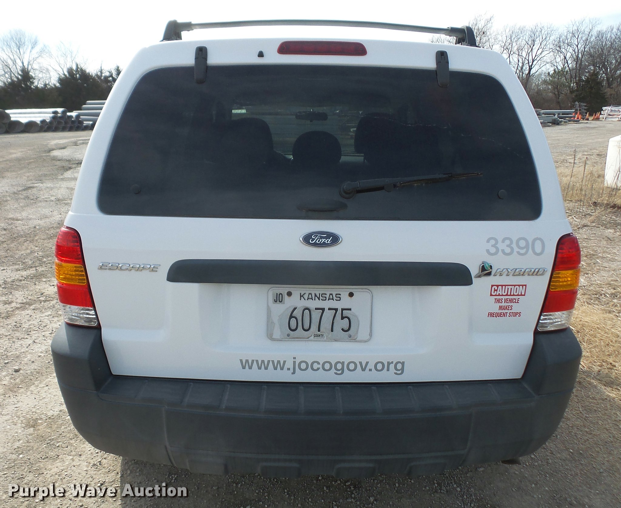 2005 Ford Escape Hybrid SUV. 87,480 miles on odometer, 2.3L L4 DOHC 16V hybrid gas engine, Automatic transmission, AC and heat, Tilt, Cruise, AM/FM/CD, Power windows, locks, mirrors, and seat, Cloth interior, 235/70R16 tires, Decals will be removed prior to auction, Brake issues, ABS brake controller needs replaced, Unit# APR3390. Kansas title. Title distribution may be delayed up to 14 days from verification of funds. 1FMYU96H65KD54587. Johnson County. 1810 W Old Hwy 56. Olathe, KS 66061