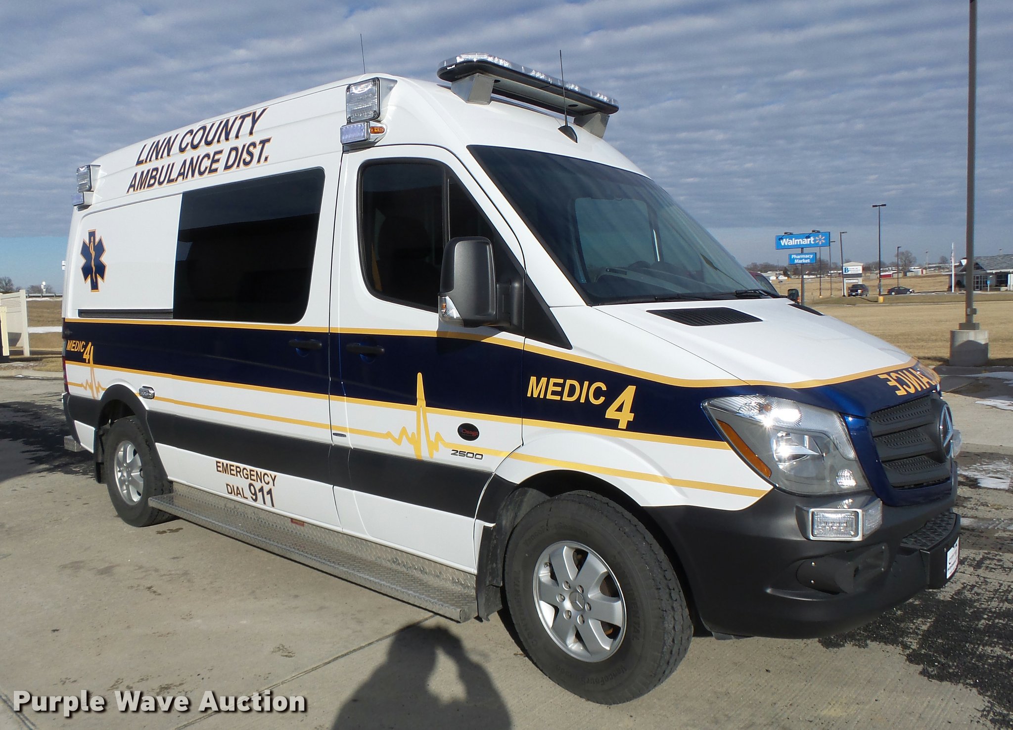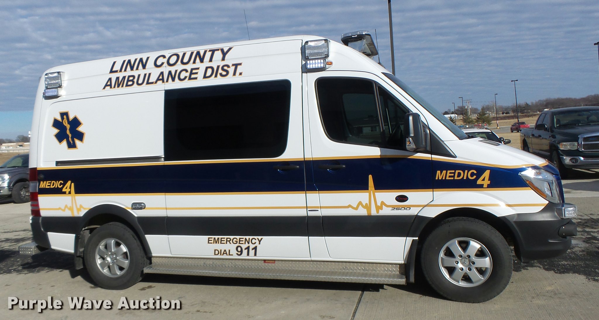 Purple Wave is selling a used Fire Truck or Emergency Vehicle in Missouri. This item is a 2015 Mercedes Benz Sprinter 2500 ambulance by Osage with the following: 55,235 miles on odometer, 194 hours on meter, 3.0L V6 DOHC 24V turbo diesel engine, Automatic transmission, Single axle, AC and heat, AM/FM, Power windows and locks, Power mirrors, Suspension seat, Backup camera, Medical Vault 5500 body, Emergency lights and sirens, LED interior lights, (2) oxygen hookups, 12v refrigerated drawer, Knox Med Vault 2 narcotics storage safe, Stryker cot mount, Continental 245/75R16 tires, Contact seller for factory warranty information