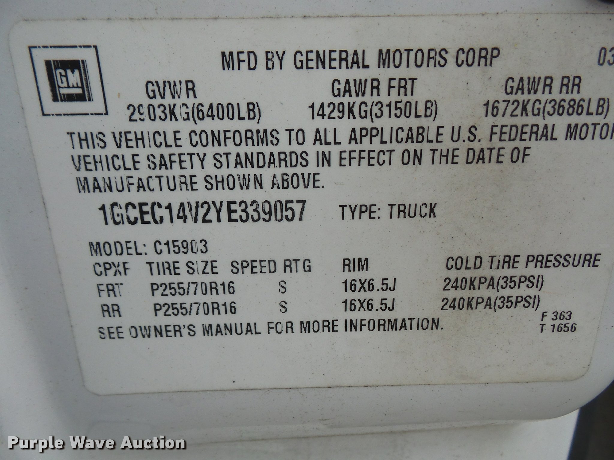 Purple Wave is selling a used 1/2 Ton Pickup or Van in Kansas. This item is a 2000 Chevrolet Silverado 1500 pickup truck with the following: 109,833 miles on odometer, 4.8L V8 OHV 16V gas engine, Automatic transmission, AC and heat, Tilt, Manual windows and locks, Cloth interior, Long bed, Tommy Gate end gate lift, Receiver hitch, 255/70R16 tires, Dead battery, Rust, Right front fender damage, Unit# 525