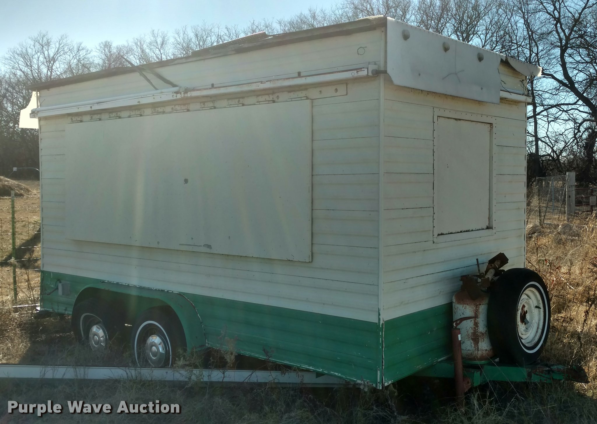 Purple Wave is selling a used Trailer Other in Kansas. This item is a 1985 Concession trailer with the following: 14.5'L x 83"W, 15" tires, Wood on floor and sides need repaired/replaced, Unit has sat for several years