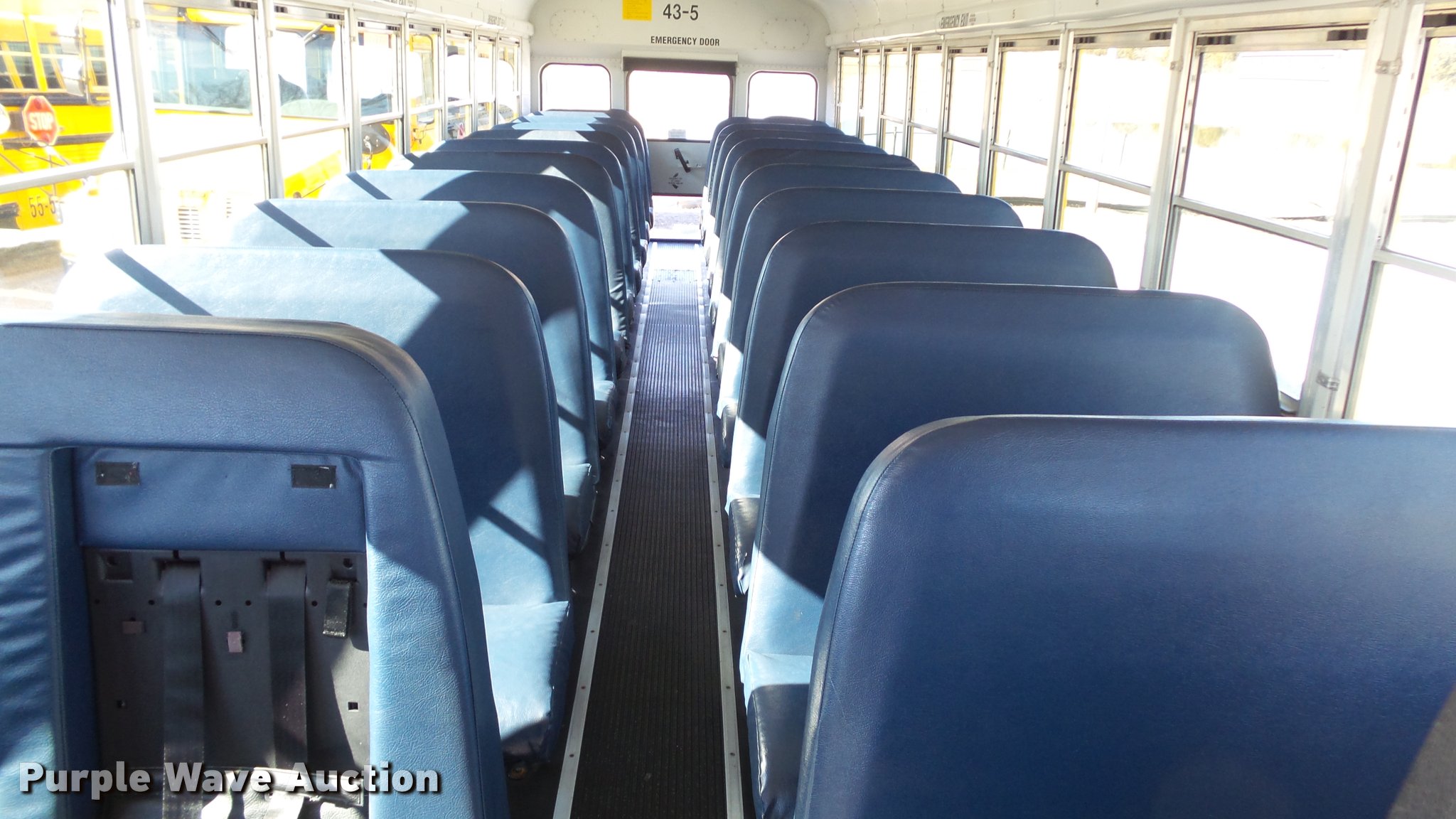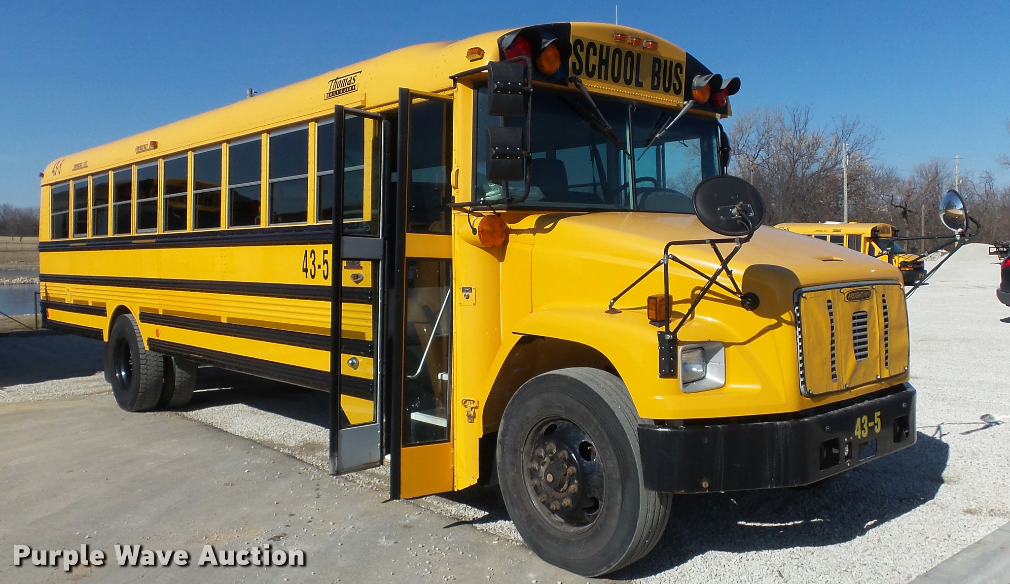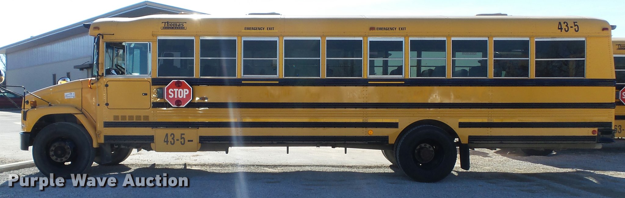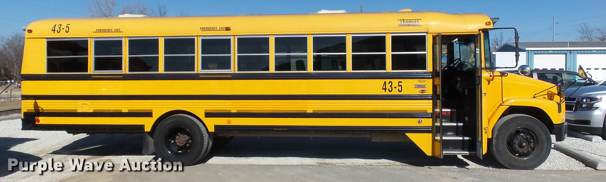 Purple Wave is selling a used Bus in Kansas. This item is a 2005 Freightliner FS65 Thomas school bus with the following: 147,437 miles on odometer, Caterpillar C7 7.2L L6 turbo diesel engine, Allison 2000 automatic transmission, Single axle, Heat, Cruise, AM/FM, Heated mirrors, Cloth drivers interior, Vinyl passenger interior, 65 passenger capacity, (2) child safety seats, Ceiling, rear, and side emergency egress, Lighted stop sign, Backup alarm, Block heater, Front and rear tow hooks, Spring suspension, Hydraulic brakes, 255" wheelbase, 11R22.5 tires, GVWR 29,999 lbs, Intake heater light on, Unit# 43-5