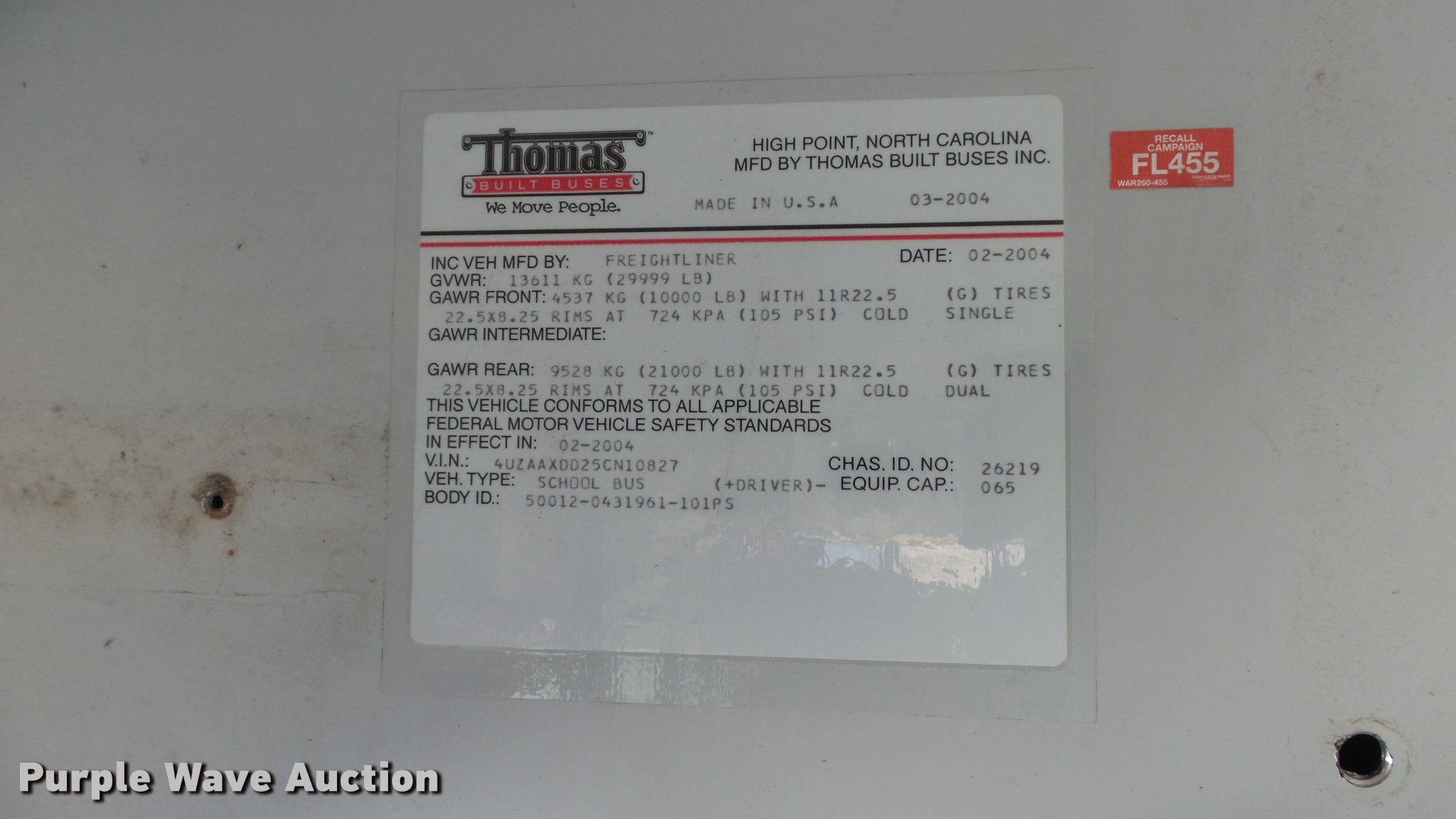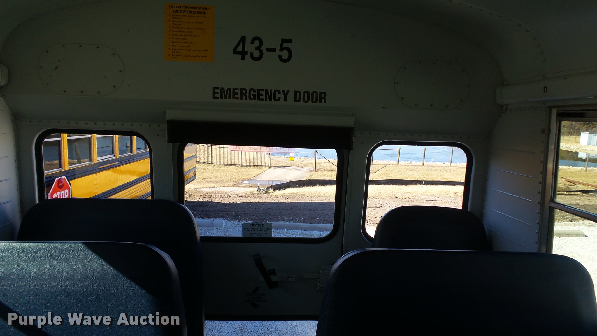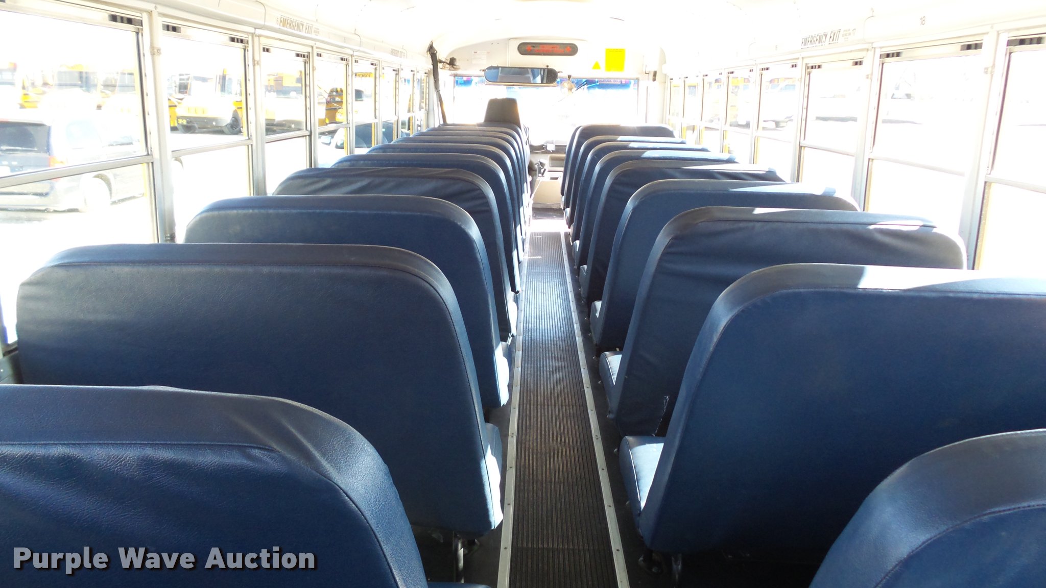 Purple Wave is selling a used Bus in Kansas. This item is a 2005 Freightliner FS65 Thomas school bus with the following: 147,437 miles on odometer, Caterpillar C7 7.2L L6 turbo diesel engine, Allison 2000 automatic transmission, Single axle, Heat, Cruise, AM/FM, Heated mirrors, Cloth drivers interior, Vinyl passenger interior, 65 passenger capacity, (2) child safety seats, Ceiling, rear, and side emergency egress, Lighted stop sign, Backup alarm, Block heater, Front and rear tow hooks, Spring suspension, Hydraulic brakes, 255" wheelbase, 11R22.5 tires, GVWR 29,999 lbs, Intake heater light on, Unit# 43-5