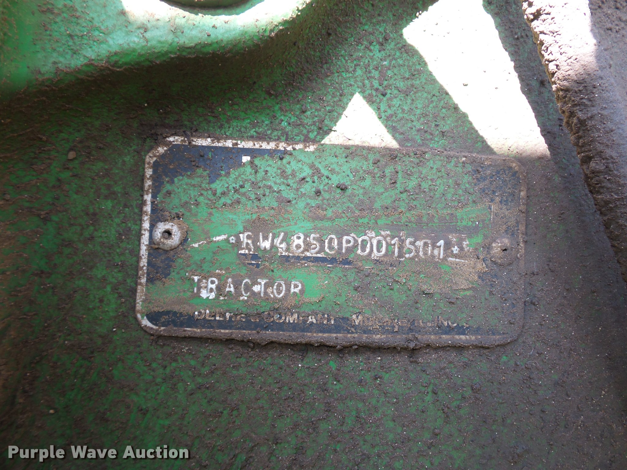 Purple Wave is selling a used Tractor in Kansas. This item is a 1983 John Deere 4850 tractor with the following: John Deere six cylinder turbo diesel engine, Powershift transmission, 15F-4R gears, AC and heat, Suspension seat, Front and rear work lights, Three point, 1000 PTO, Draw bar, (3) rear hydraulic remote sets, 14-16.1 front tires, 20.8R38 rear tires, Dual rear tires and wheels included, Serial RW4850P001501