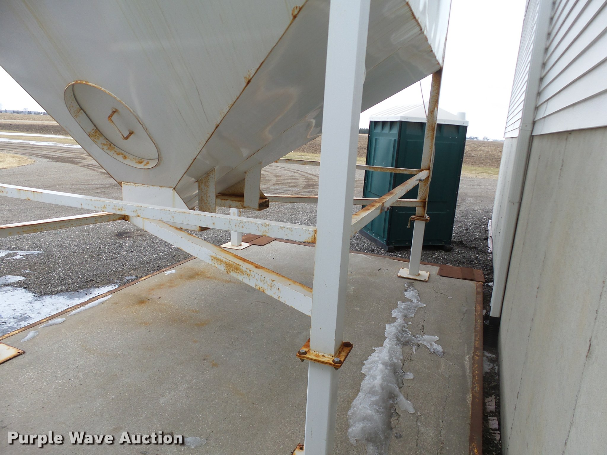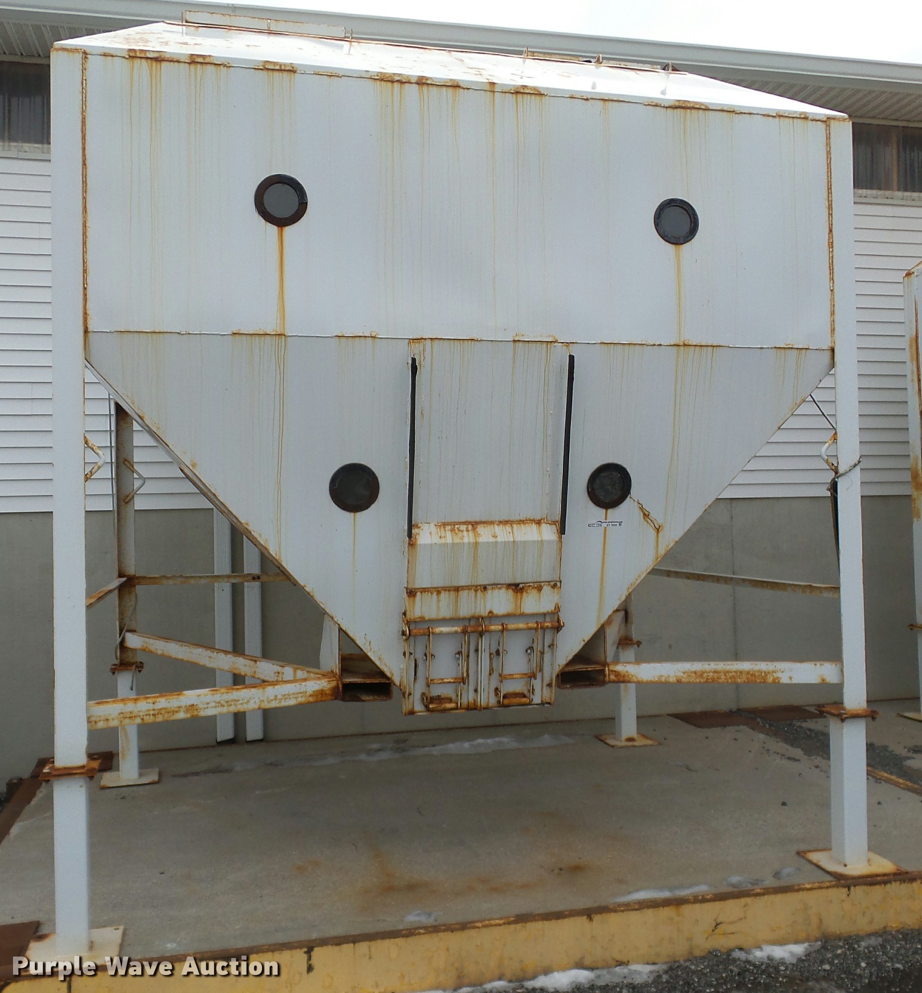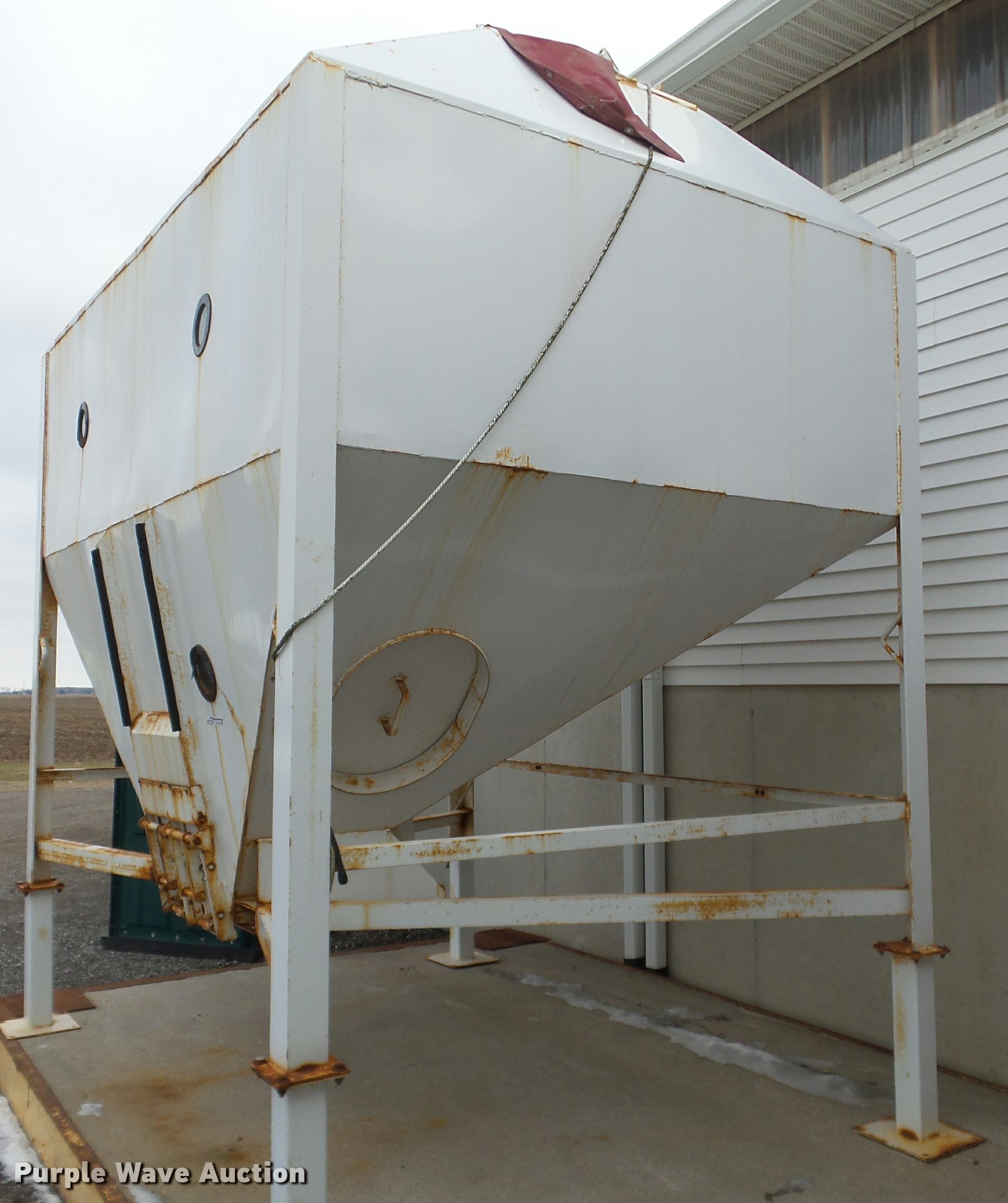 Purple Wave is selling a used Other Grain or Fertilizer Handling in Michigan. This item is a Steel grain bin with the following: 124"L x 94"W, (2) hopper, (2) hatches on sides, 20"W, (2) hatches on roof, Front sight level glass, Front discharge