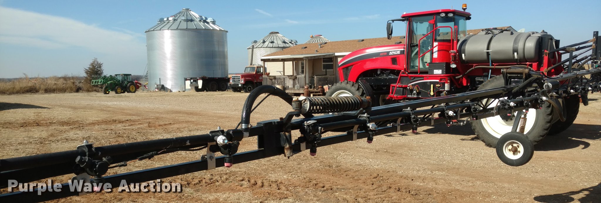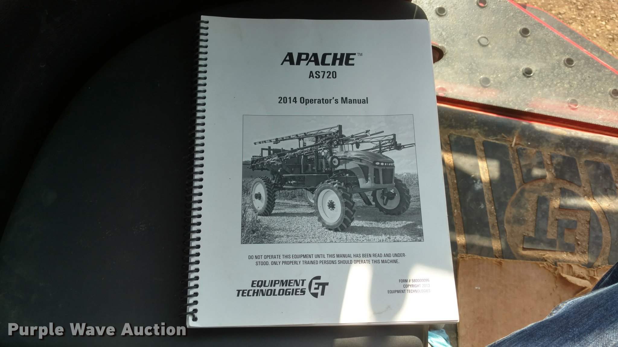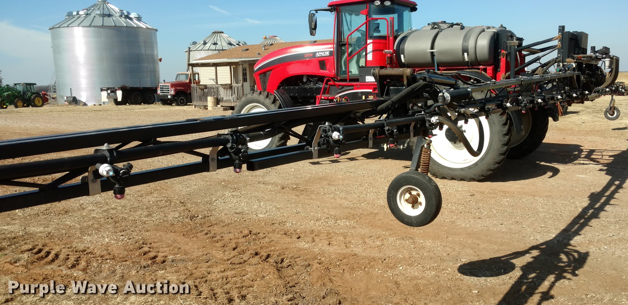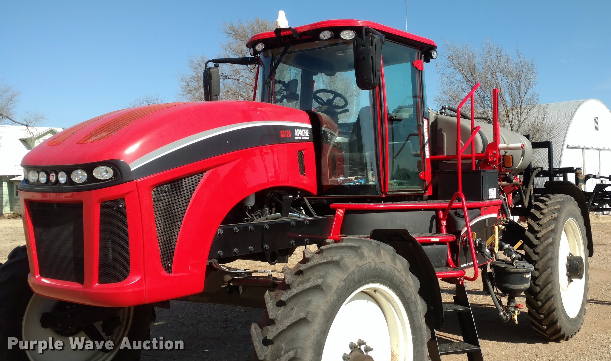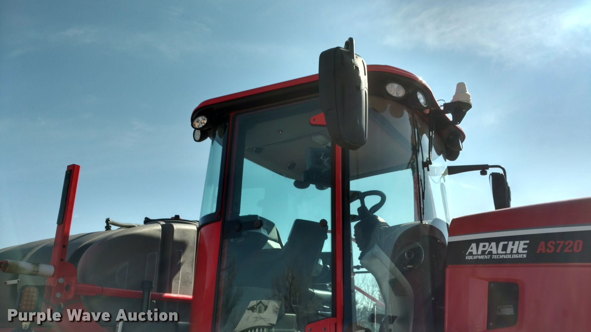 2014 Apache AS720 self-propelled applicator. 618 hours on meter, Cummins turbo diesel engine 160 HP, Powershift transmission 4F-1R gears, Mechanical drive, 750 gallon poly solution tank, Poly chemical eductor tank, Rinse tank, Clean water tank, 60/90'W boom (9) boom sections, Hydraulic boom fold, Hydraulic height control, Raven auto boom, Raven Accu-boom, Three-way nozzle bodies, 20" nozzle spacing, AC and heat, AM/FM, Suspension seat, Rotary beacon, Work lights, Raven Invisio Pro monitor, Raven GPS receiver, Raven hydraulic auto steer, Hydraulic ladder, Fenders, 380/80R38 row crop tires, Serial 9140440. Birdzell Farms. Winfield, KS 67156