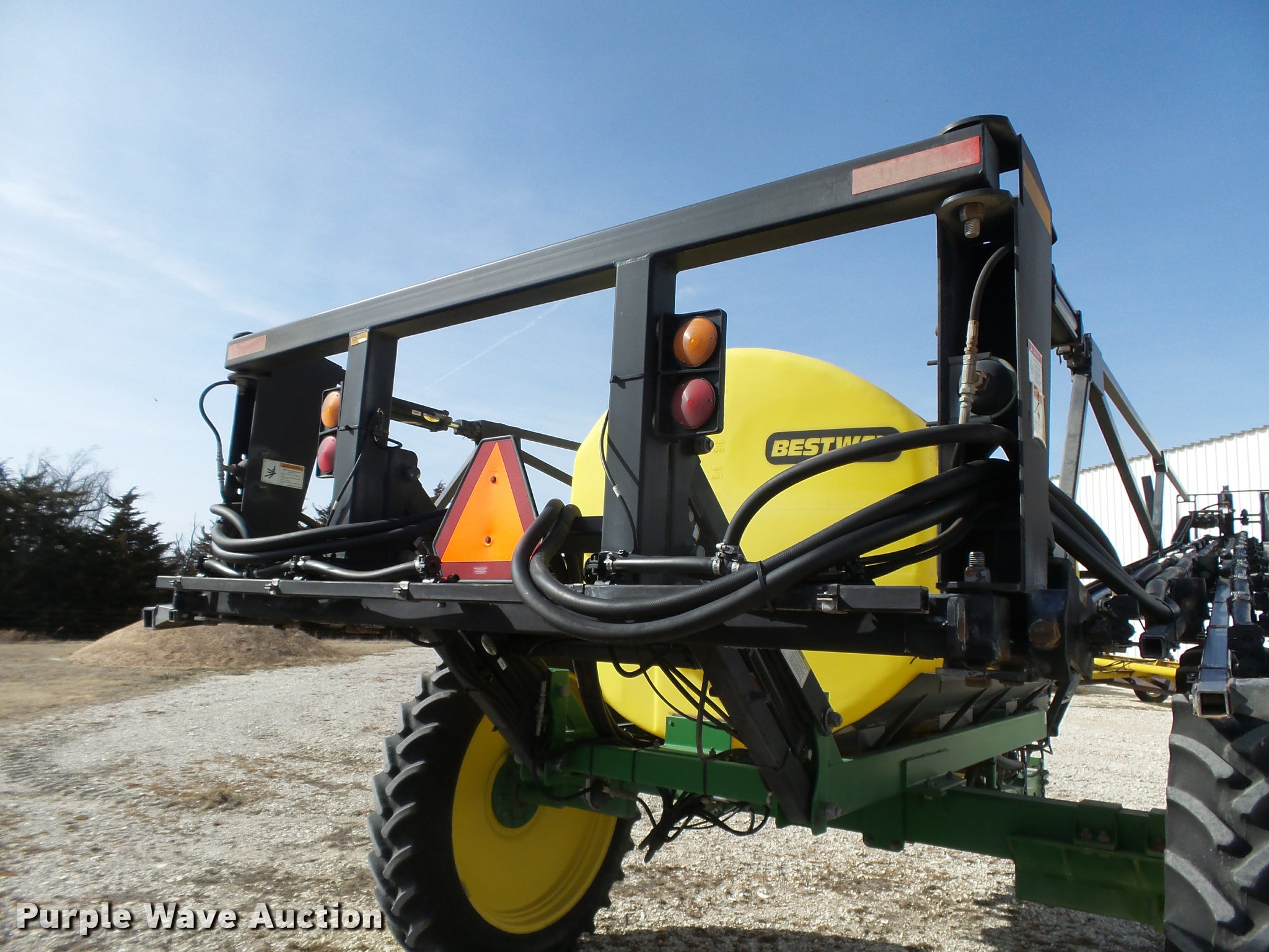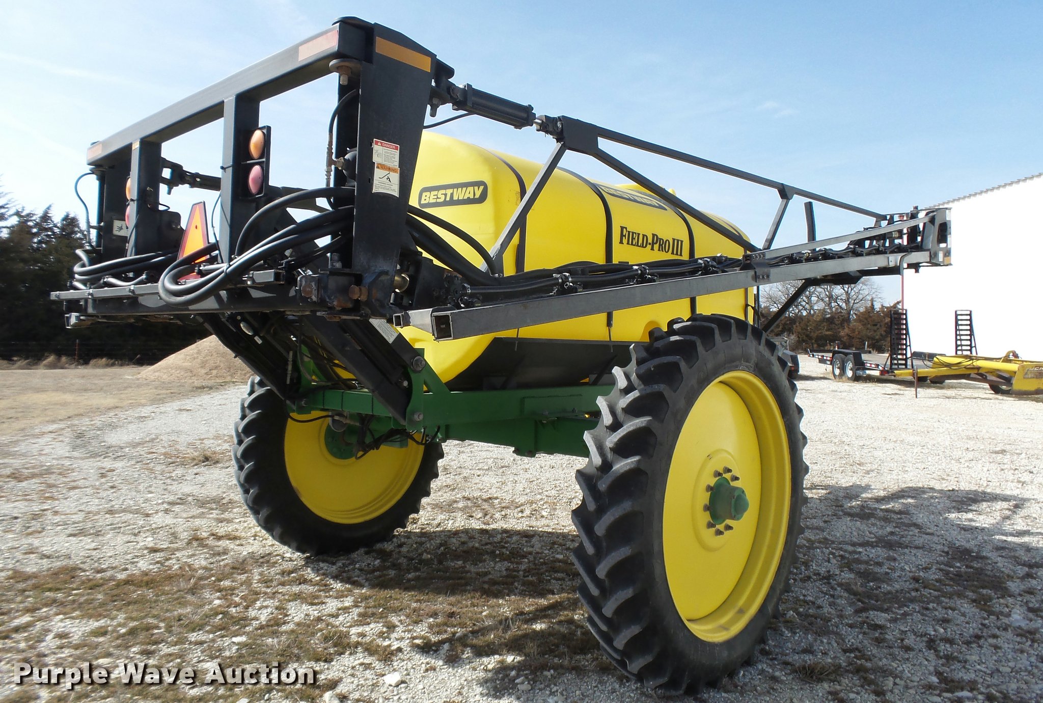 Purple Wave is selling a used Applicator Pull Type in Kansas. This item is a 2006 Bestway Field Pro III sprayer with the following: 1,200 gallon poly solution tank, Front fill, 16 gallon poly chemical eductor tank, 50 gallon rinse tank, Clean water tank, 80'W boom, (4) boom sections, Hydraulic boom fold, Hydraulic height control, 20" nozzle spacing, Three-way nozzle bodies, Hypro 9306C pump, Raven flow meter, Raven 450 controller, Bestway control box, Transport lights, Slab hitch, Owners manual, 320/90R46 row crop tires, Unit has been winterized, Serial 20417-06
