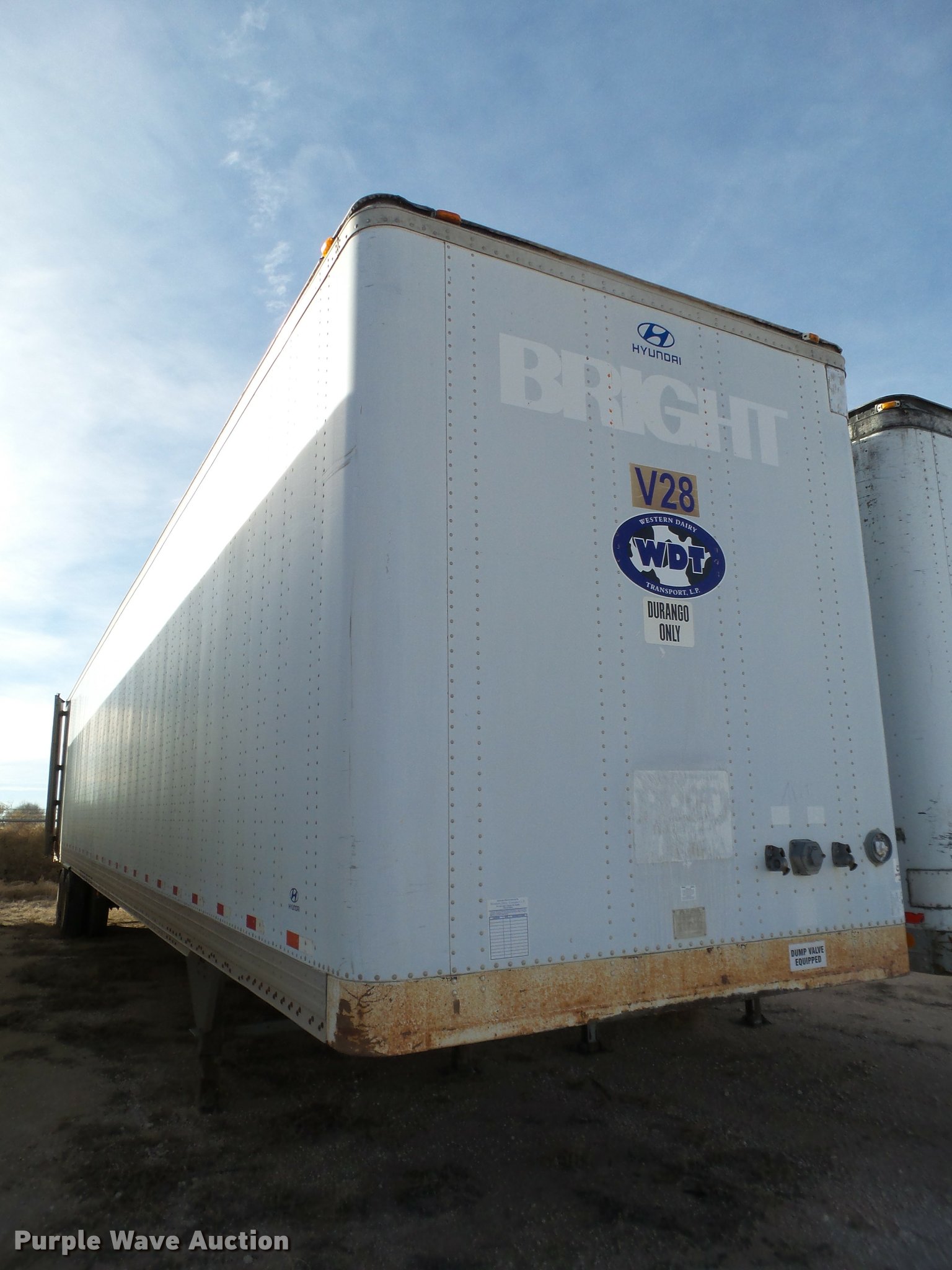 Purple Wave is selling a used Dry Van Trailer in New Mexico. This item is a 2002 Hyundai dry van trailer with the following: 53'L x 102"W, Wood deck, Needs to be repaired, Fifth wheel plate, Dual leg landing gear, Air suspension, Air brakes, Tandem axle, 295/75R22.5 tires, Unit# V28