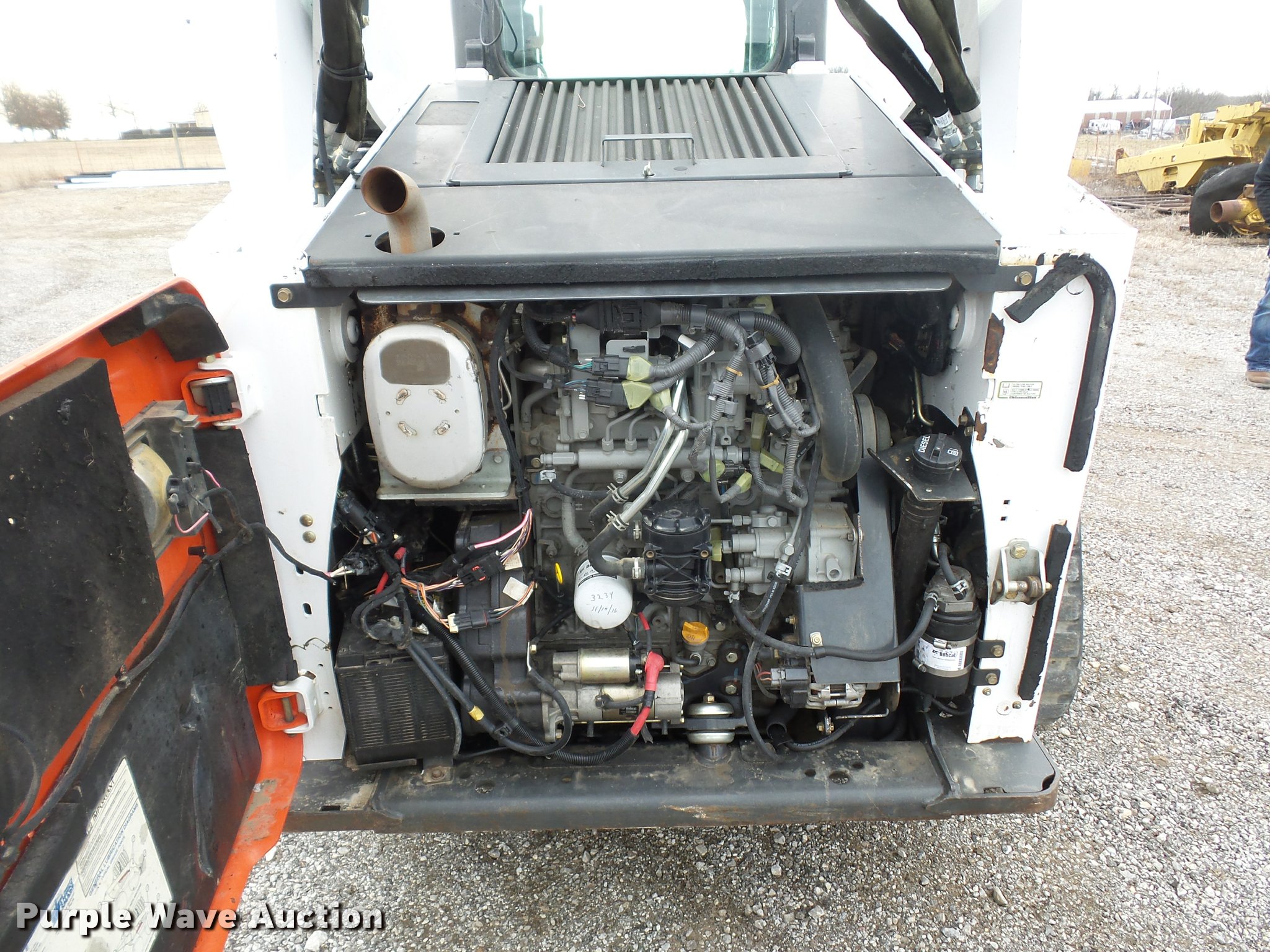 Purple Wave is selling a used Tracked Skid Steer Loader in Missouri. This item is a 2013 Bobcat T750 skid steer with the following: 3,415 hours on meter, Four cylinder turbo diesel engine, Hydrostatic transmission, Enclosed cab, AC and heat, AM/FM, Hand and foot controls, Spring suspension seat, Wipers, Front and rear work lights, 80"W bucket, (8) bolt-on teeth, Hydraulic quick coupler, Auxiliary hydraulics, 17.5"W tracks, Serial ATF612535