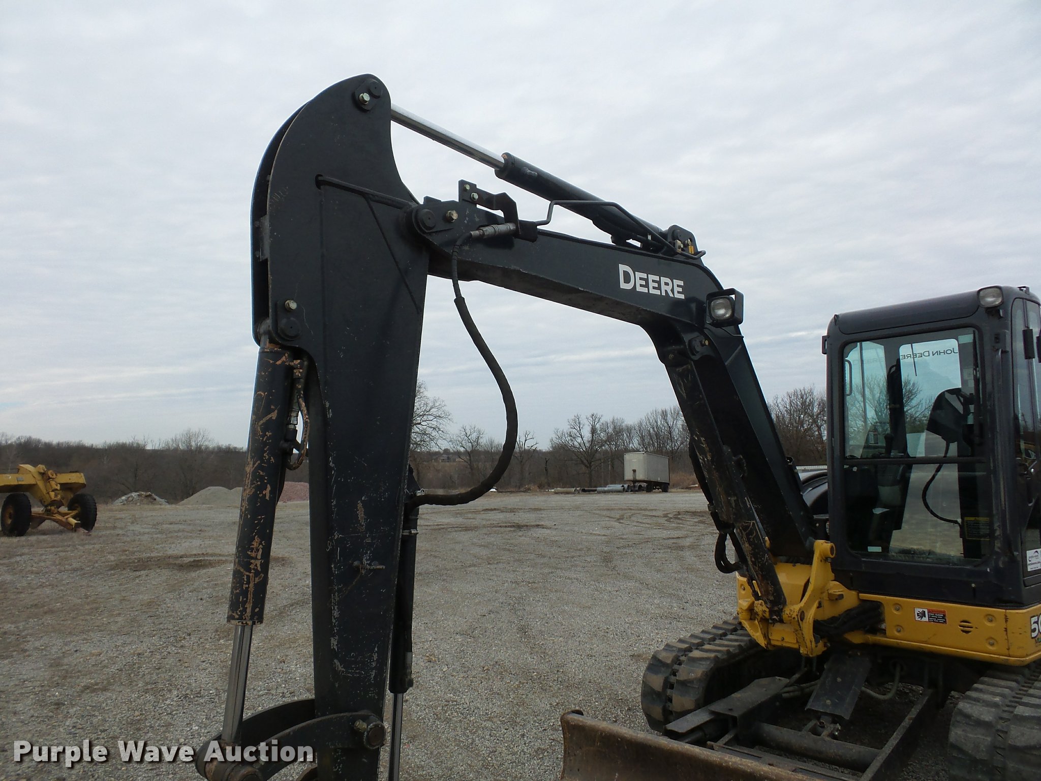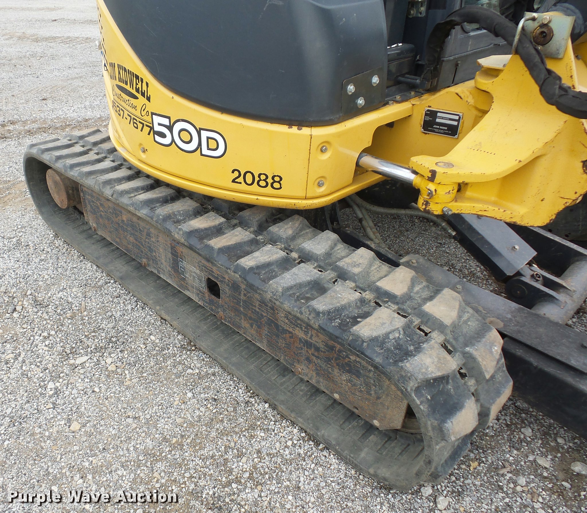 Purple Wave is selling a used Mini Excavator in Missouri. This item is a 2011 John Deere 50D compact excavator with the following: 3,727 hours on meter, Four cylinder diesel engine, Two speed hydrostatic transmission, EROPS, AC and heat, Suspension seat, Pattern changer, Front work lights, 68" stick length, 24"W bucket, (5) teeth, John Deere hydraulic thumb, 12"W, Mechanical quick coupler, Auxiliary hydraulics, 78"W backfill blade, 16"W rubber tracks, Serial 1FF050DXVBG275758