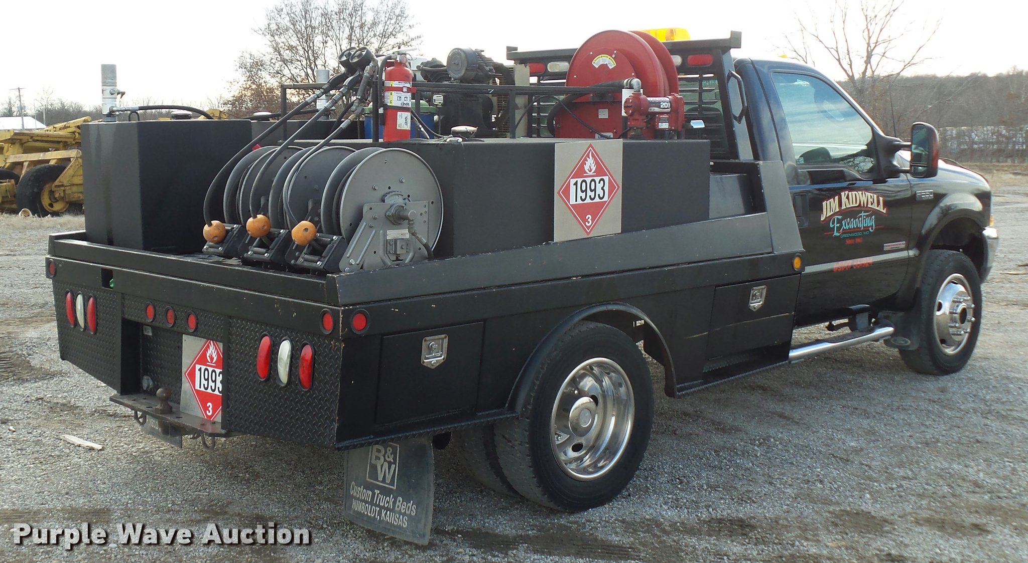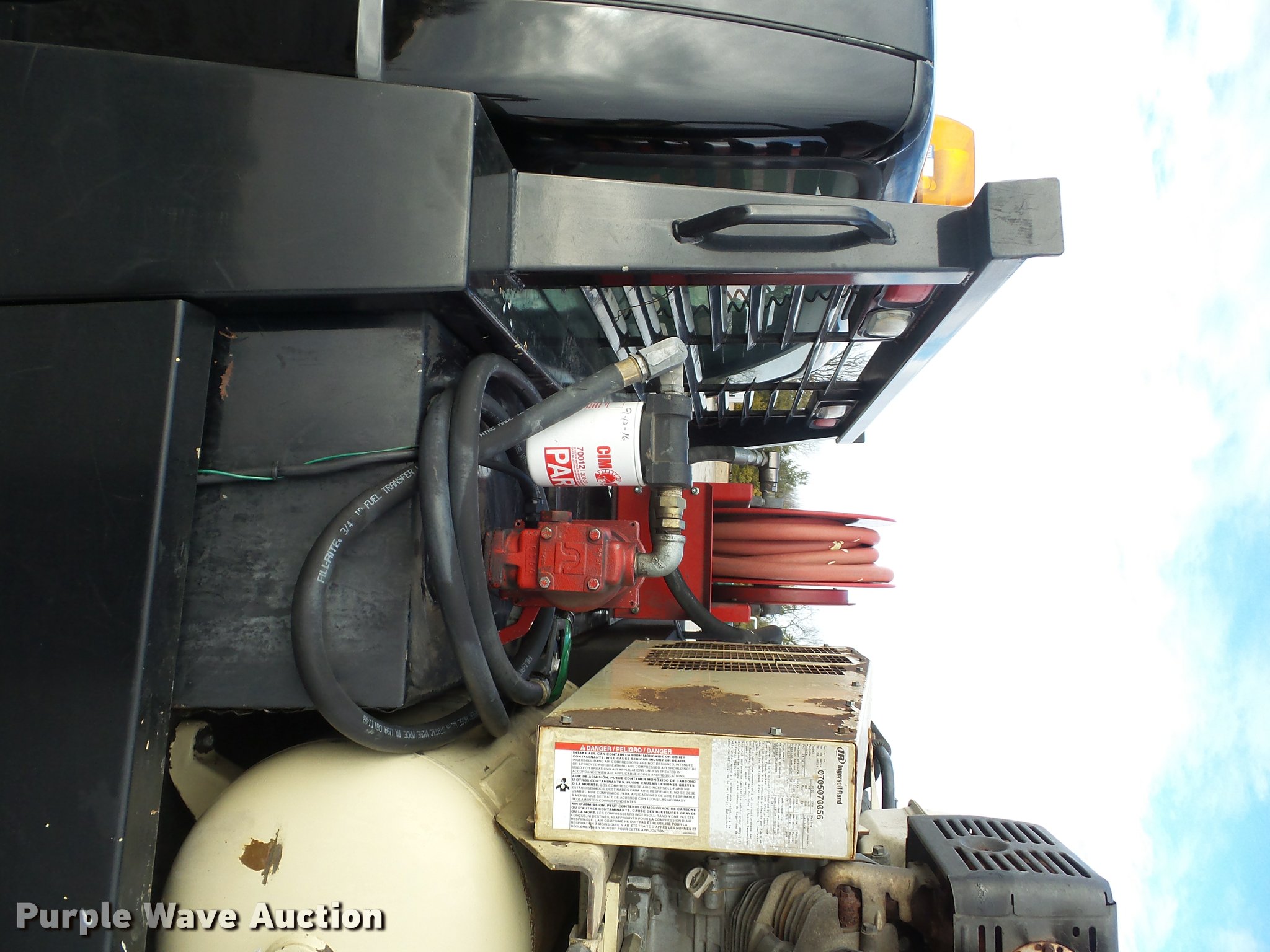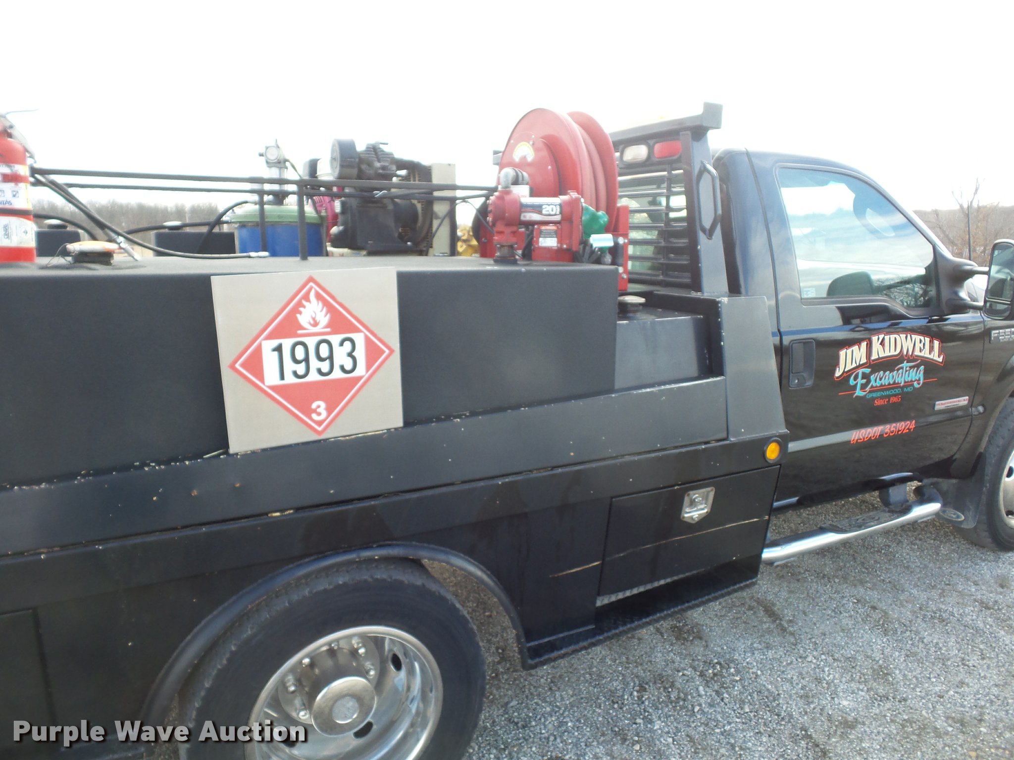 Purple Wave is selling a used Service Truck in Missouri. This item is a 2003 Ford F550 Super Duty service truck with the following: 287,017 miles on odometer, 6.0L V8 OHV 32V turbo diesel engine, Automatic transmission, Four wheel drive, AC and heat, Tilt, Cruise, AM/FM/CD/cassette, Power windows, locks, and mirrors, Cloth interior, 9'3"L x 8'W flatbed, Ingersoll Rand air compressor, Honda GX390 gas engine, 13 HP,, 300 gallon diesel tank, 60 gallon diesel tank, (2) 50 gallon bulk oil tanks, Air pumps, Grease pump, Receiver hitch, Trailer wiring, 225/70R19.5 tires, Engine overhauled at approx 274,821 miles