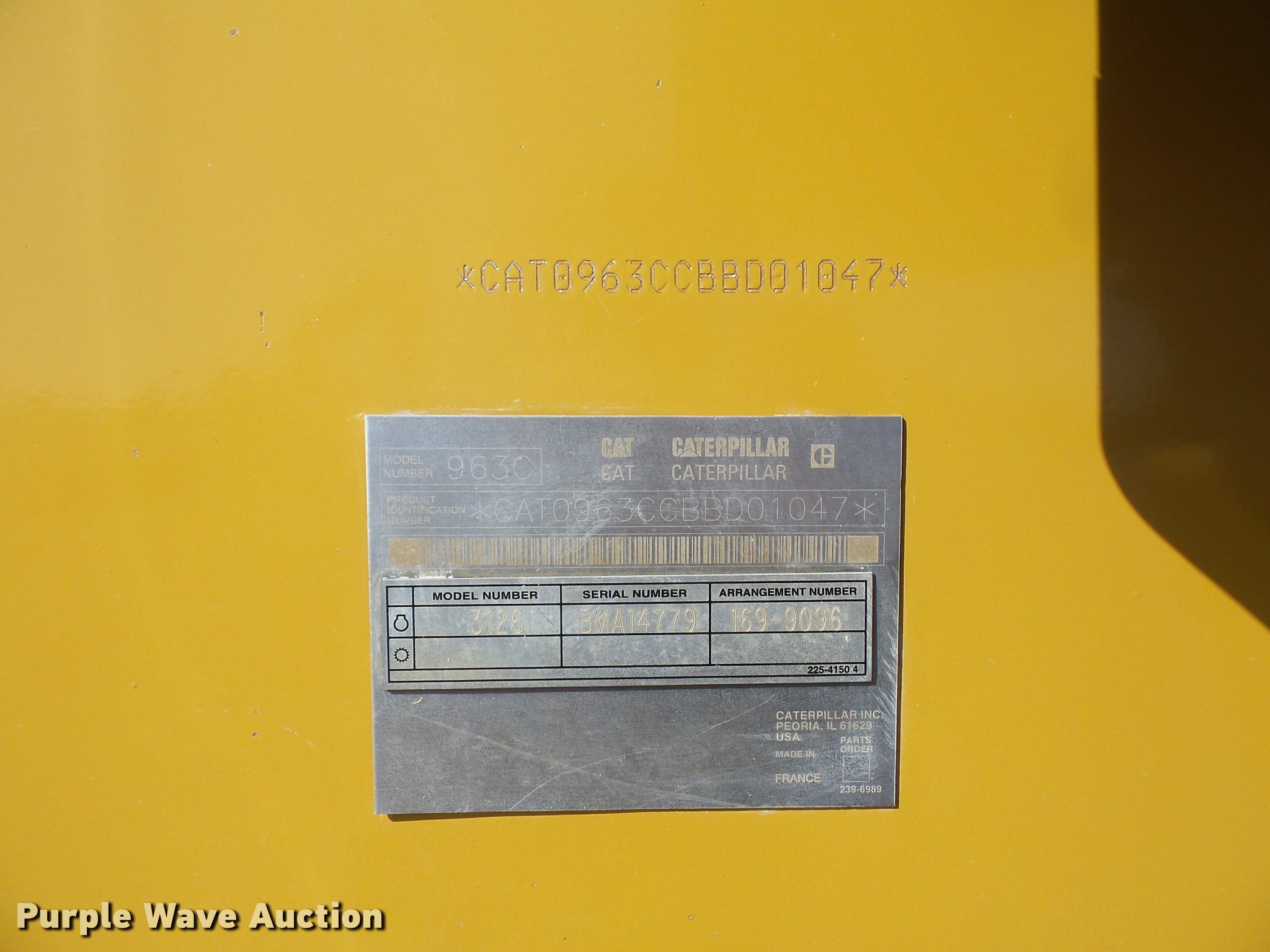 Purple Wave is selling a used Crawler Loader in Missouri. This item is a 2004 Caterpillar 963C track loader with the following: 9,174 hours on meter, Caterpillar 3126 six cylinder turbo diesel engine, Serial BMA14779, Hydrostatic transmission, 3F-3R gears, Enclosed cab, AC and heat, AM/FM, Suspension seat, Two-lever bucket controls, Front and rear work lights, 98"W bucket, Bolt-on cutting edge, (8) teeth, 21.5"W double grouser track pads, Serial CAT0963CCBBD01047