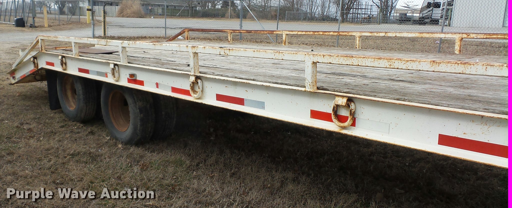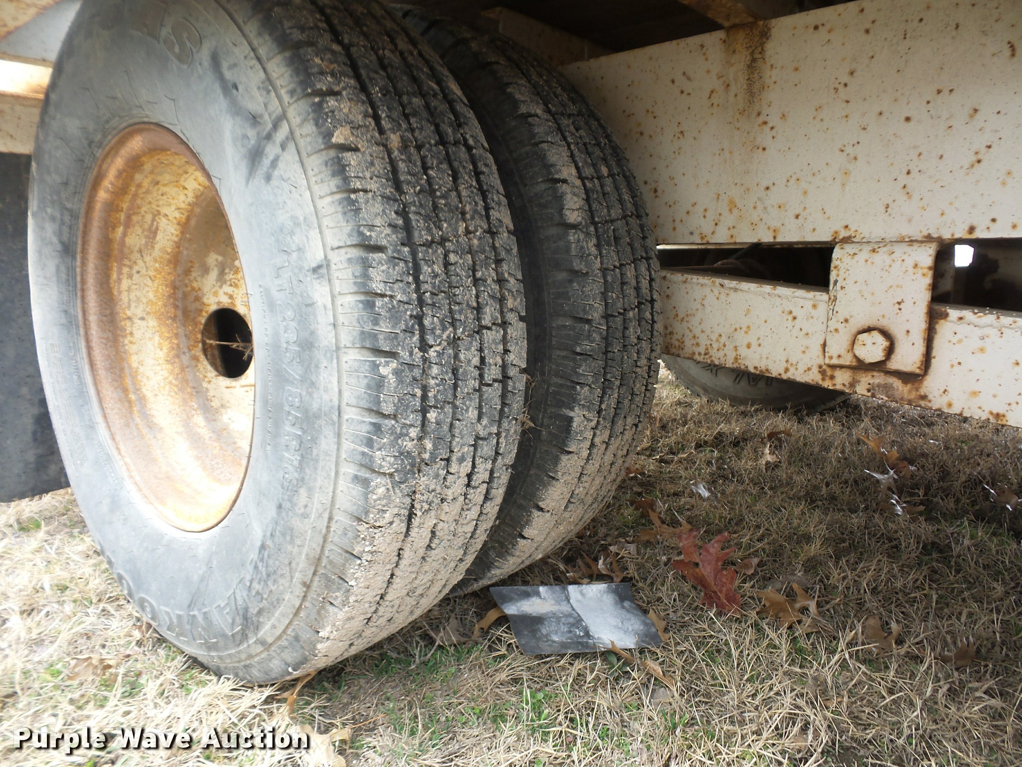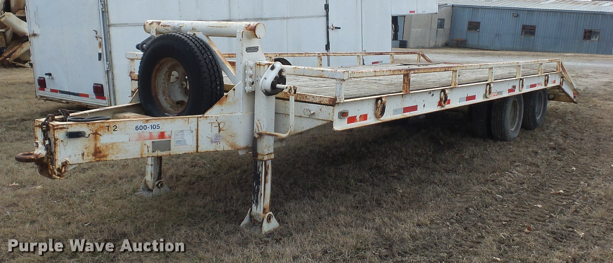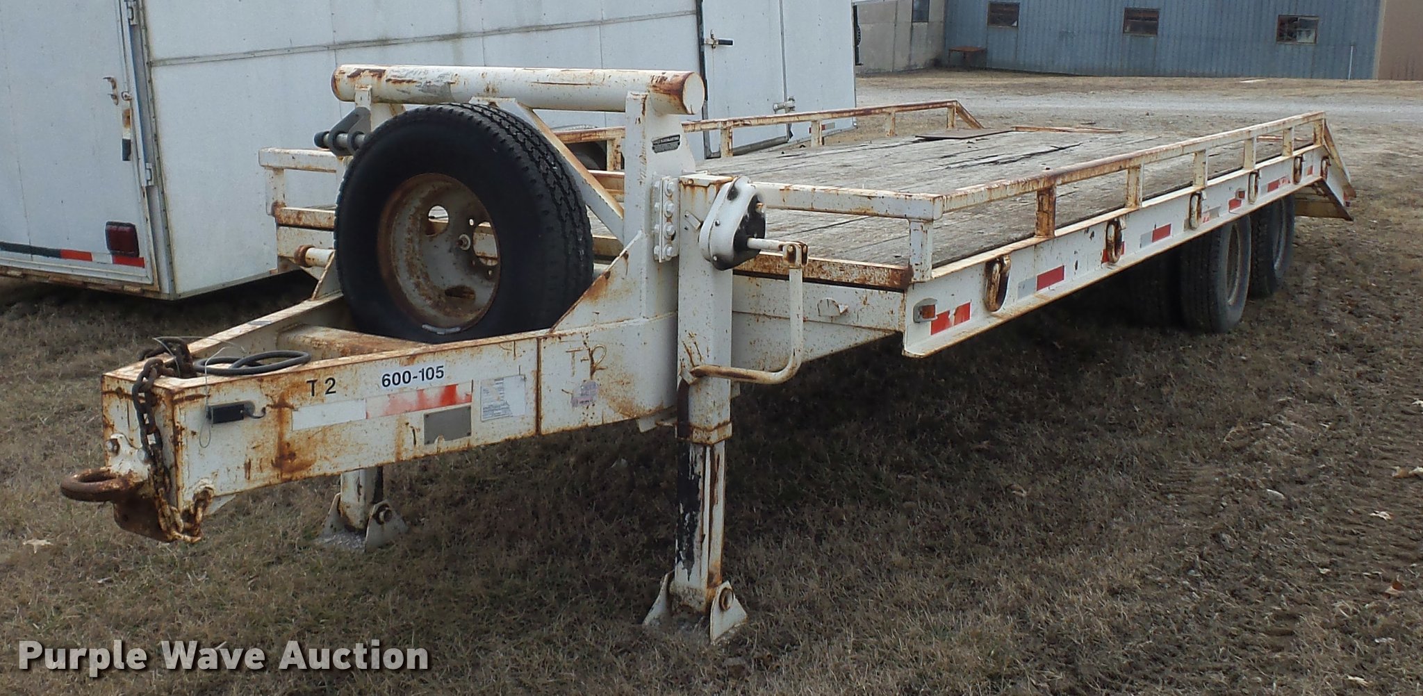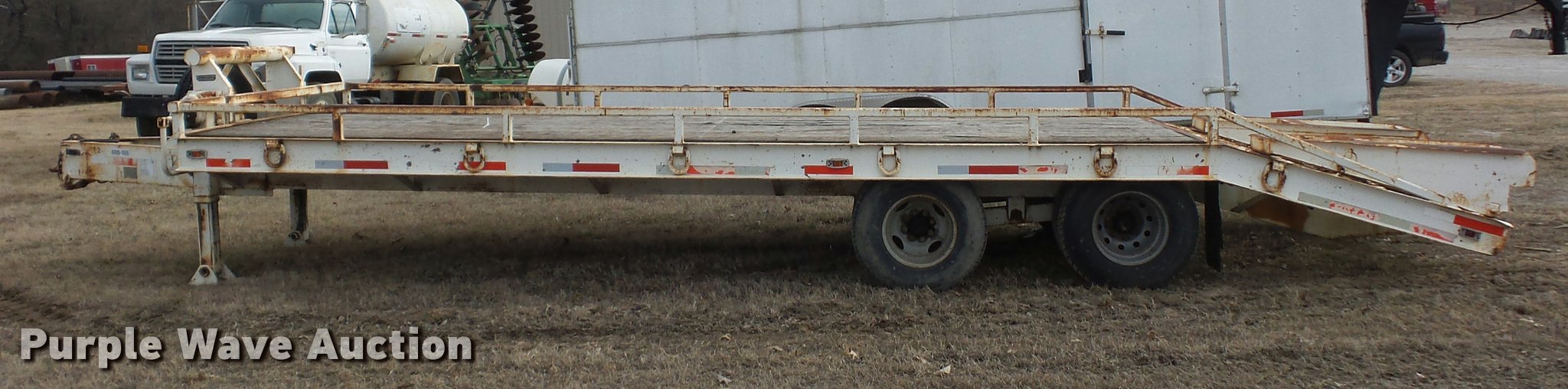 Purple Wave is selling a used Equip. Trailer in Kansas. This item is a 1984 Belshe T-8G equipment trailer with the following: 20'L x 91"W deck, 5.5'L dovetail, 5'L x 18"W ramps, D-ring tie downs, Pintle hitch, Manual jack, Spring suspension, Electric brakes, Tandem axle, 235/85R16 tires, GVWR 20,000 lbs, GAWR 10,000 lbs