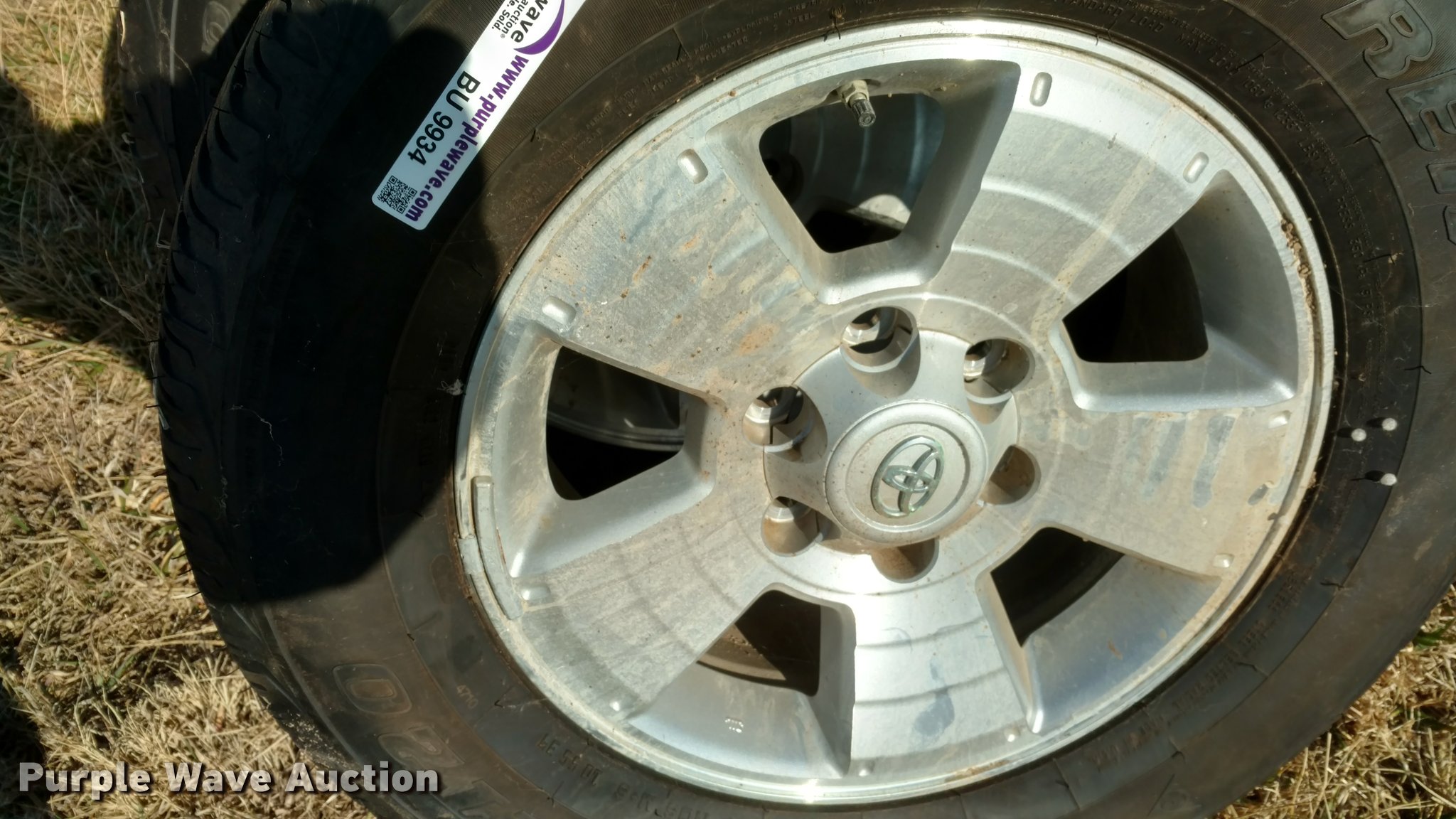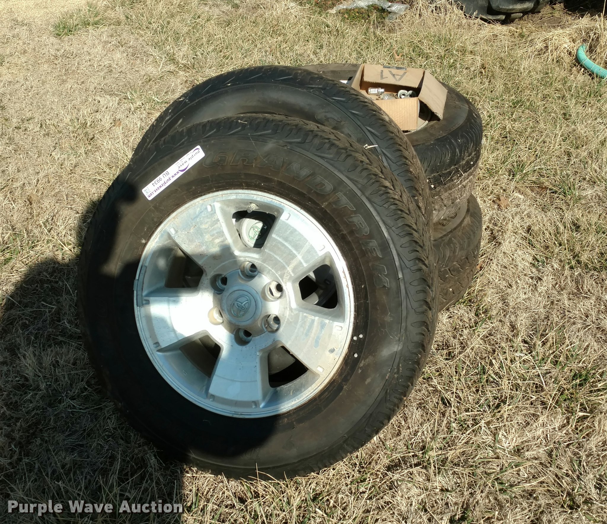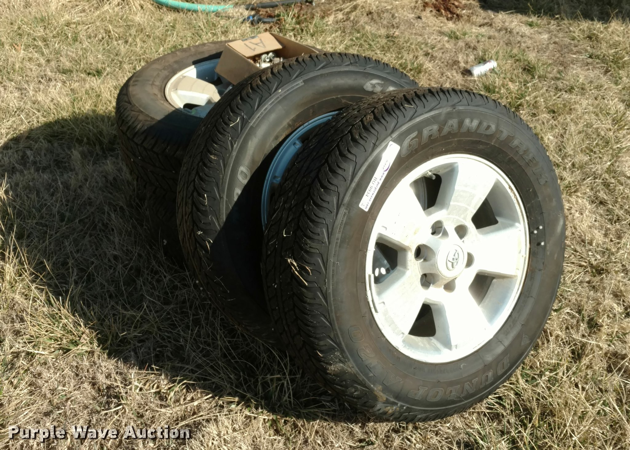 Purple Wave is selling a used Automotive Parts or Acces. in Kansas. This item is a (4) tires and wheels with the following: Dunlop AT20, Grandtrek, 265/65R17 tires, Six hole wheels, Removed from Toyota Tacoma