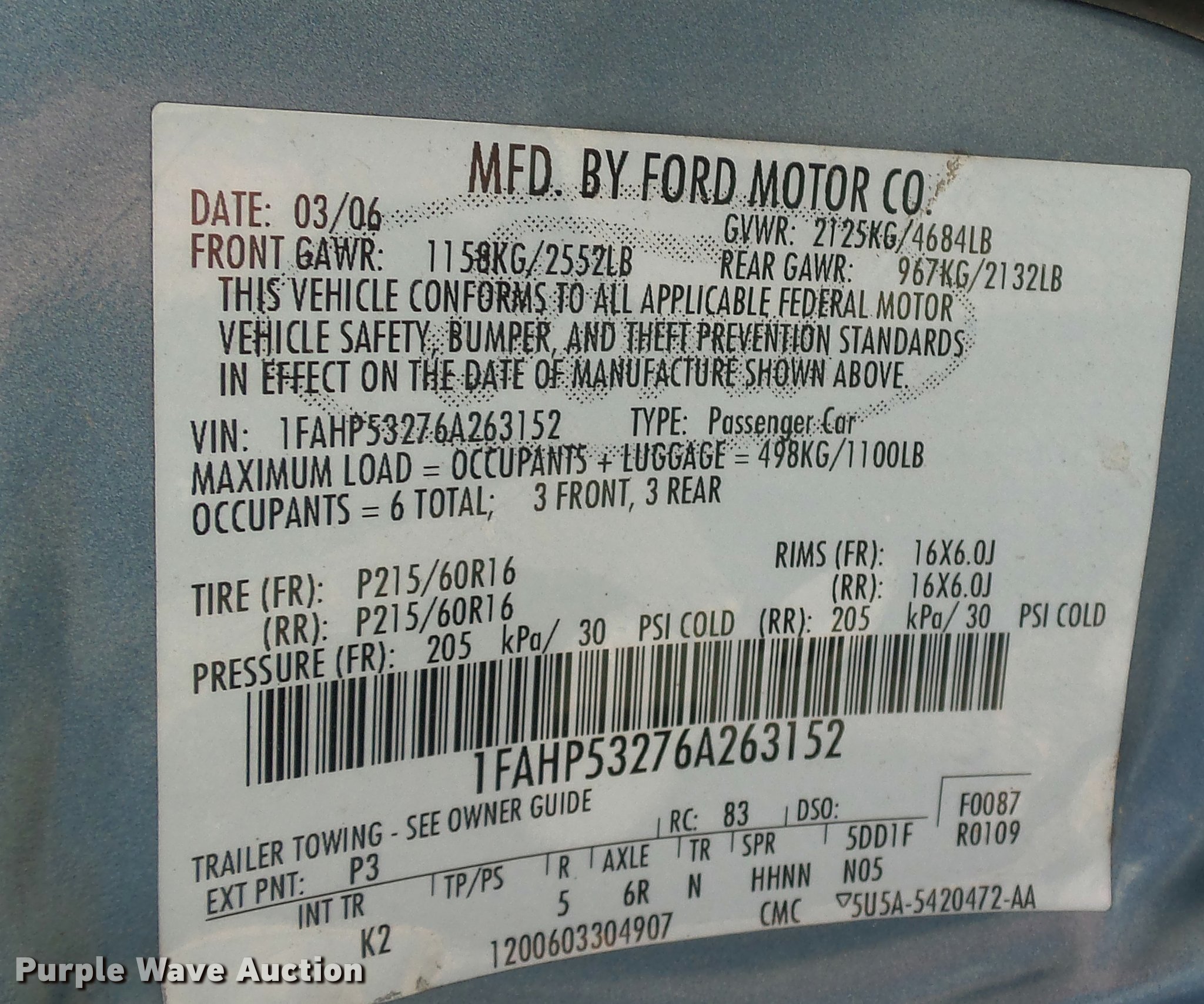 Purple Wave is selling a used Passenger Vehicle in Kansas. This item is a 2006 Ford Taurus SE with the following: 134,855 miles on odometer, 3.0L V6 OHV 12V FFV gas engine, Automatic transmission, AC and heat, Tilt, Cruise, AM/FM/CD, Power windows, locks, and mirrors, Cloth interior, P215/60R16 tires, Dead battery, Varnish peeling, Hail damage, Unit# 14356