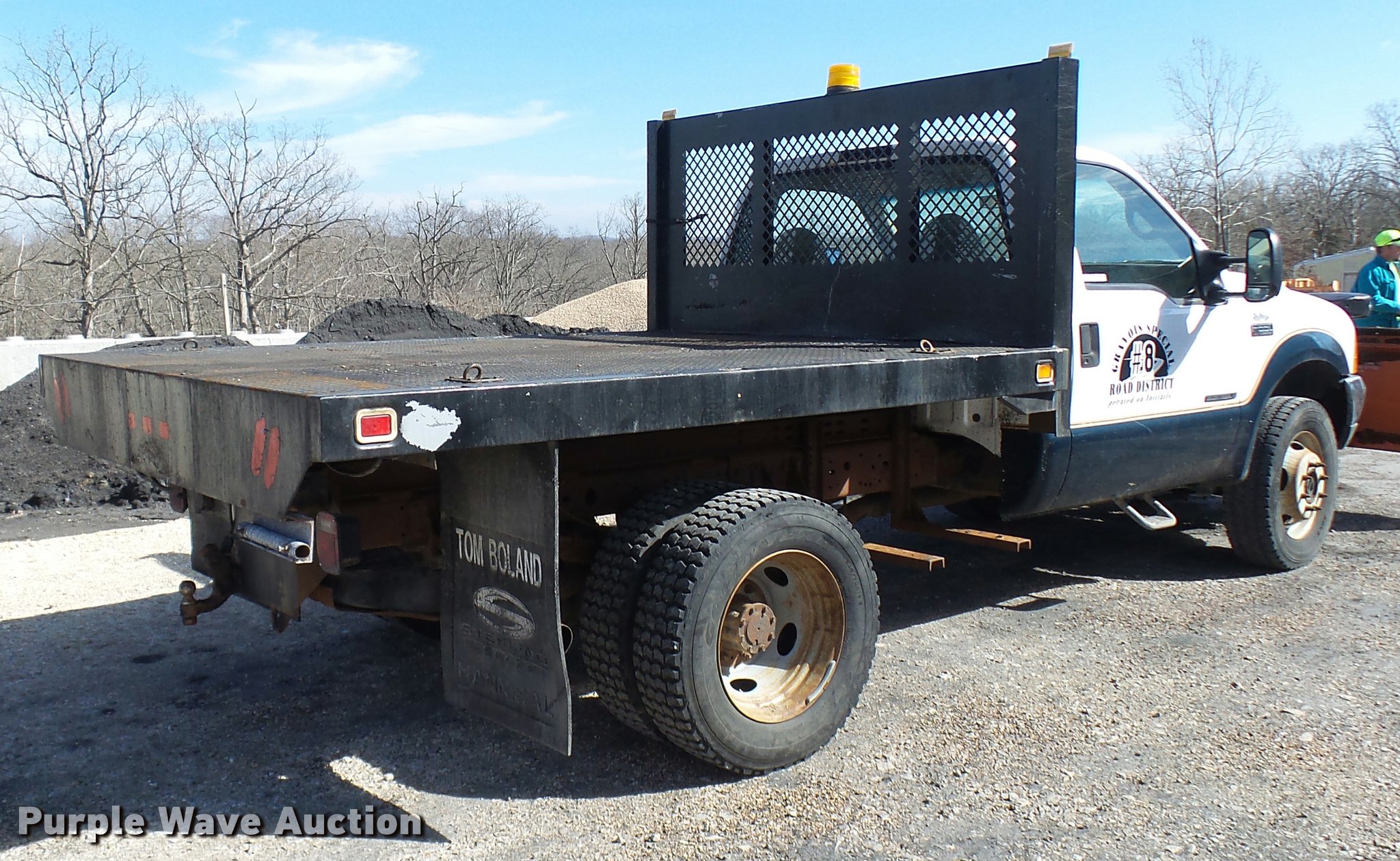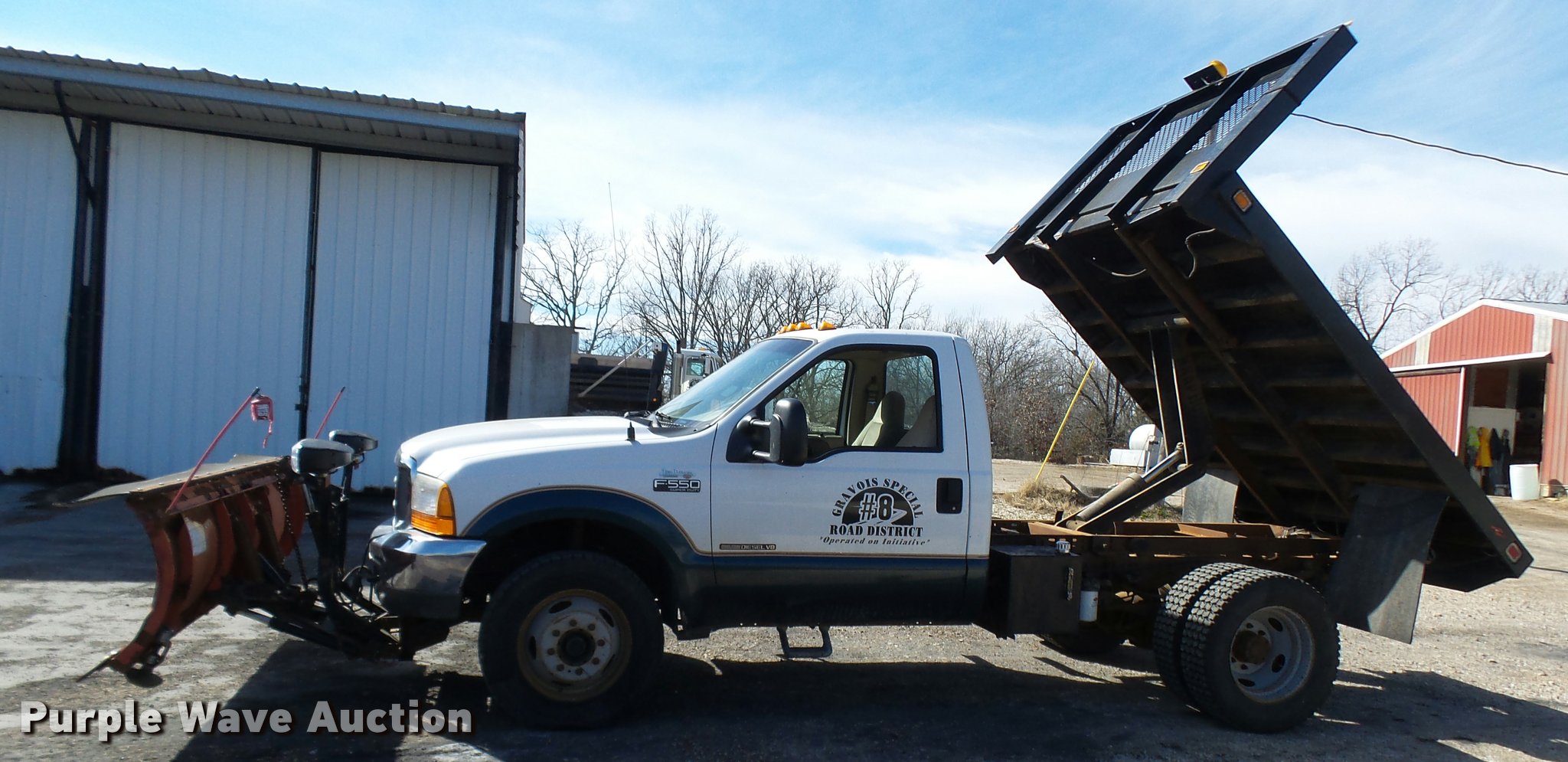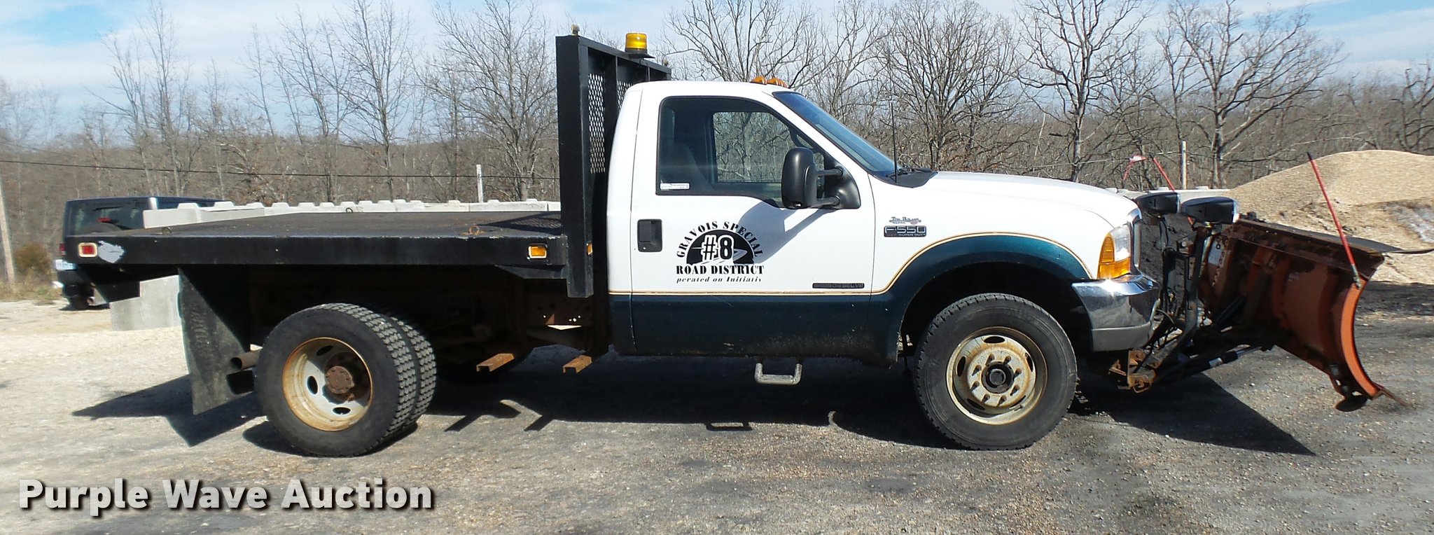 Purple Wave is selling a used Flat Bed Truck in Missouri. This item is a 2001 Ford F550 Super Duty flat dump bed truck with the following: 80,721 miles on odometer, 7.3L V8 OHV 16V turbo diesel engine, Six speed manual transmission, Four wheel drive, AC and heat, Tilt, Cruise, AM/FM/CD, Power windows, locks, and mirrors, Cloth interior, Knapheide flat dump bed, 9'L x 8'W, Knapheide front and rear hydraulic system, Western Pro Guard snow plow, 9'W, Light kit, In-cab plow and spreader controls, Headache rack, Front tow hooks, Pintle hitch, 2 5/16" ball hitch, Trailer wiring, 245/70R19.5 tires, Engine smokes