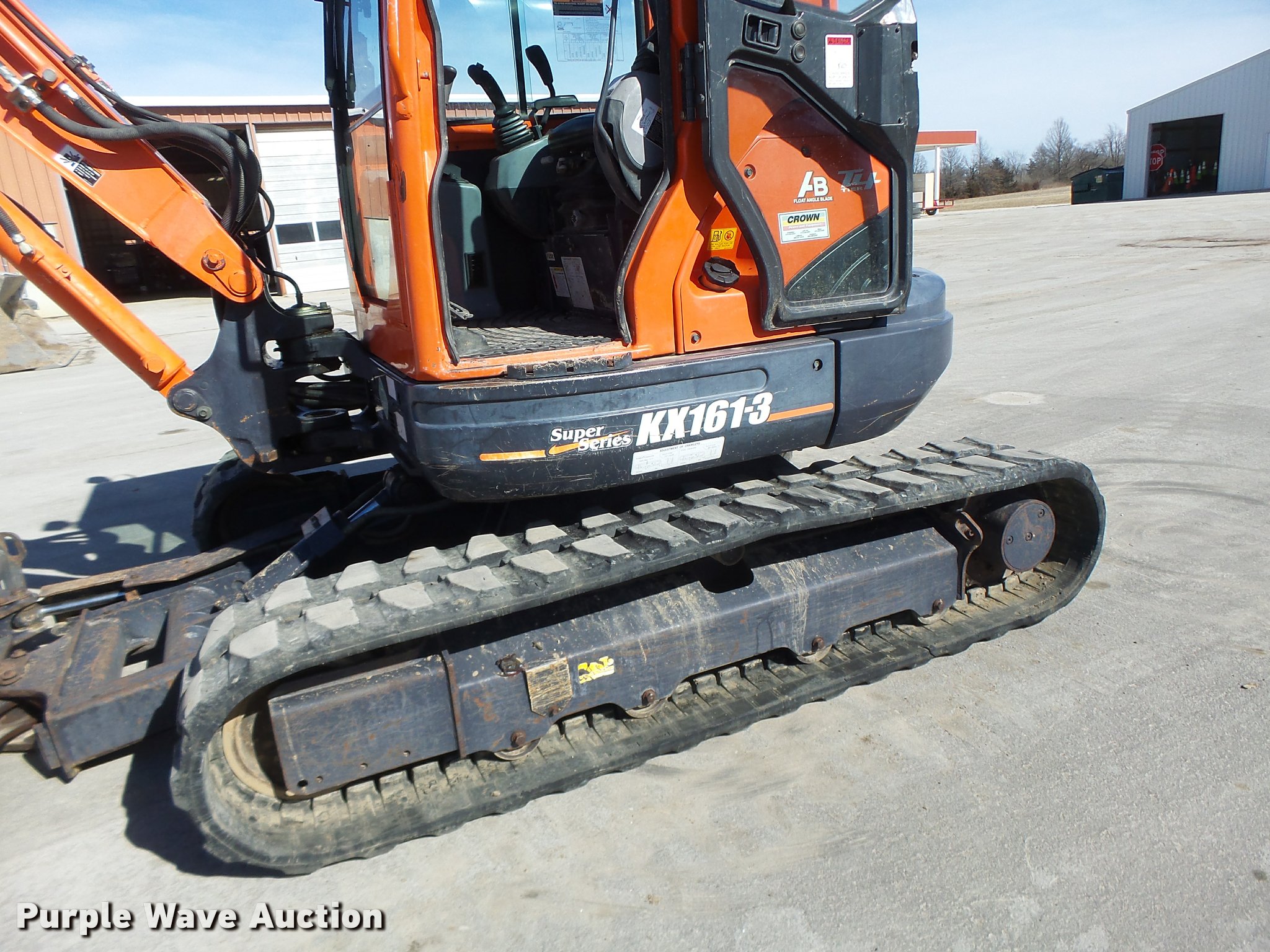 Purple Wave is selling a used Mini Excavator in Missouri. This item is a 2008 Kubota KX161-3 compact excavator with the following: 3,216 hours on meter, Kubota four cylinder diesel engine, Two speed hydrostatic transmission, EROPS, Serial 0840432, AC and heat, Suspension seat, Joystick controls, Pattern changer, Foot swing controls, Standard boom, 24"W bucket, Bolt-on cutting edge, 18"W bucket, (4) teeth, Auxiliary hydraulics, 77"W backfill blade, Front work lights, (4) bottom rollers, 16"W rubber tracks, Serial 70393