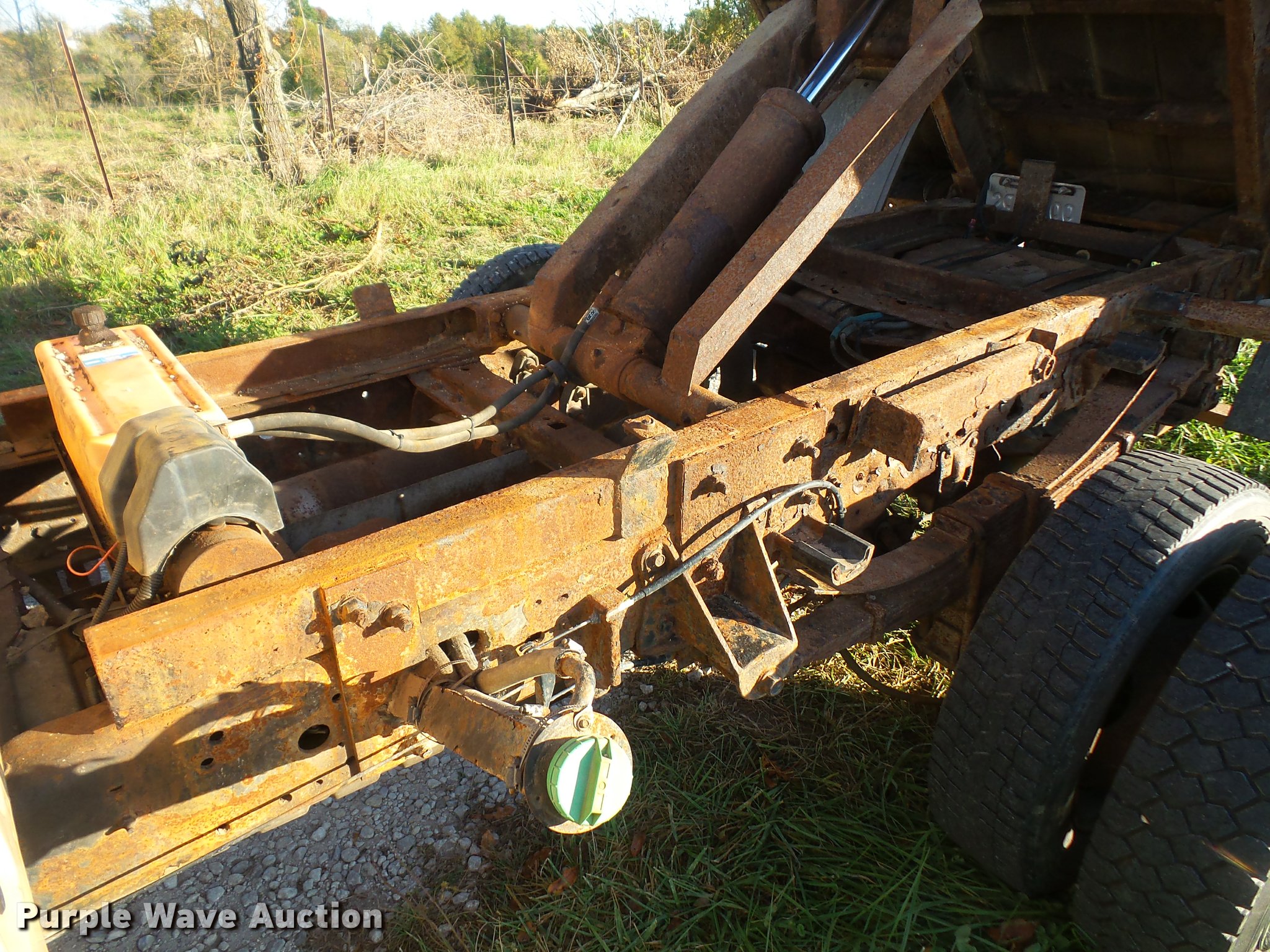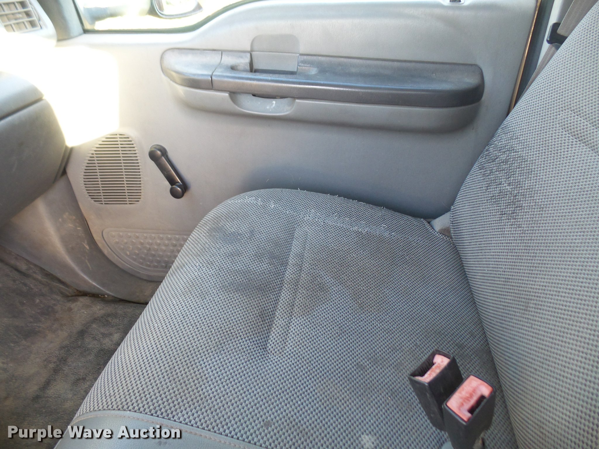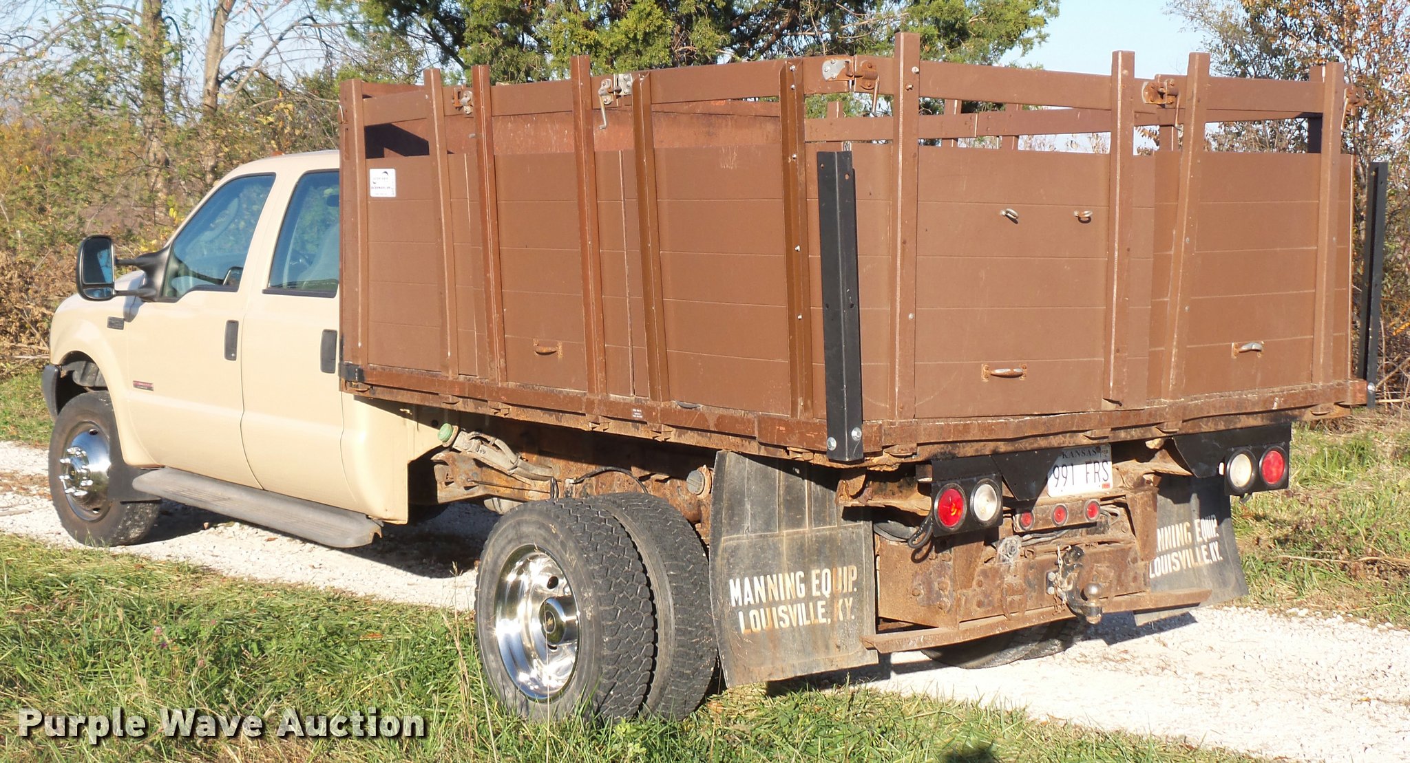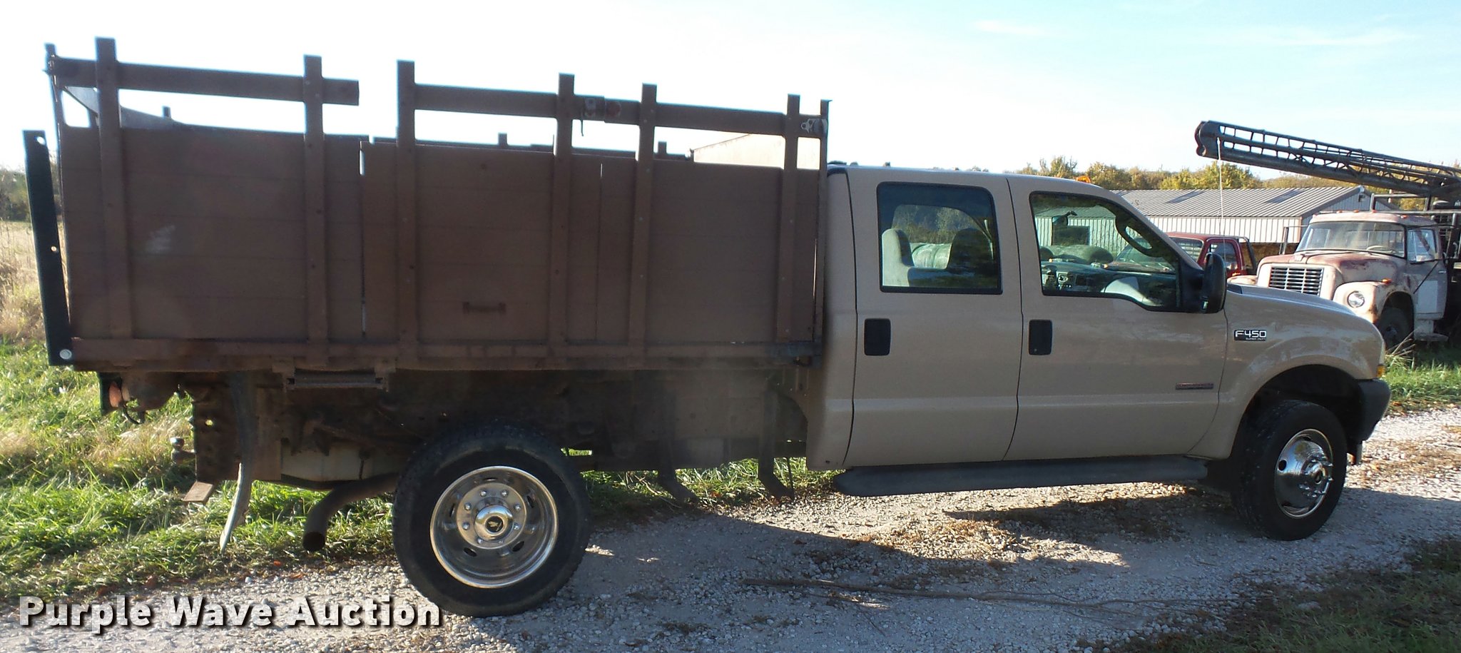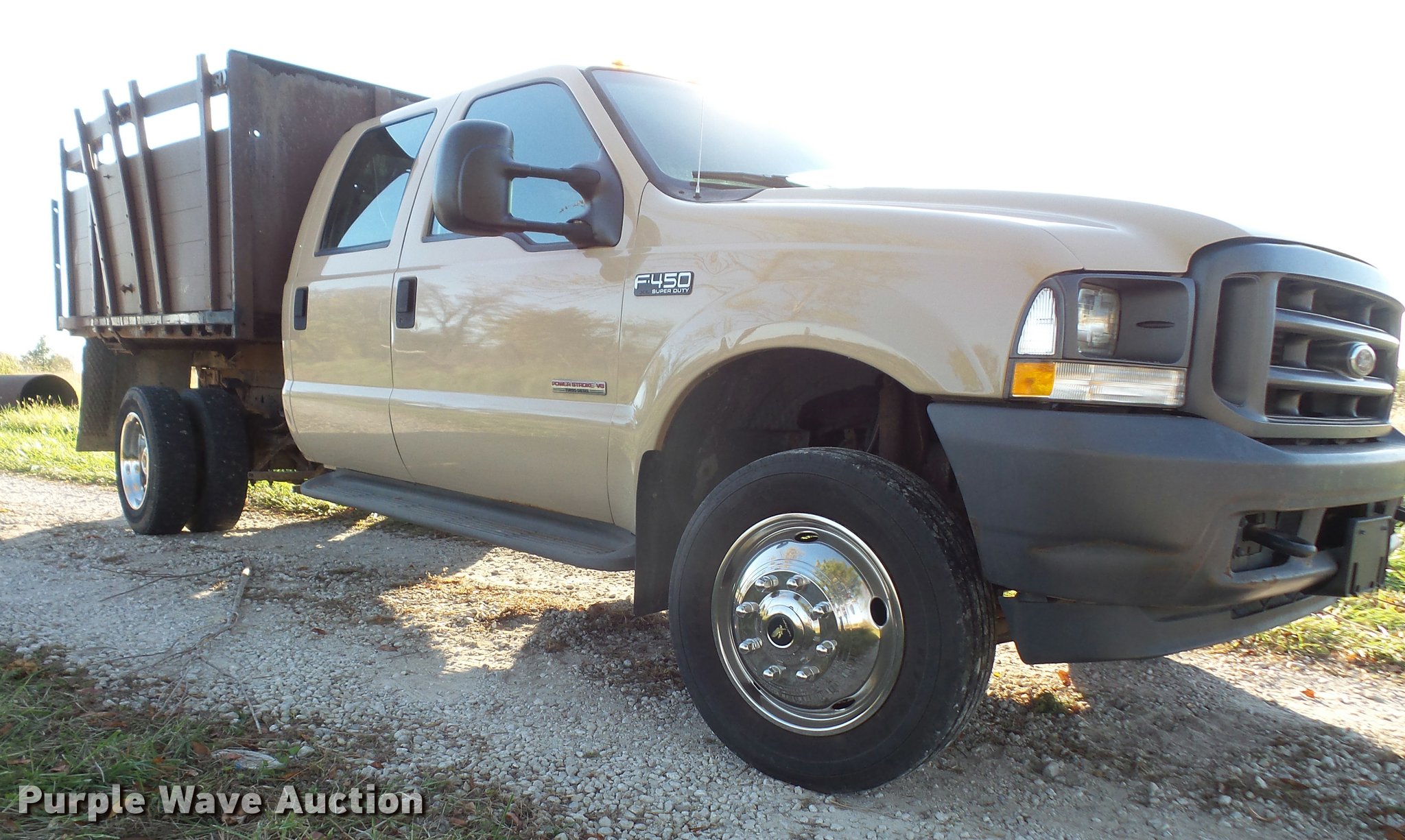 Purple Wave is selling a used Flat Bed Truck in Kansas. This item is a 2004 Ford F450 Super Duty Crew Cab flatbed dump truck with the following: 82,279 miles on odometer, 6.0L V8 OHV 32V diesel engine, Automatic transmission, Heat, AM/FM, Manual windows and locks, Vinyl interior, Running boards, 10'L x 92"W dump flatbed, 40"H sides, Electric over hydraulic, Pintle hitch, 225/70R19.5 tires
