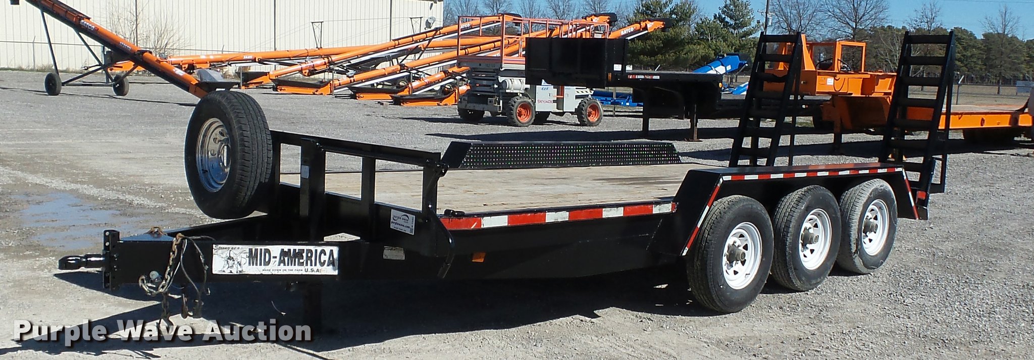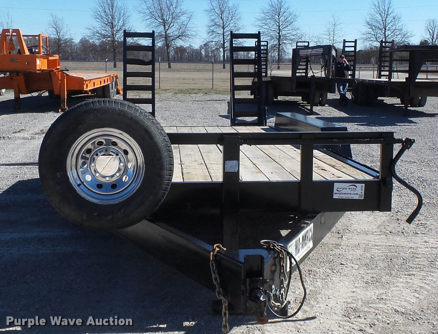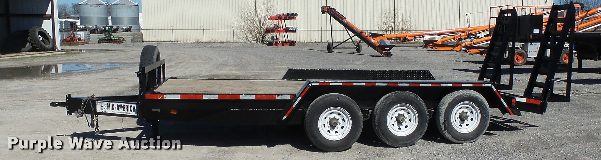 Purple Wave is selling a used Car or Utility Trailer in Missouri. This item is a 2012 Mid-america utility trailer with the following: 16'L x wood deck, 88"W, 2'L dovetail, 5'L ramps, 30" floor height, D-ring tie downs, Stake pockets, 2 5/16" ball hitch, Single leg landing gear, Spring suspension, Electric brakes, Triple axle, Steel wheels, Provider ST235/80R15 tires, GVWR 21,000 lbs