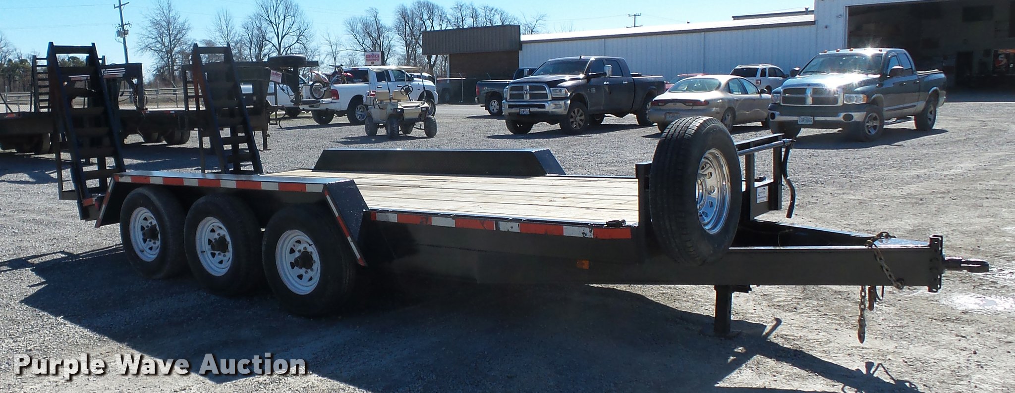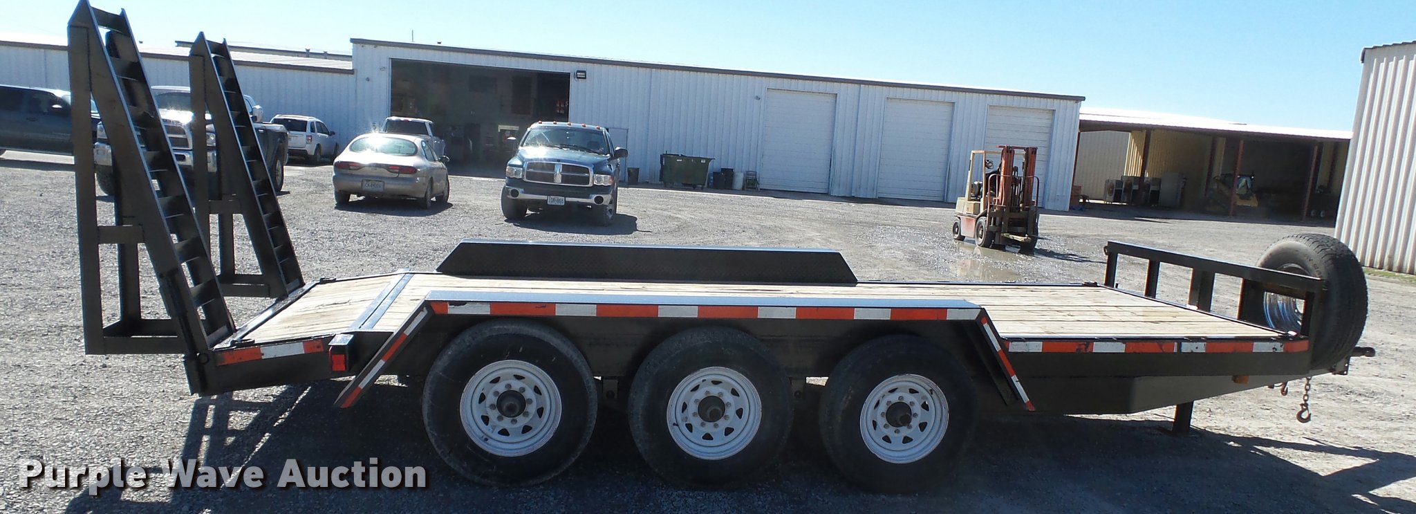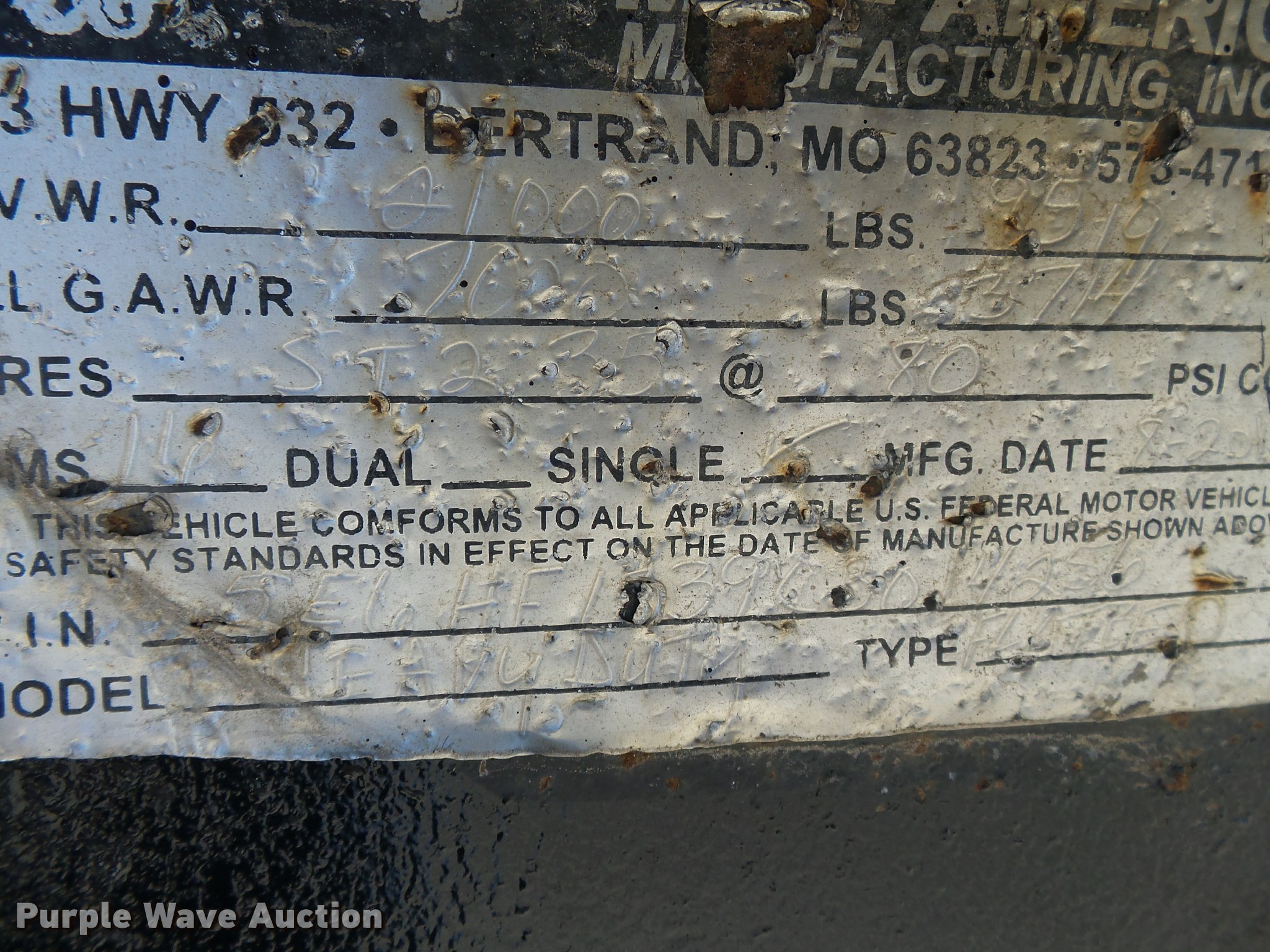 Purple Wave is selling a used Car or Utility Trailer in Missouri. This item is a 2012 Mid-america utility trailer with the following: 16'L x wood deck, 88"W, 2'L dovetail, 5'L ramps, 30" floor height, D-ring tie downs, Stake pockets, 2 5/16" ball hitch, Single leg landing gear, Spring suspension, Electric brakes, Triple axle, Steel wheels, Provider ST235/80R15 tires, GVWR 21,000 lbs