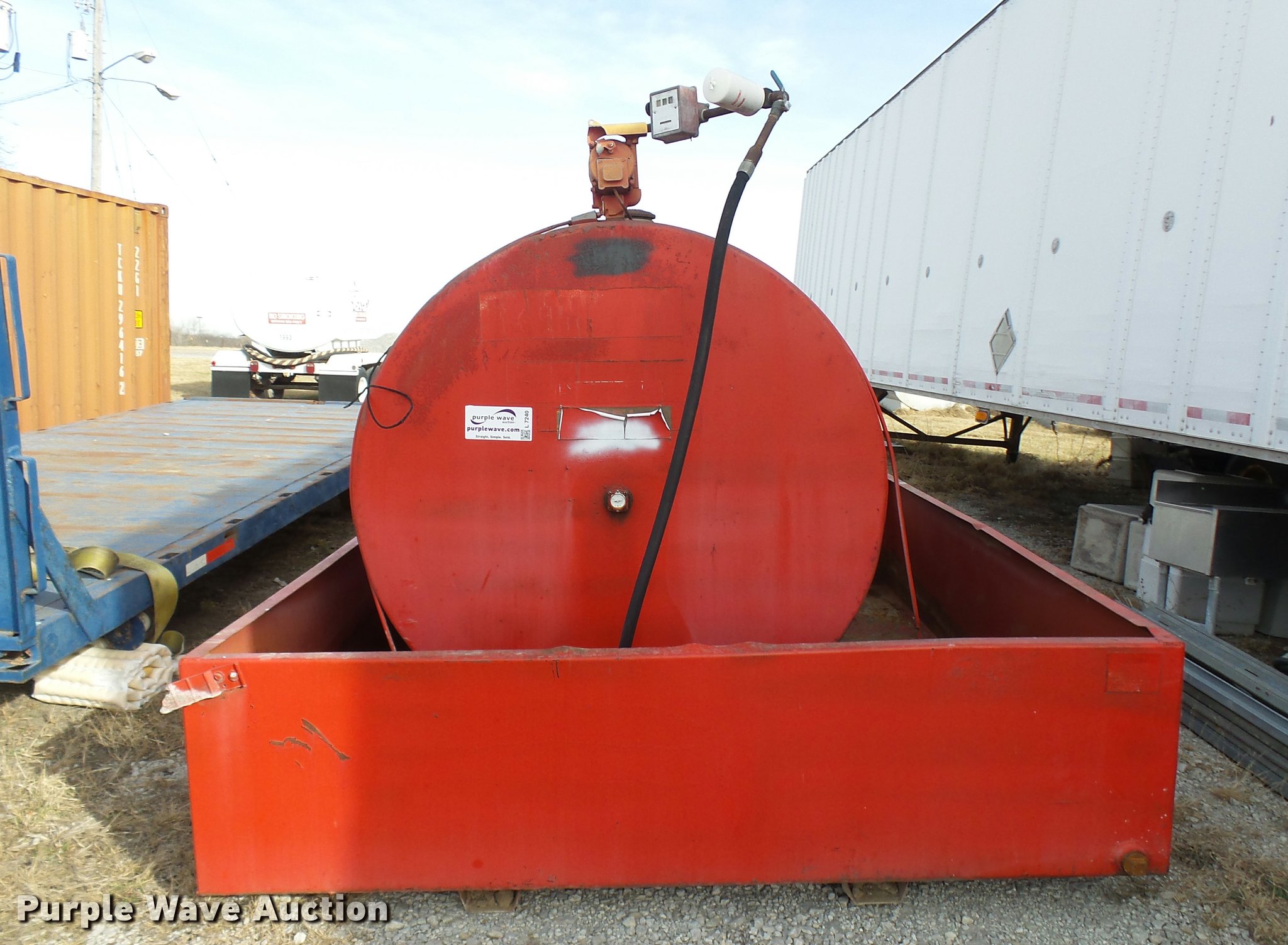 Fuel tank. 74"L x 64" diameter, 1,000 gallon capacity, 110V pump, Steel secondary containment 8' x 9' x 24"H, Emergency vent, Previously held diesel, Last used in 2016. Maher Oil Company. 18808 E 175th St. Pleasant Hill, MO 64080