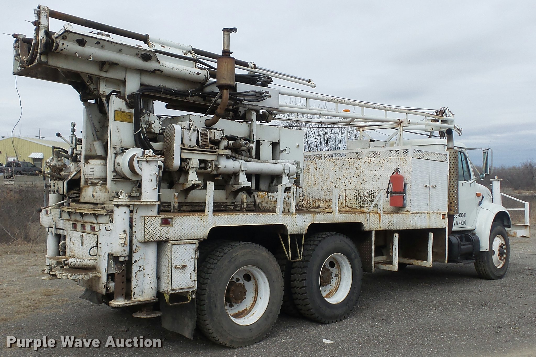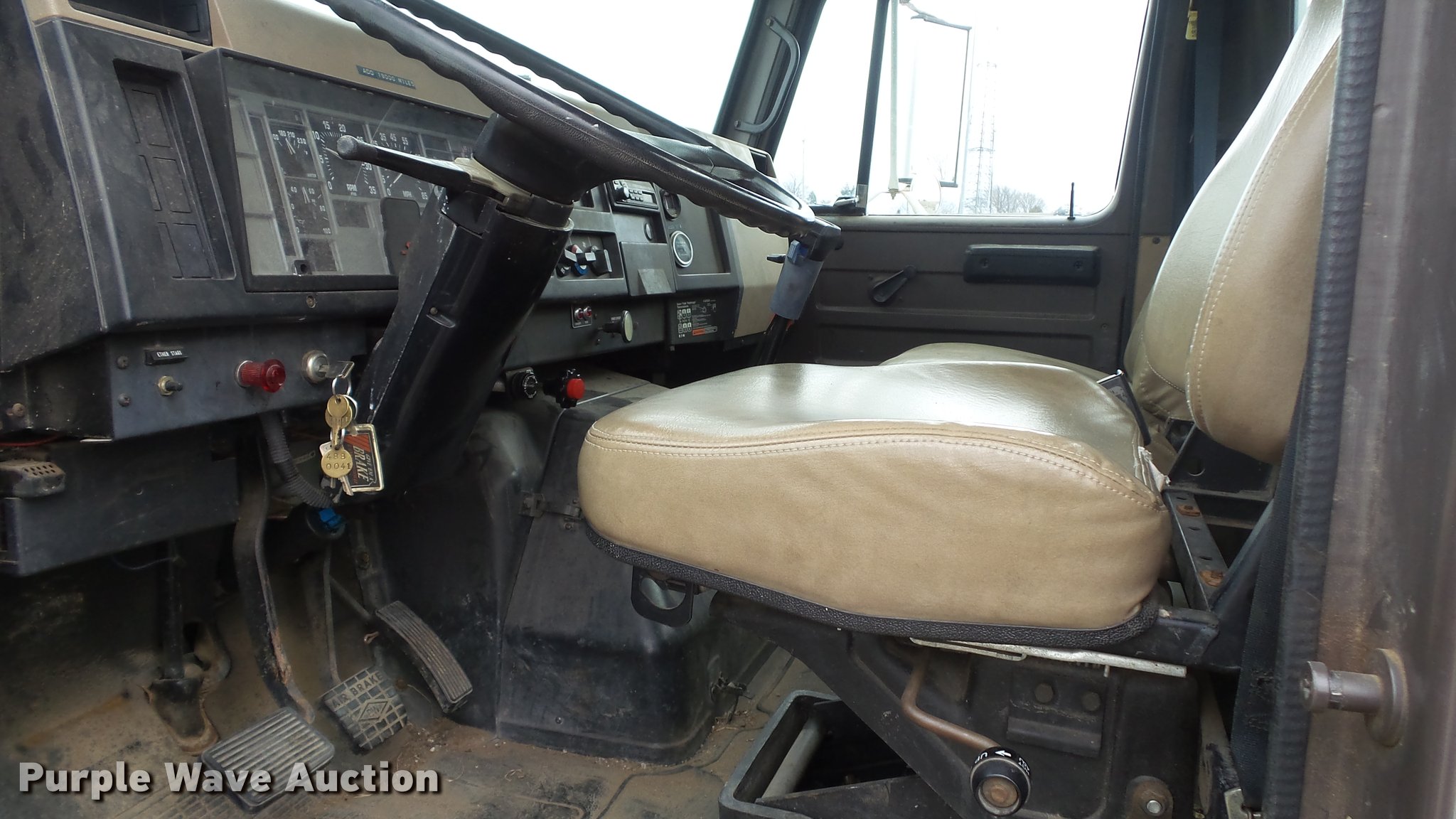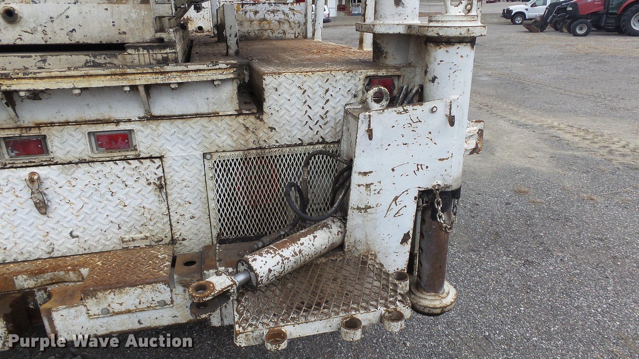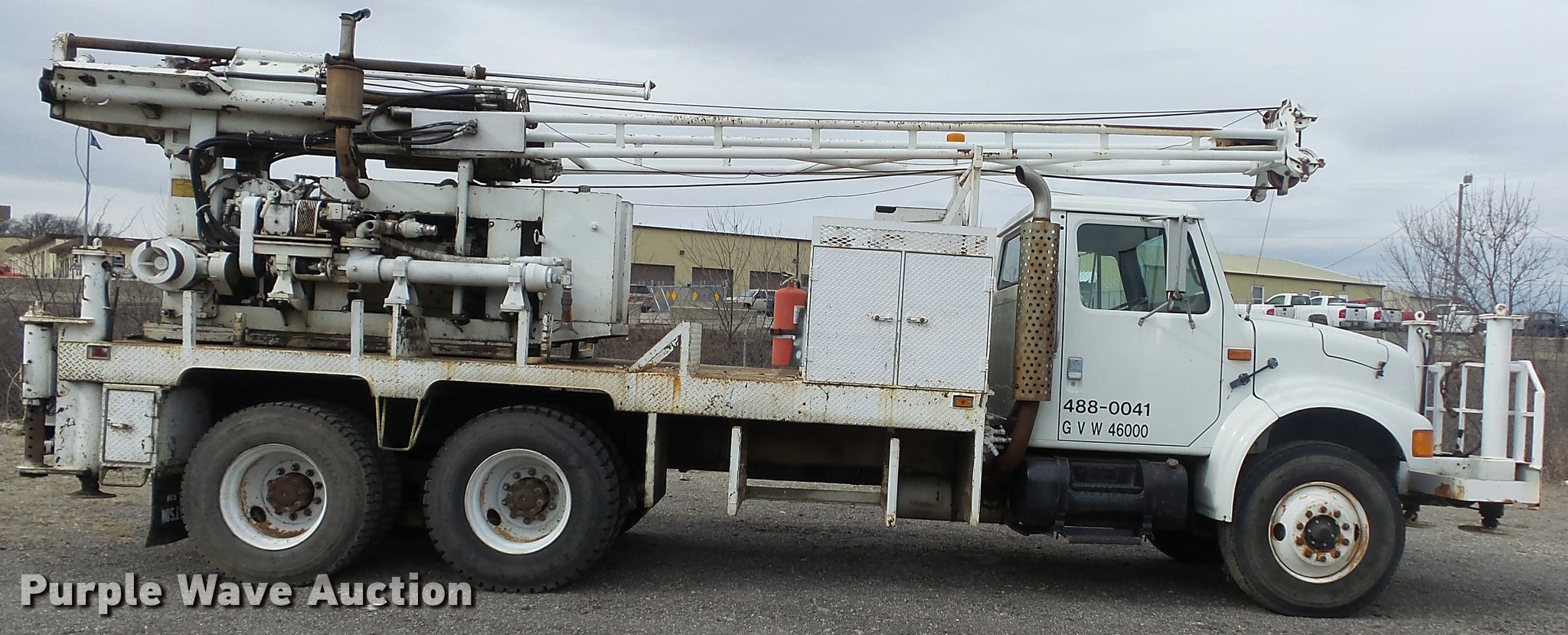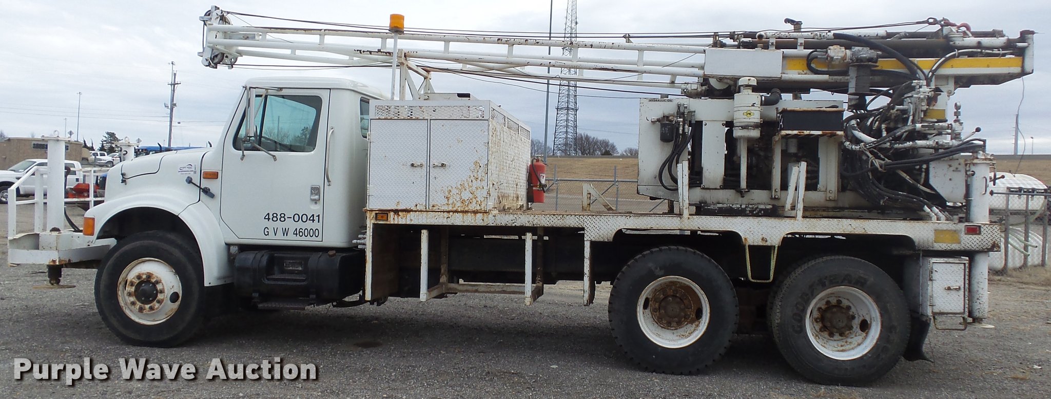 Purple Wave is selling a used Digger Derrick Truck in Kansas. This item is a 1992 International 4900 digger derrick truck with the following: 57,214 miles on odometer, 5,180 hours on meter, International DT466 7.6L L6 turbo diesel engine, 210 HP, Eaton Fuller Road Ranger eight speed manual transmission, Tandem axle, Differential lock, Heat, AM/FM/weatherband, Air suspension seat, Block heater, 17'L service bed, CME Bullmaster H8-4-30-1 hoist and dolly, Cummins six cylinder diesel engine, 120 HP, 3,136 hours on meter, Front and rear outriggers, No augers or rods, Ramsey 800 winch, 20,000 lbs capacity, Serial 595199, Front tow hooks, Beacon light, Dual fuel tanks, Spring suspension, Air brakes, Goodyear 11R22.5 tires, Possible cylinder head gasket leak on rear engine, KDOT ID 488-0041