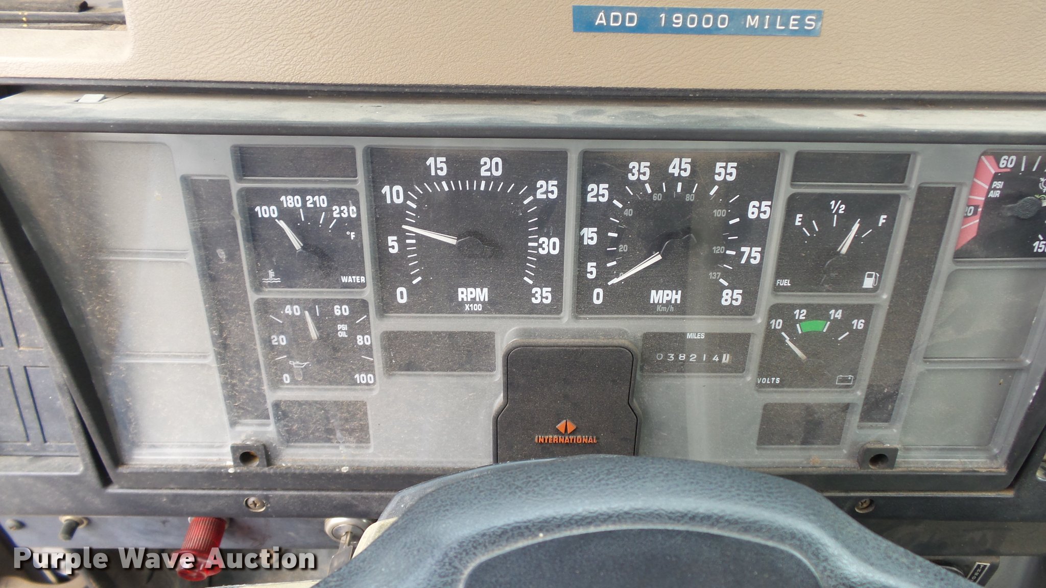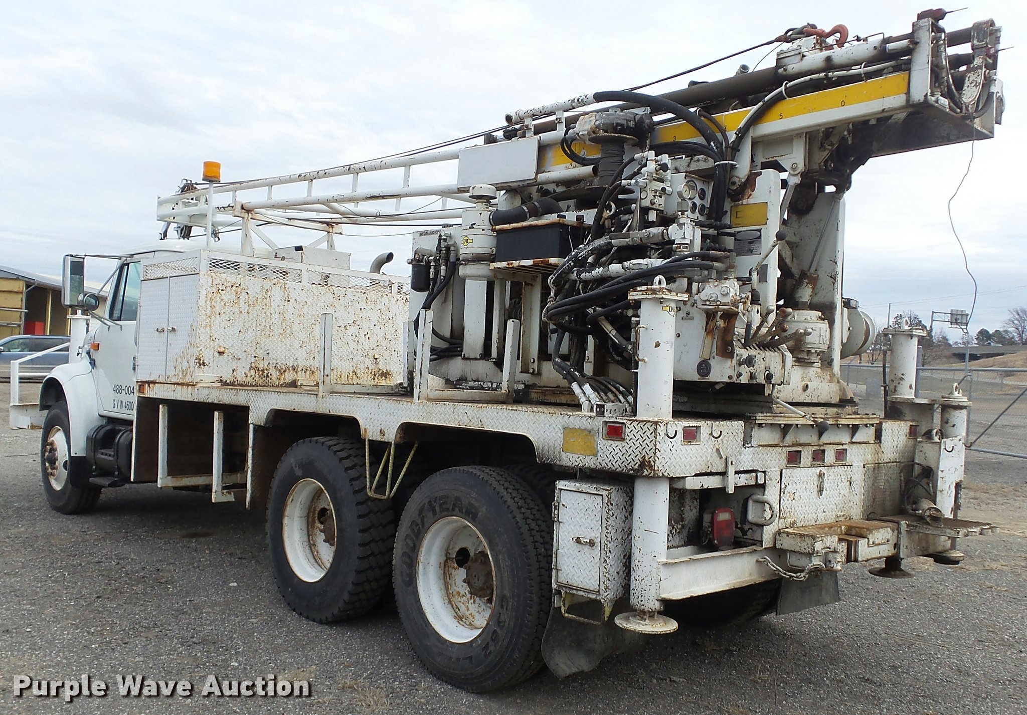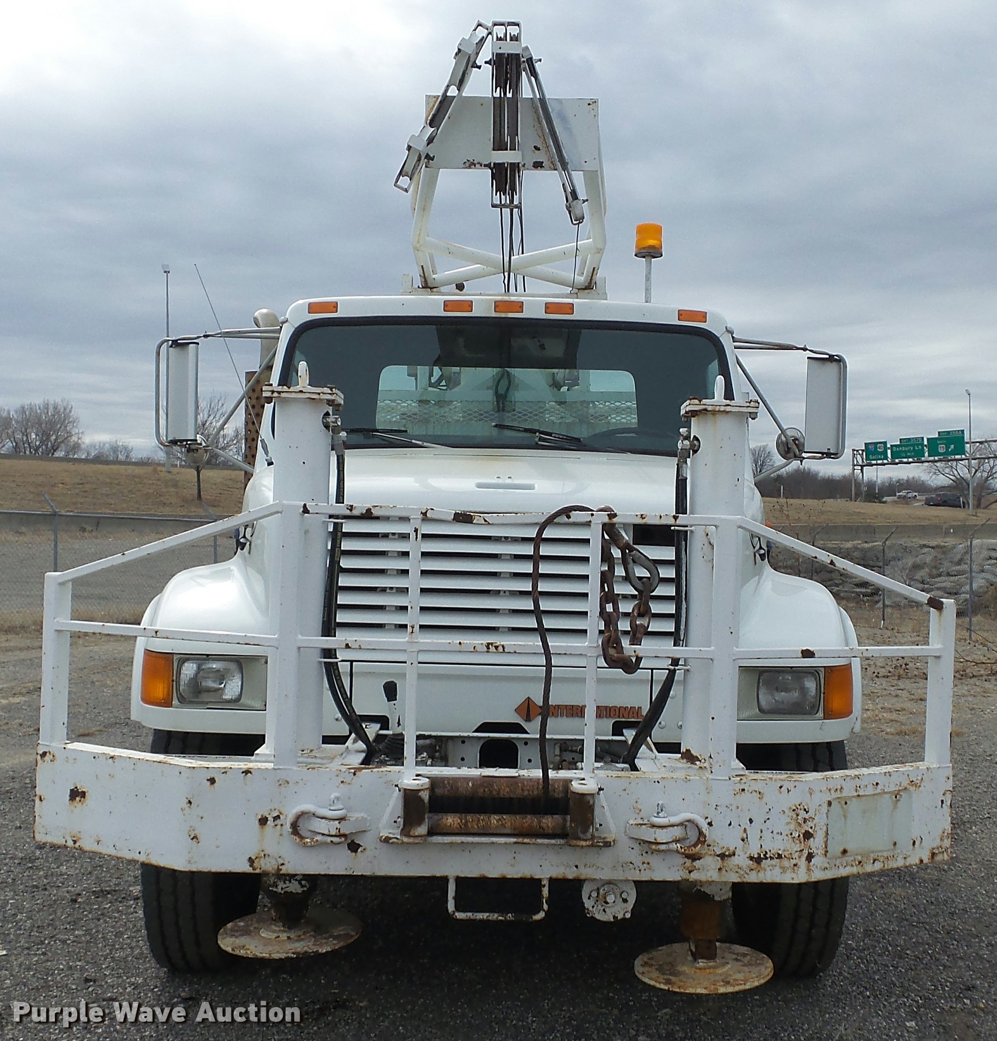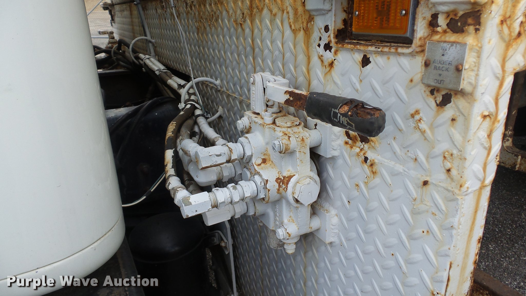 Purple Wave is selling a used Digger Derrick Truck in Kansas. This item is a 1992 International 4900 digger derrick truck with the following: 57,214 miles on odometer, 5,180 hours on meter, International DT466 7.6L L6 turbo diesel engine, 210 HP, Eaton Fuller Road Ranger eight speed manual transmission, Tandem axle, Differential lock, Heat, AM/FM/weatherband, Air suspension seat, Block heater, 17'L service bed, CME Bullmaster H8-4-30-1 hoist and dolly, Cummins six cylinder diesel engine, 120 HP, 3,136 hours on meter, Front and rear outriggers, No augers or rods, Ramsey 800 winch, 20,000 lbs capacity, Serial 595199, Front tow hooks, Beacon light, Dual fuel tanks, Spring suspension, Air brakes, Goodyear 11R22.5 tires, Possible cylinder head gasket leak on rear engine, KDOT ID 488-0041