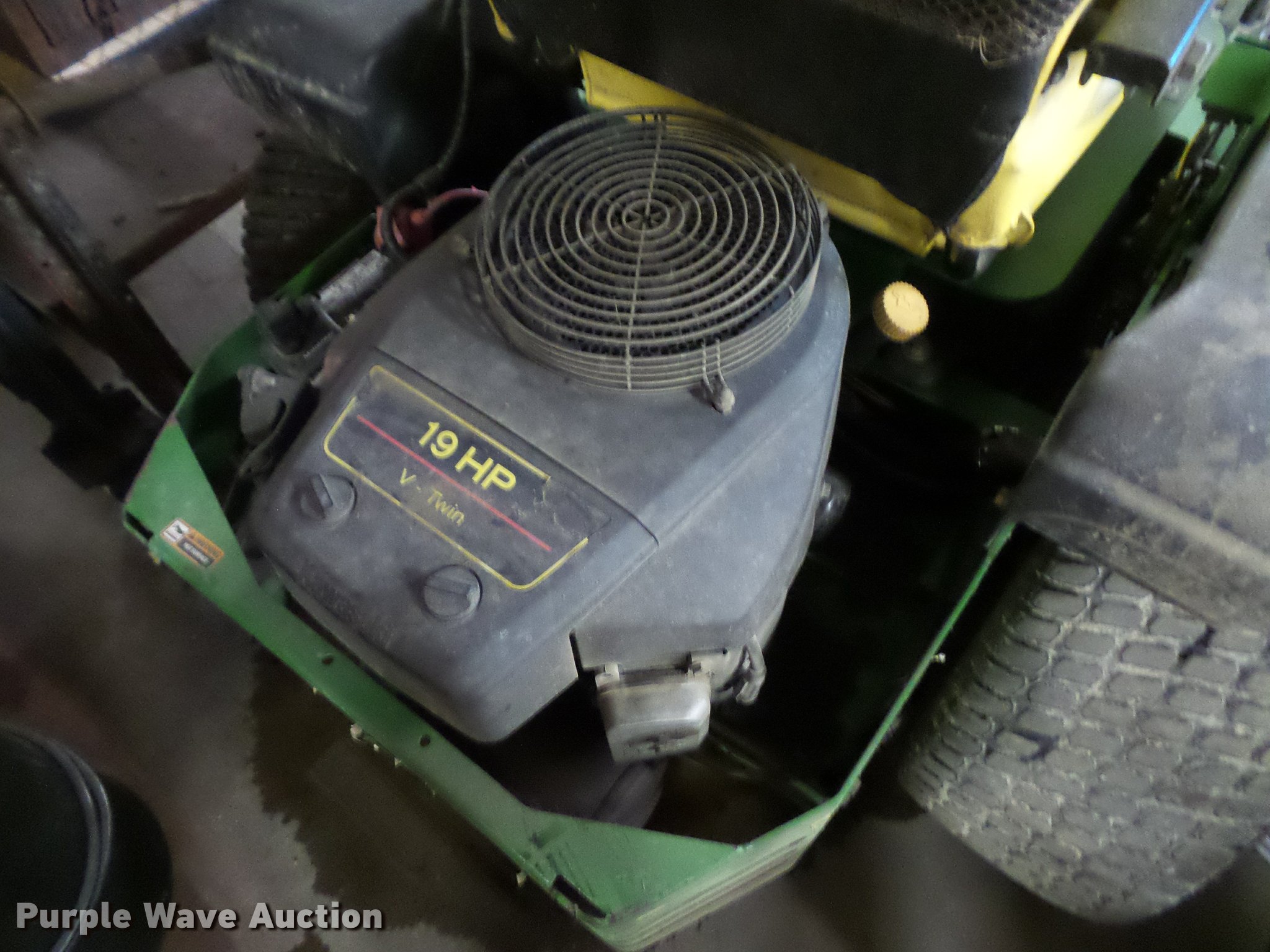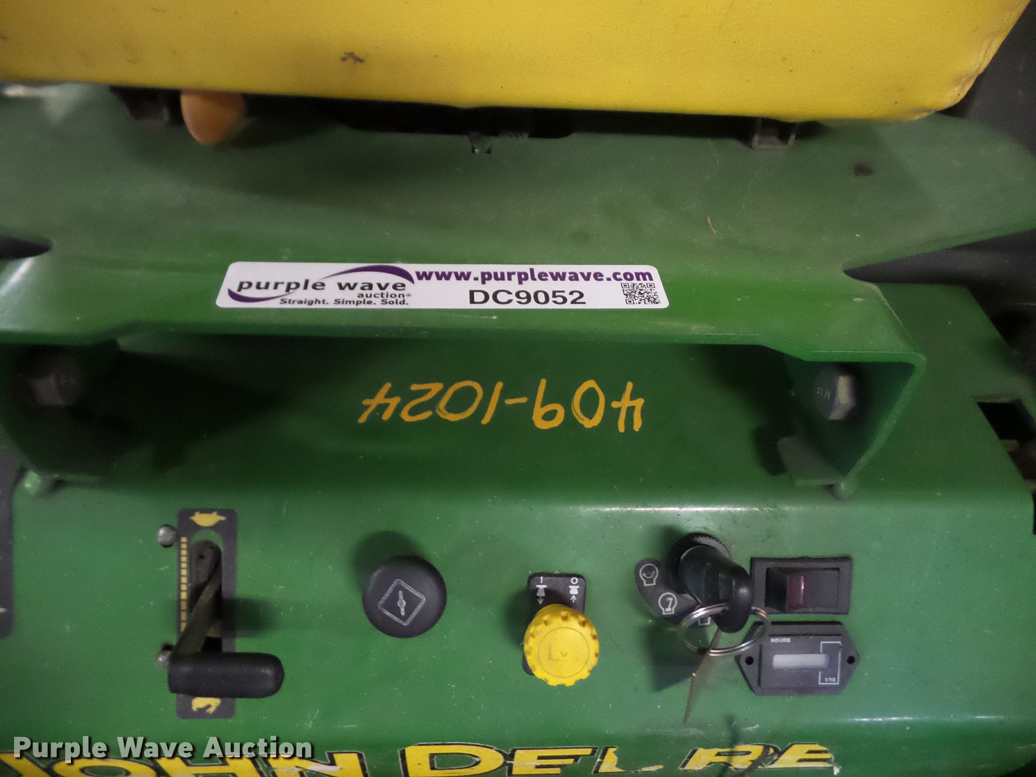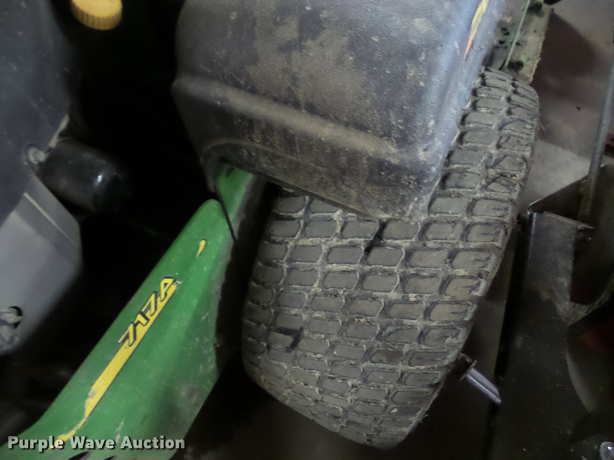 Purple Wave is selling a used Lawn Mower in Kansas. This item is a 2004 John Deere 717A lawn mower with the following: 1,353 hours on meter, 48"W deck, Kawasaki gas engine, 19 HP, 23 x 9.50-12 tires, Oil leak, Serial TC717AX011107, KDOT ID 409-1024