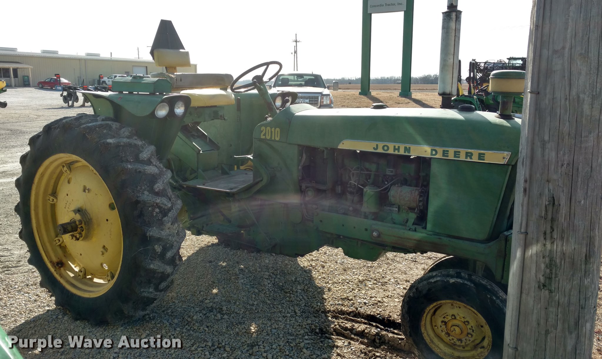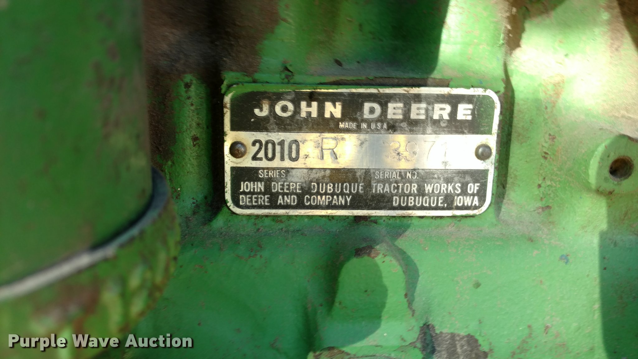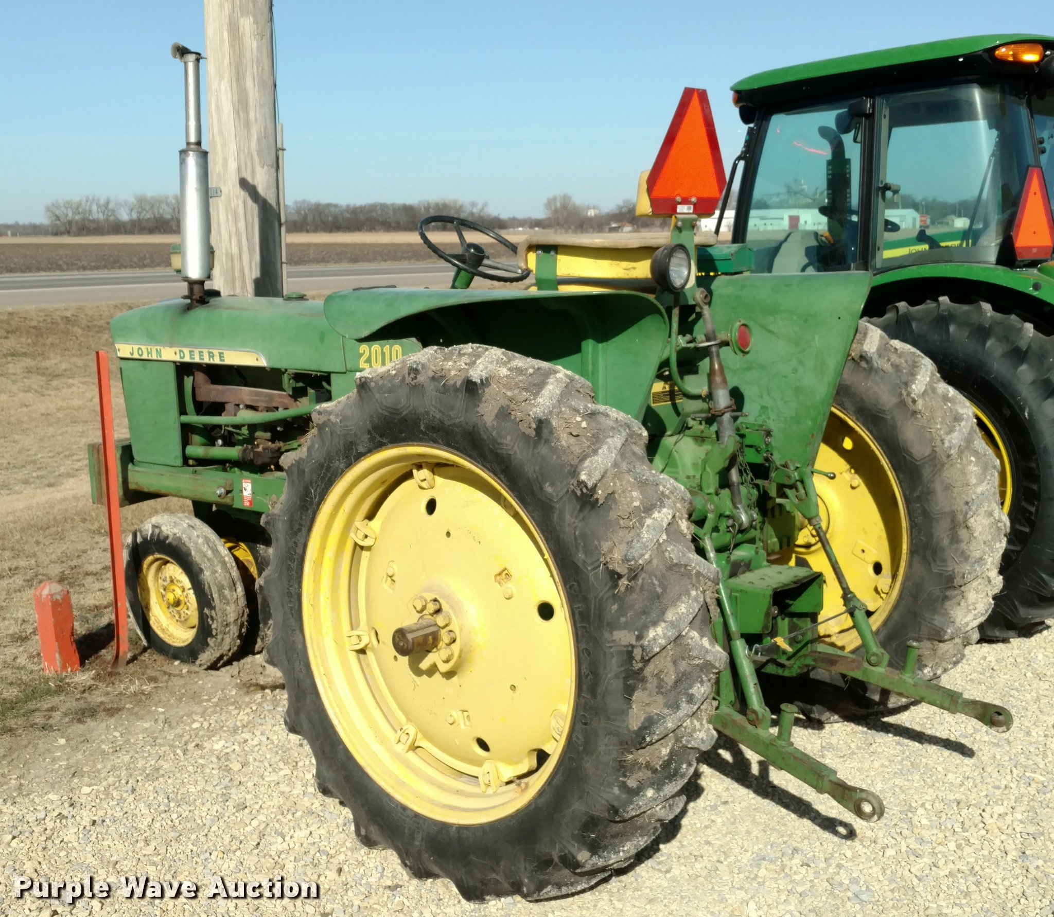 Purple Wave is selling a used Tractor in Kansas. This item is a John Deere 2010 tractor with the following: 4,391 hours on meter, John Deere four cylinder gas engine, Synchro transmission, 8F-3R gears, Three point, 540 PTO, Rear hydraulic remote, 6.00-14 front tires, 13.9-36 rear tires, Serial 2010R3971